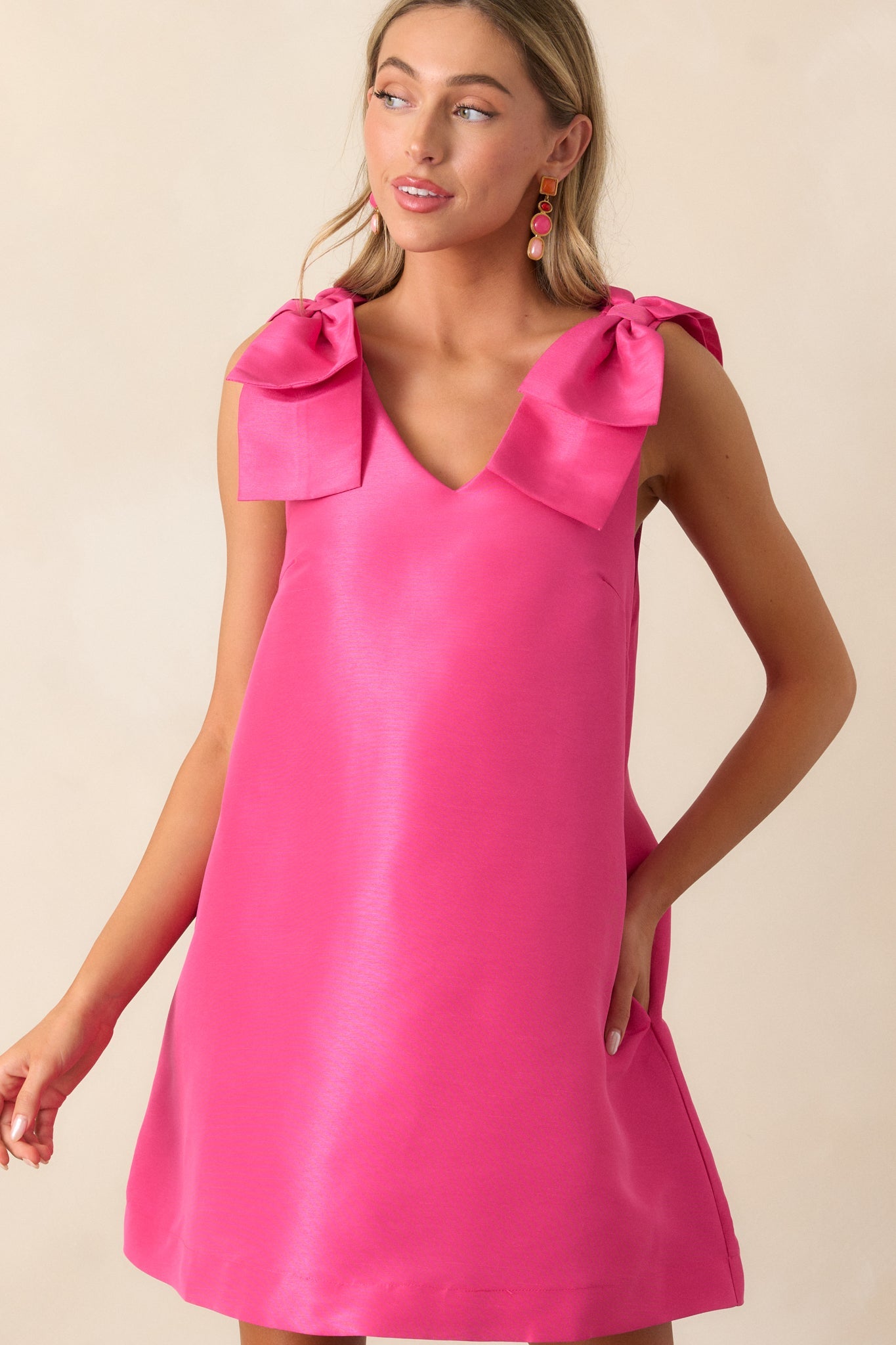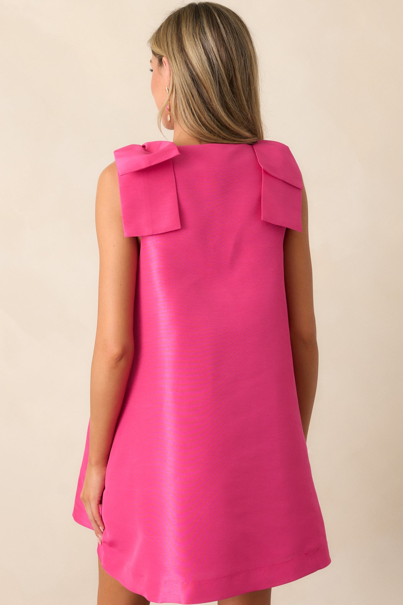 This How Can It Be dress is perfect for any occasion. Its vibrant fuchsia color and sleeveless design make it a stylish and comfortable choice. Whether you're headed to a party or a casual day out, this dress will keep you looking and feeling your best. Embrace its versatility and add it to your wardrobe today. This fuchsia mini dress features a v-neckline, a relaxed shift design, and bow detailing on both shoulders.