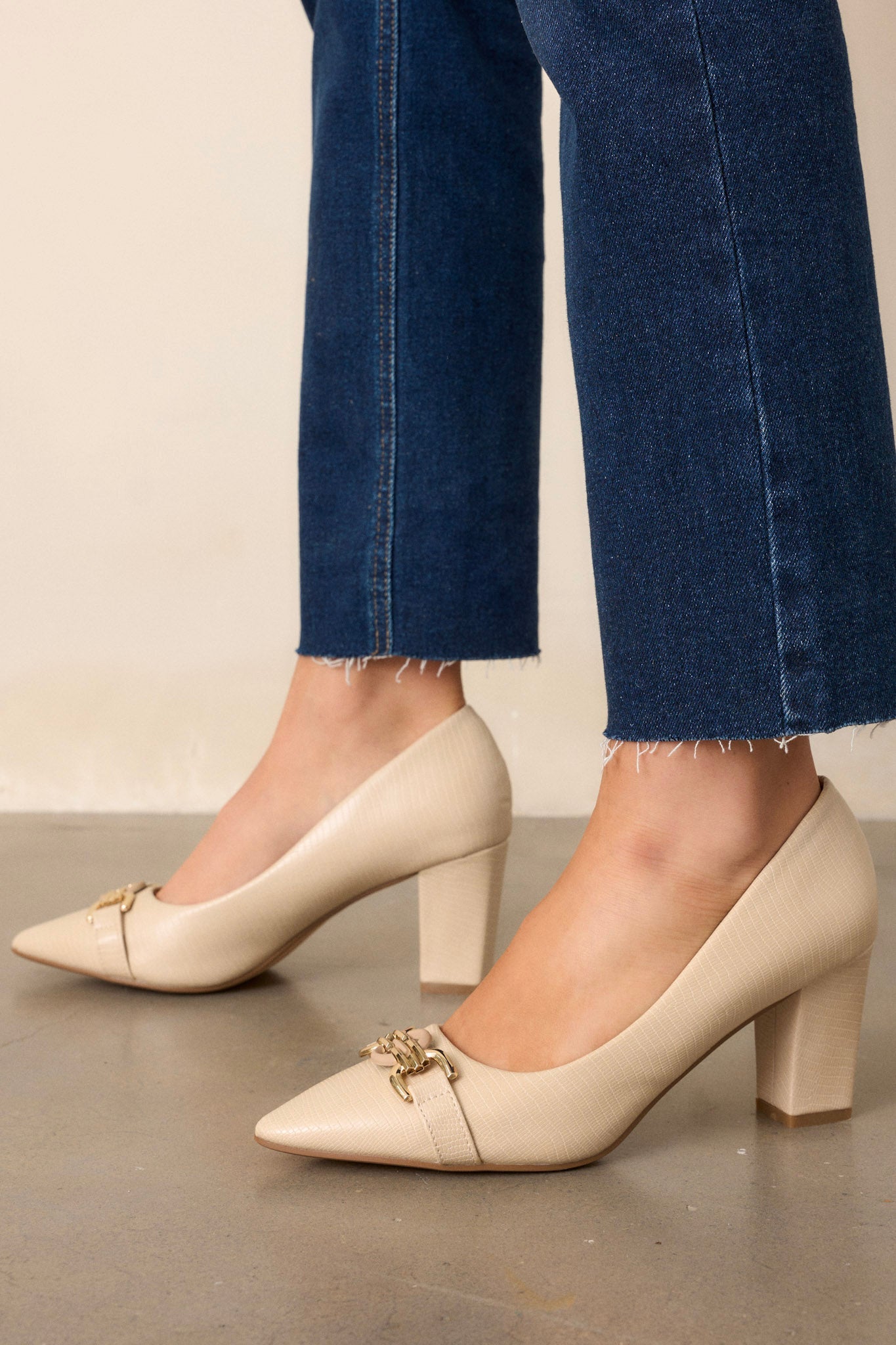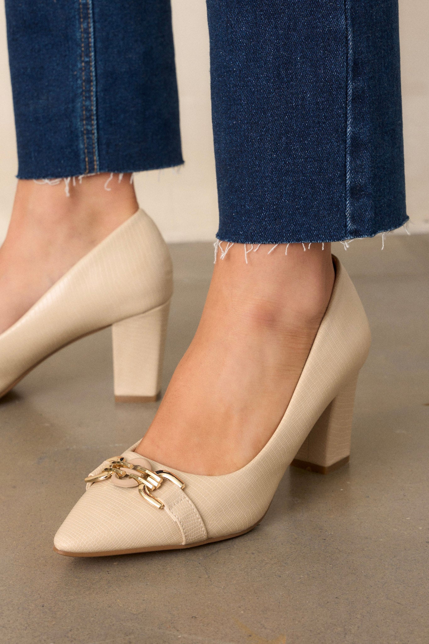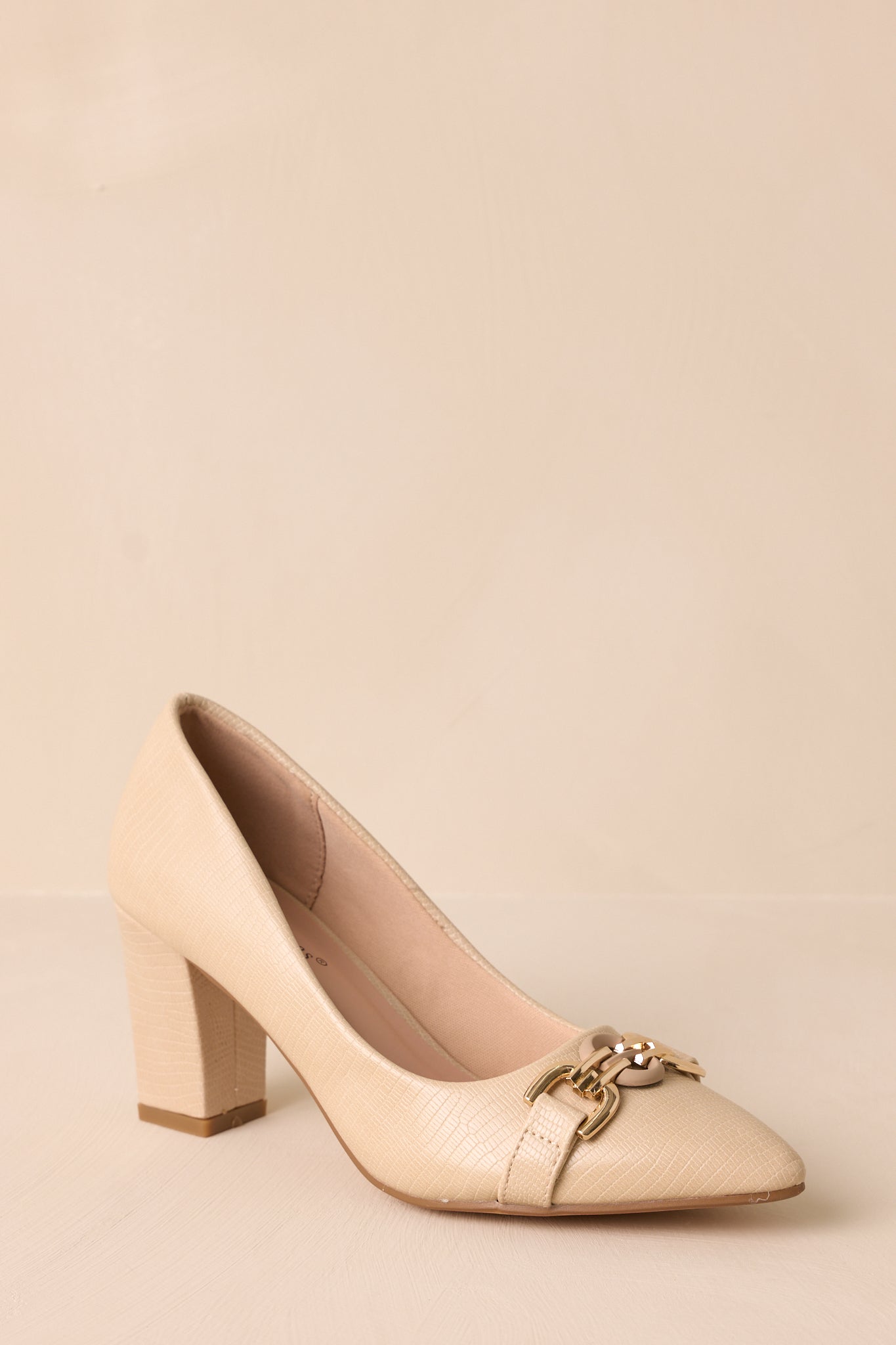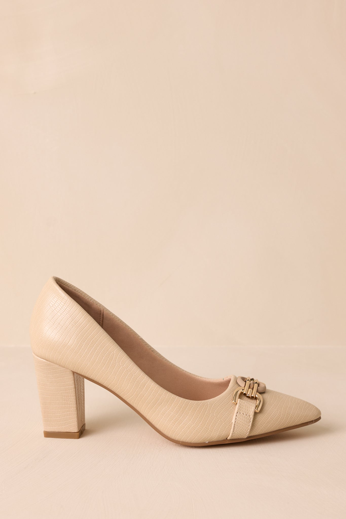 Elevate your style with our How It Went Chunky Heel. This elegant heel is designed with a timeless beige color that exudes sophistication. Walk with confidence, thanks to the chunky heel that provides both stability and style. Elevate any outfit with this luxurious addition to your shoe collection. These heels feature a crocodile pattern, chunky heel and gold buckle hardware on the pointed toe.