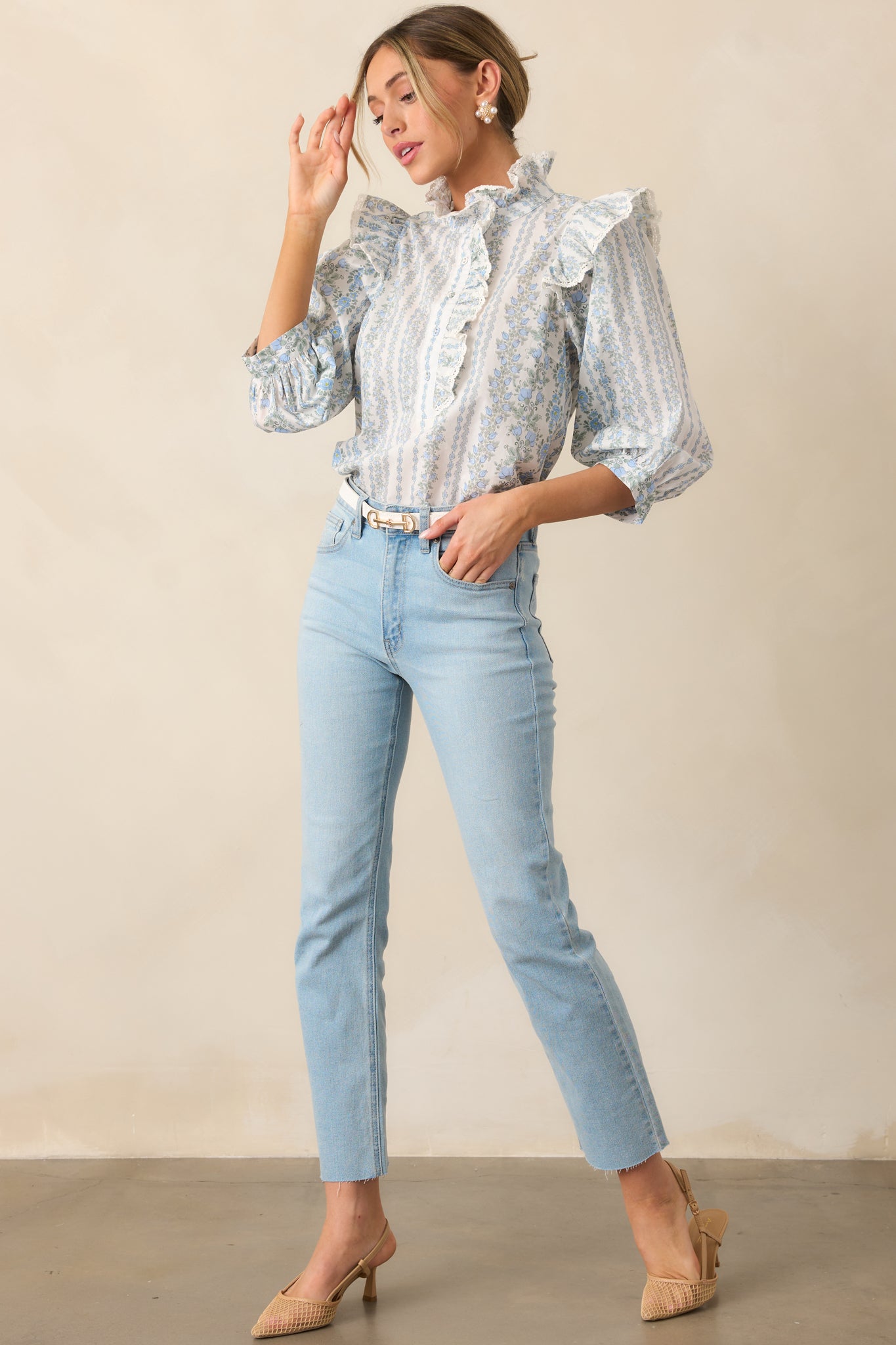 Introducing the perfect addition to your wardrobe - Hummingbird's Haven Flutter Sleeve Blouse! Made with soft cotton, this blouse features delicate flutter sleeves, creating a flattering silhouette. Perfect for any occasion, its versatile style will keep you comfortable and stylish. This blue blouse features a ruffle collar neckline with button front detailing, relaxed fit, floral design, and 3/4 sleeves with flutter detail.