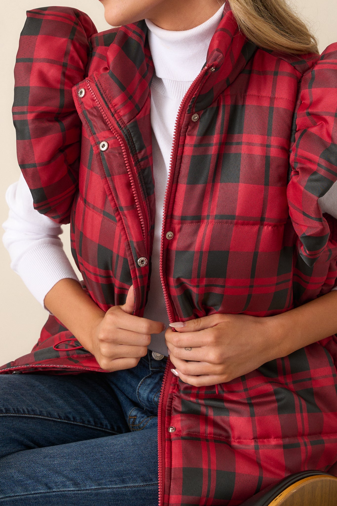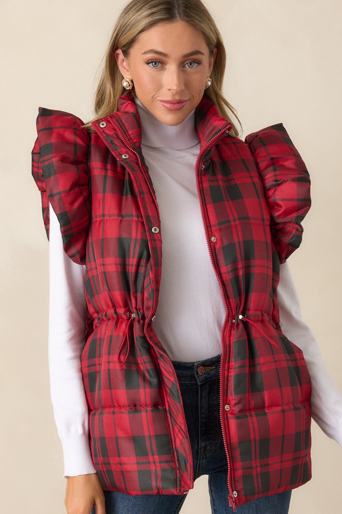 Find warmth and style in our I Found You Red Plaid Flutter Sleeve Puffer Vest. With flutter sleeves and a navy plaid pattern, this vest adds a touch of femininity to a classic puffer style. Perfect for layering over any outfit, this vest keeps you cozy and on-trend. This red puffer vest features a collared neckline, plaid pattern, puffer line detailing, functional snap button and zipper closures, drawstring cinch waist detailing with silver hardware, functional hip pockets and a flutter sleeve.