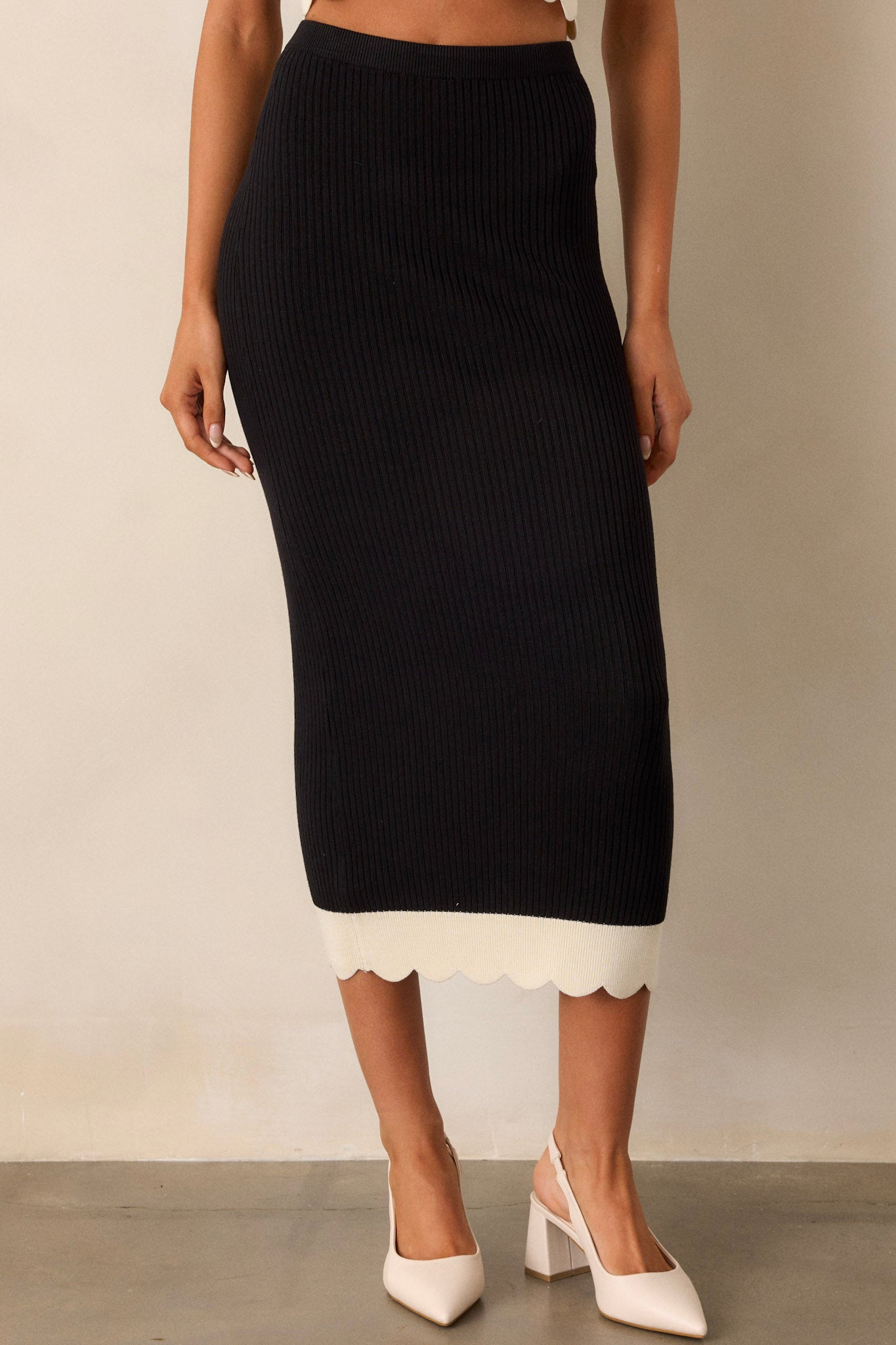 Experience the sleek and sophisticated look of our I Have A Feeling Black Ribbed Scallop Hem Midi Skirt. This versatile black midi skirt will elevate any outfit with its classic design. Dress it up or down, this must-have piece will be a staple in your wardrobe. This black midi skirt features an elastic waistband, a bodycon fit, ribbed fabric, and an ivory scallop bottom hem.