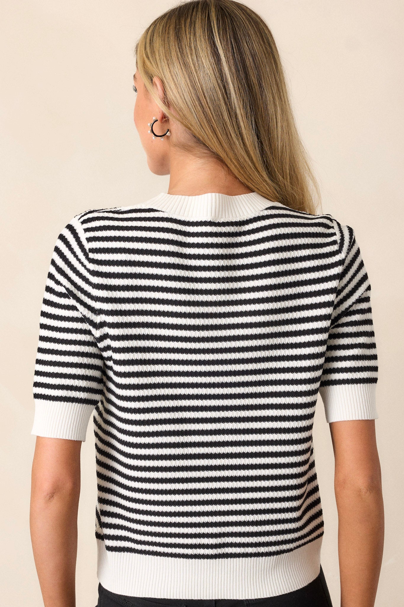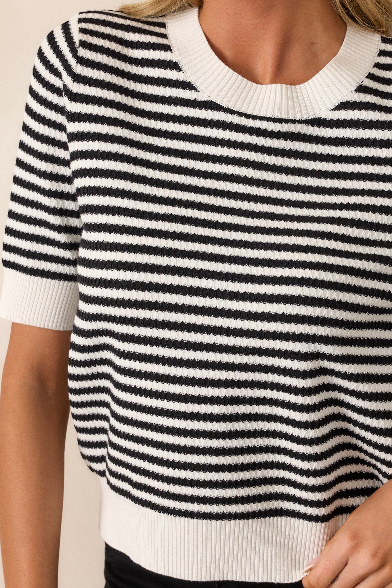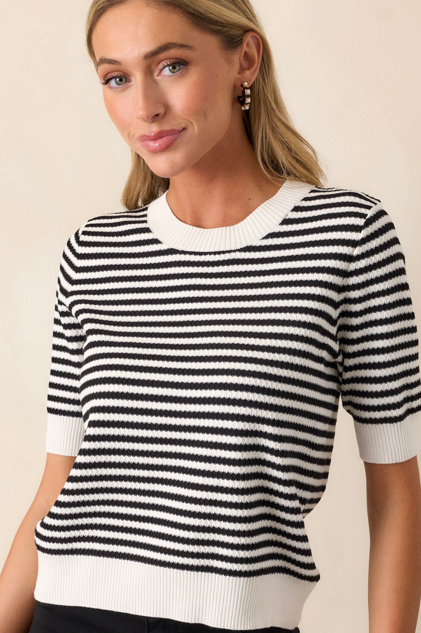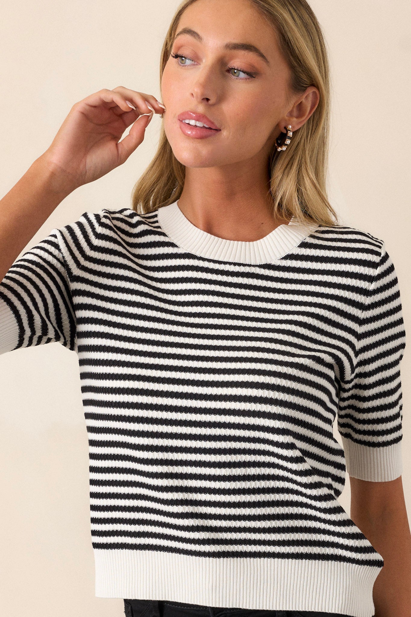 Stay stylish and comfortable in our I'm Okay With That Black Stripe Short Sleeve Knit Top. With its classic stripe design and short sleeves, you'll look effortlessly put-together. The perfect addition to any wardrobe, this top is versatile and easy to wear for any occasion. This black and white top features a stripe pattern, a ribbed crew neckline, short sleeves, a ribbed hem, and a cozy knit fabric.
