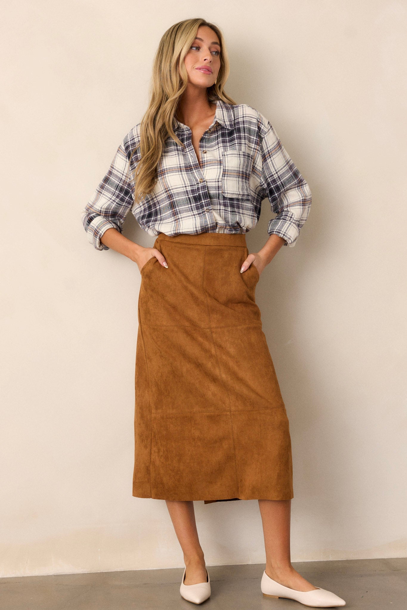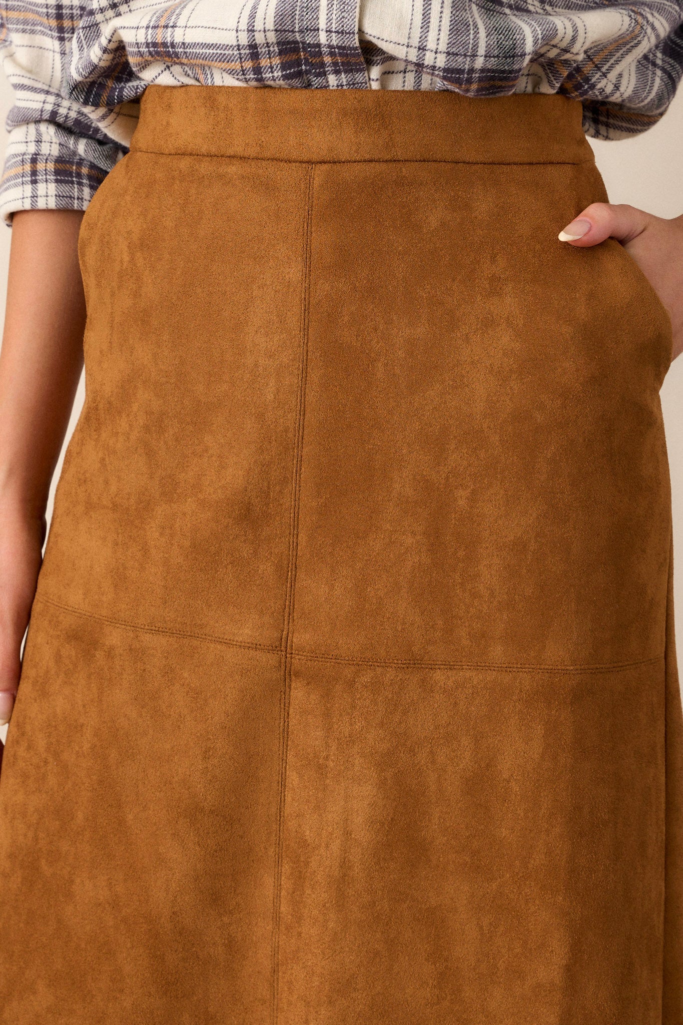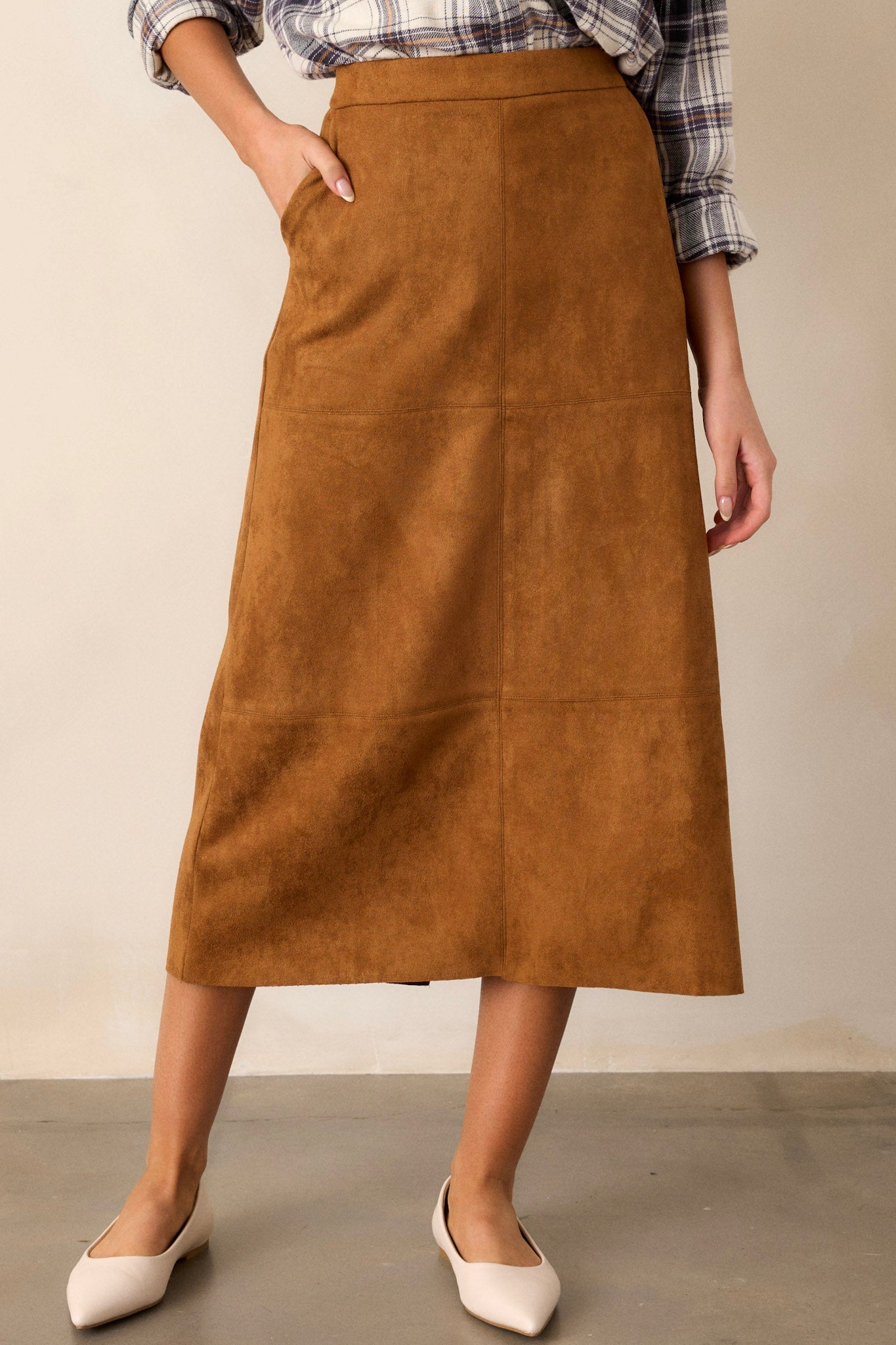 Slip into a statement piece with our I'm Telling You Caramel Brown Faux Suede Midi Skirt. The soft, faux suede material adds a touch of luxury, while the midi length is perfect for a stylish and sophisticated look. You'll be turning heads and making a bold statement wherever you go. This midi skirt features a caramel brown faux suede material, an A-line silhouette, functional pockets, and a small slit up the back of the skirt.