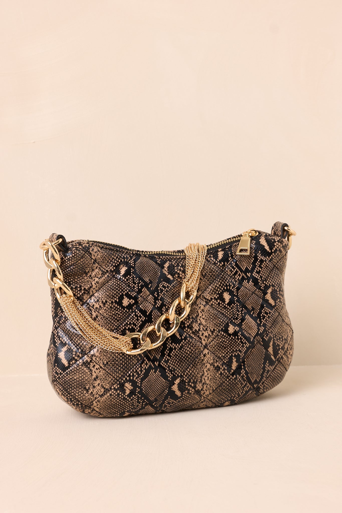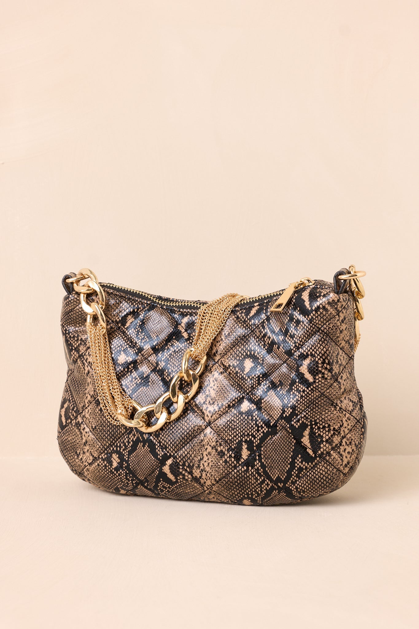 Elevate your outfit with the I'm Yours Tonight Snakeskin Quilted Handbag. Its unique snakeskin design adds a touch of edge to any look. With multiple compartments and a spacious interior, this bag is both stylish and practical. Perfect for a night out or a day at the office, it's the must-have accessory for any fashion-forward individual. This snakeskin bag features a faux leather material, a quilted design, a thick gold chain, a gold zipper closure, an optional thin gold chain shoulder strap and a built-in zipper pocket.