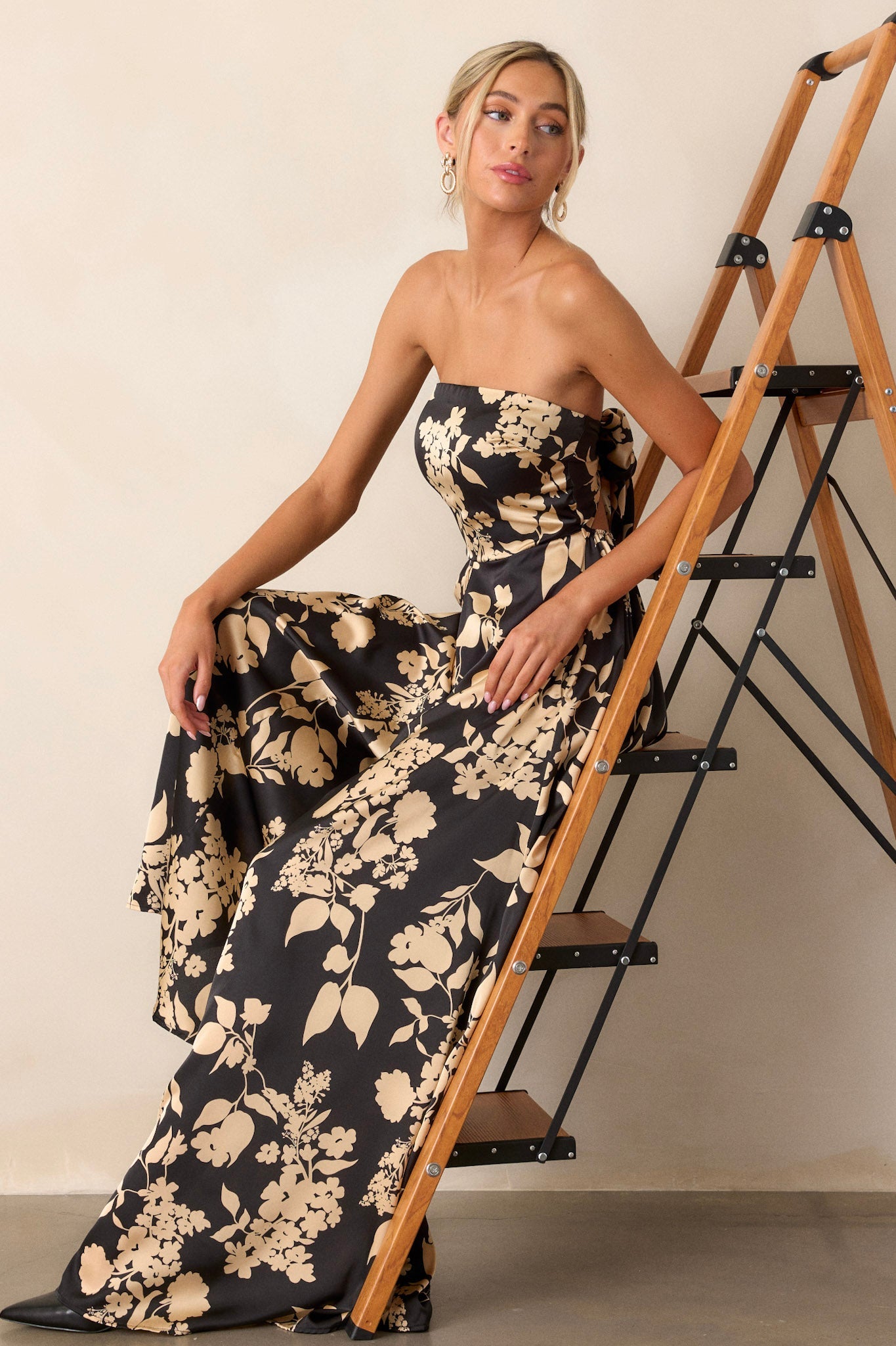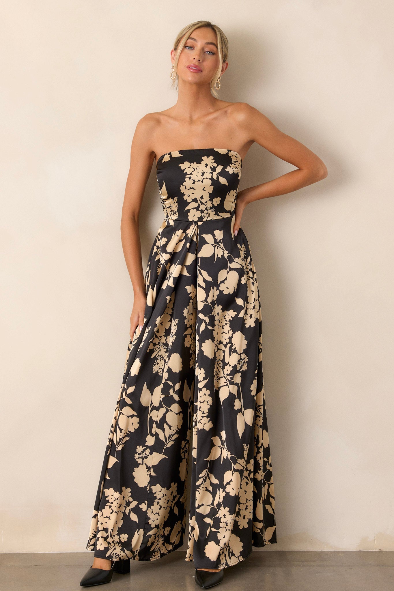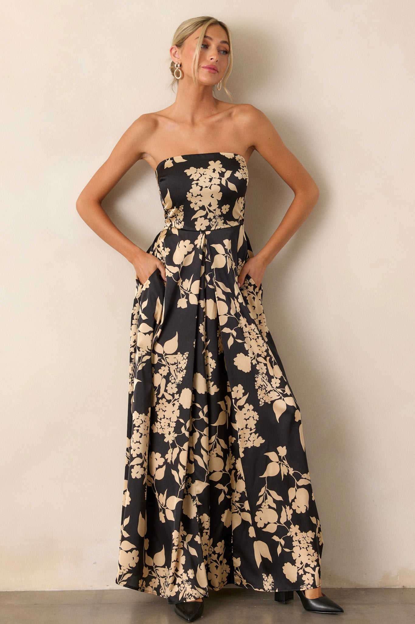 Get ready to turn heads and steal the show in our In The Dark Black Floral Strapless Wide Leg Jumpsuit! Perfect for making a statement at any event, this jumpsuit is a must-have for any fashion-forward individual. This black jumpsuit features a bold black & gold floral design, strapless neckline, functional pockets, and wide leg.
