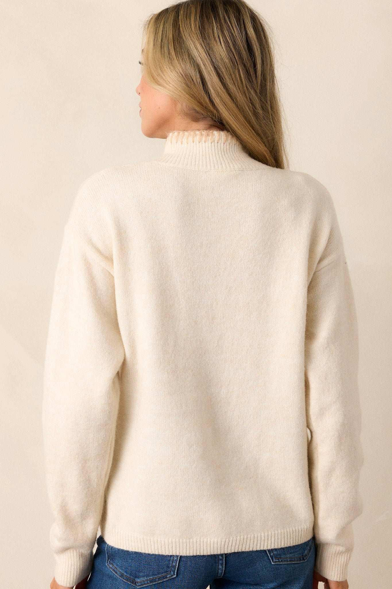 Elevate your wardrobe with our In Your Eyes Ivory Floral Embroidered Mock Neck Sweater! Featuring a stylish mock neck design, this sweater adds a touch of sophistication to any outfit. Stay cozy and on-trend with this versatile piece. This ivory sweater features a ribbed mock neckline, embroidered blanket stitch detailing, long sleeves with ribbed cuffs, and a ribbed bottom hem.