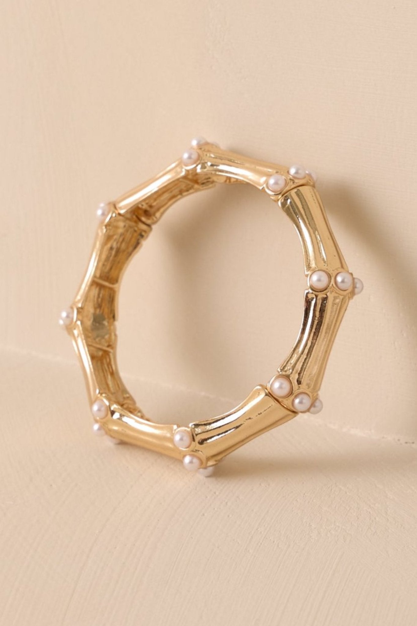 Indulge in Infinite Grace with our beautiful gold and pearl bracelet. The perfect mix of elegance and playfulness, it adds a touch of sophistication to any outfit. Make a statement with this one-of-a-kind piece. This gold bracelet features textured material, faux pearls, and elastic bands underneath to accommodate for as needed stretch.