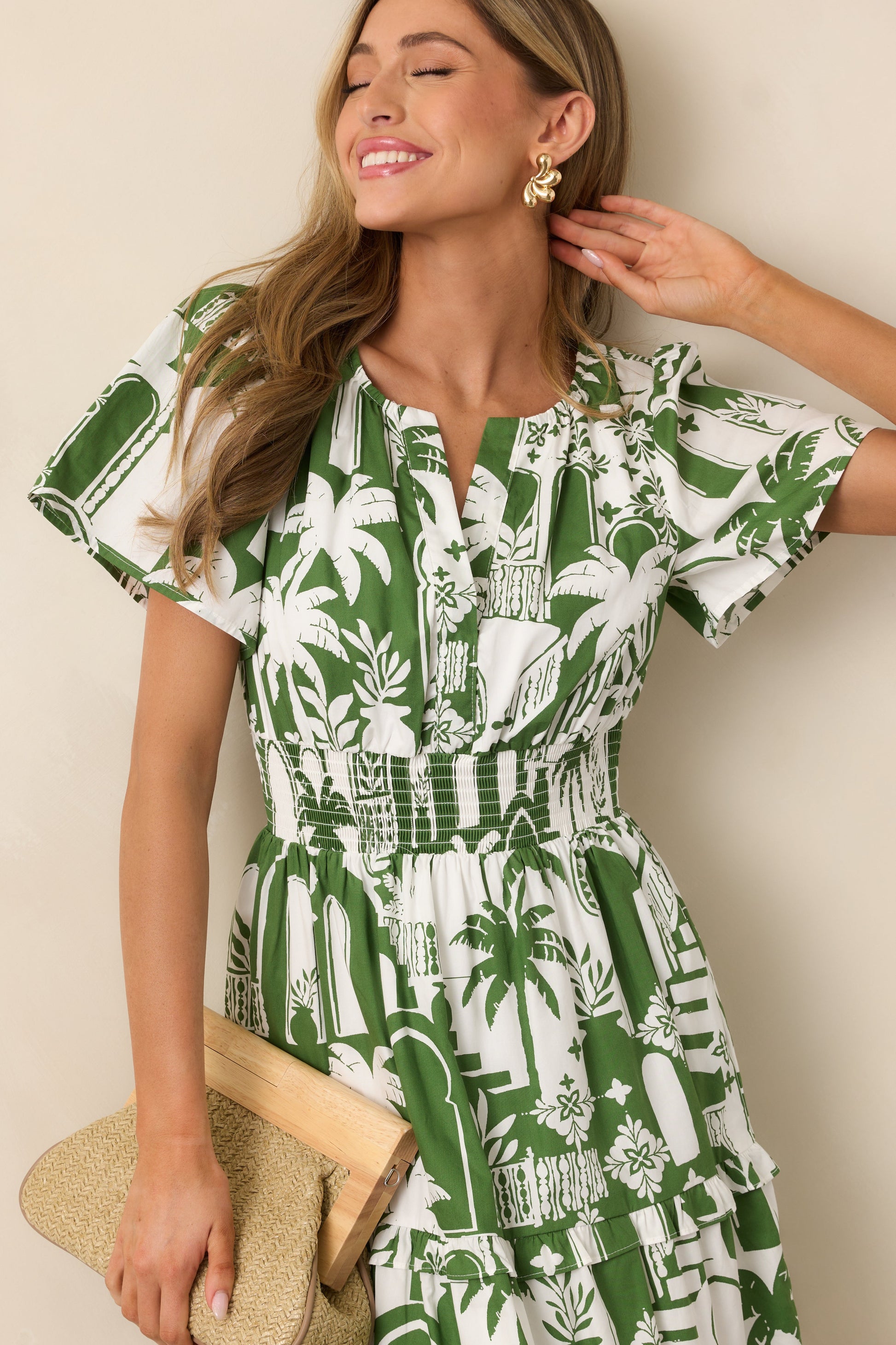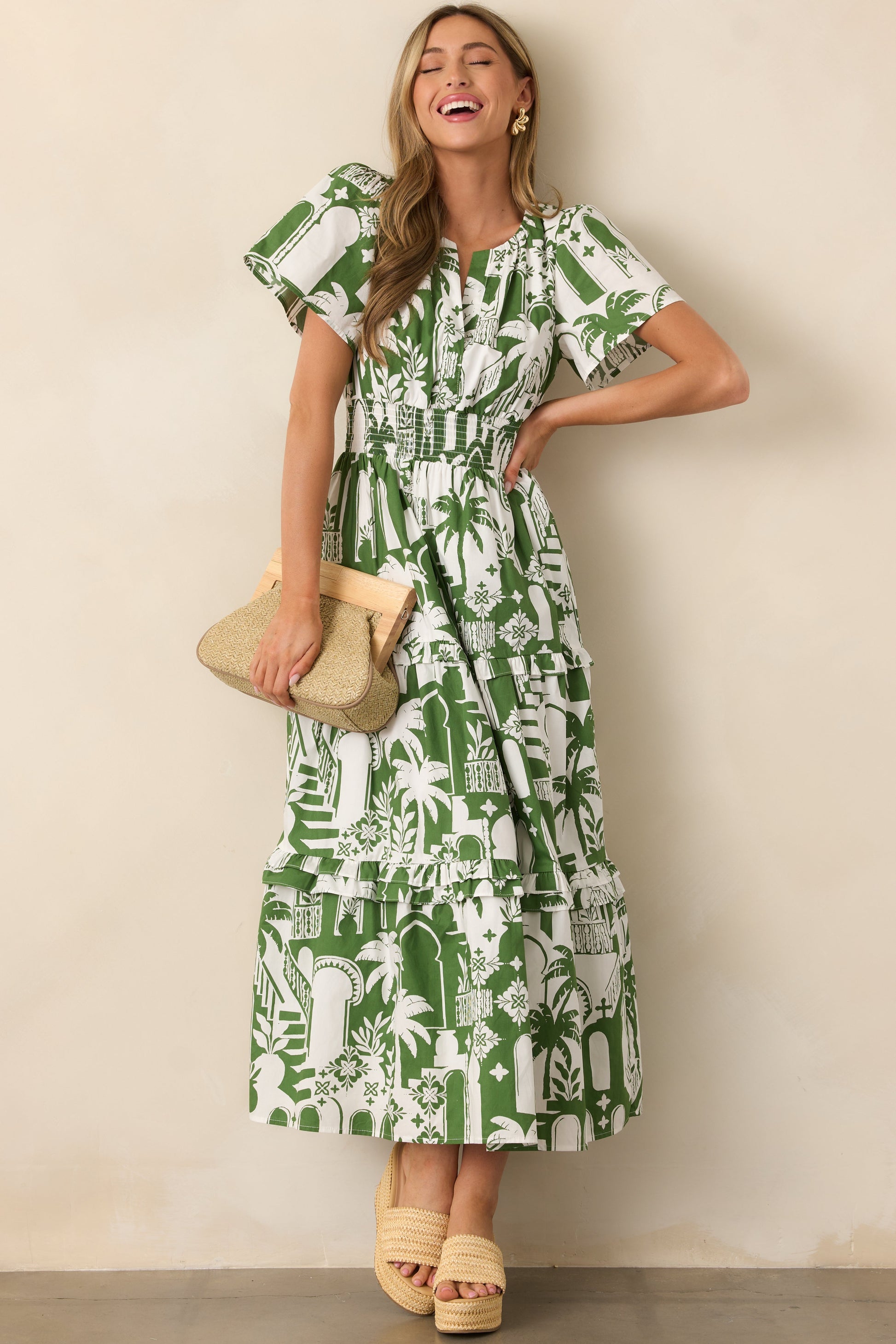 Get ready to shine like the sun with our Island Glow Green Tropical Palm Print Maxi Dress. The vibrant colors and fun palm print will transport you to a tropical paradise, while the maxi length keeps you looking stylish and comfortable. Perfect for any occasion, this dress will make you the life of the party! This green dress features a split v-neckline, a smocked waist, relaxed tiered skirt, a tropical palm print, and short sleeves.