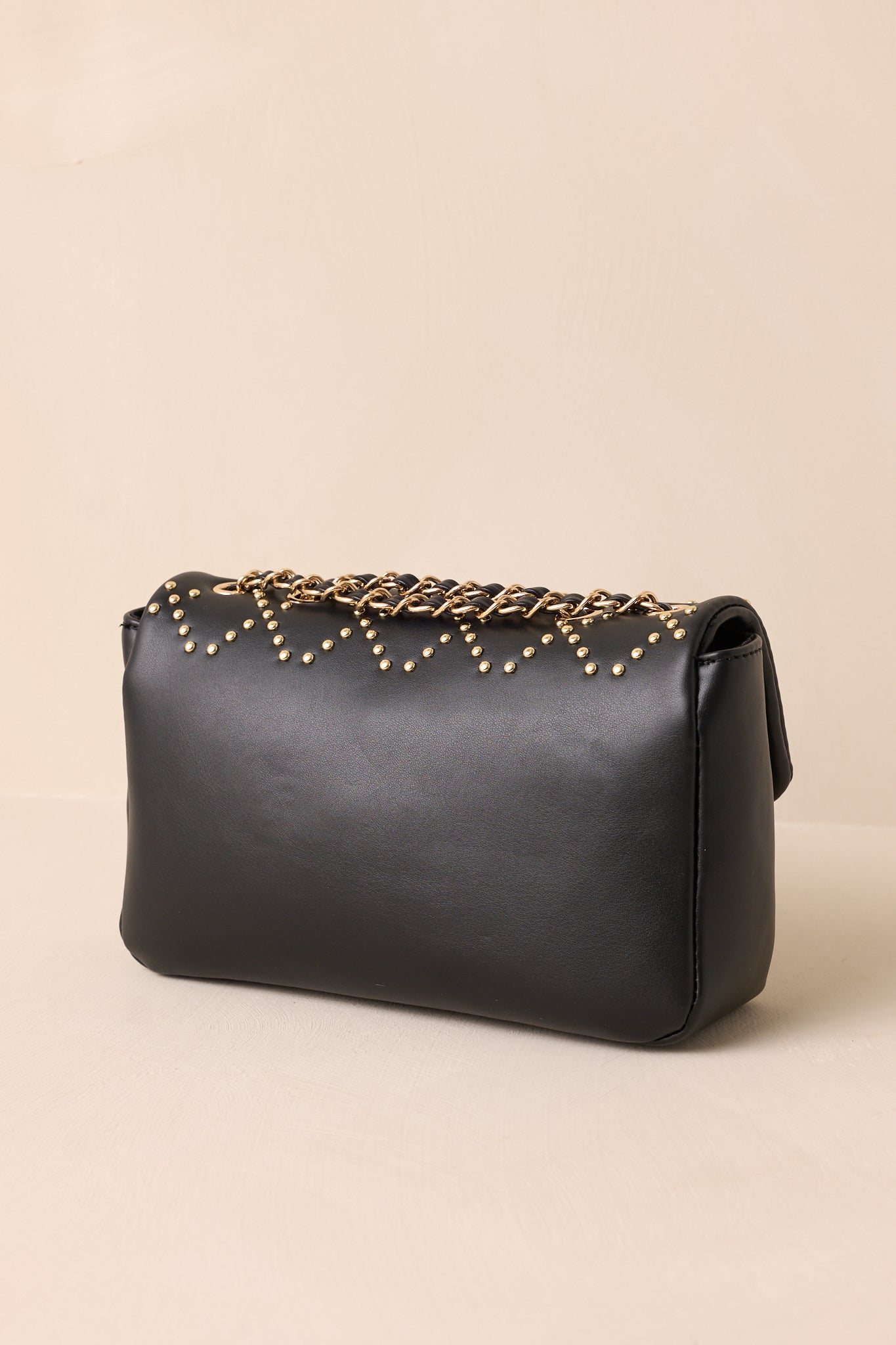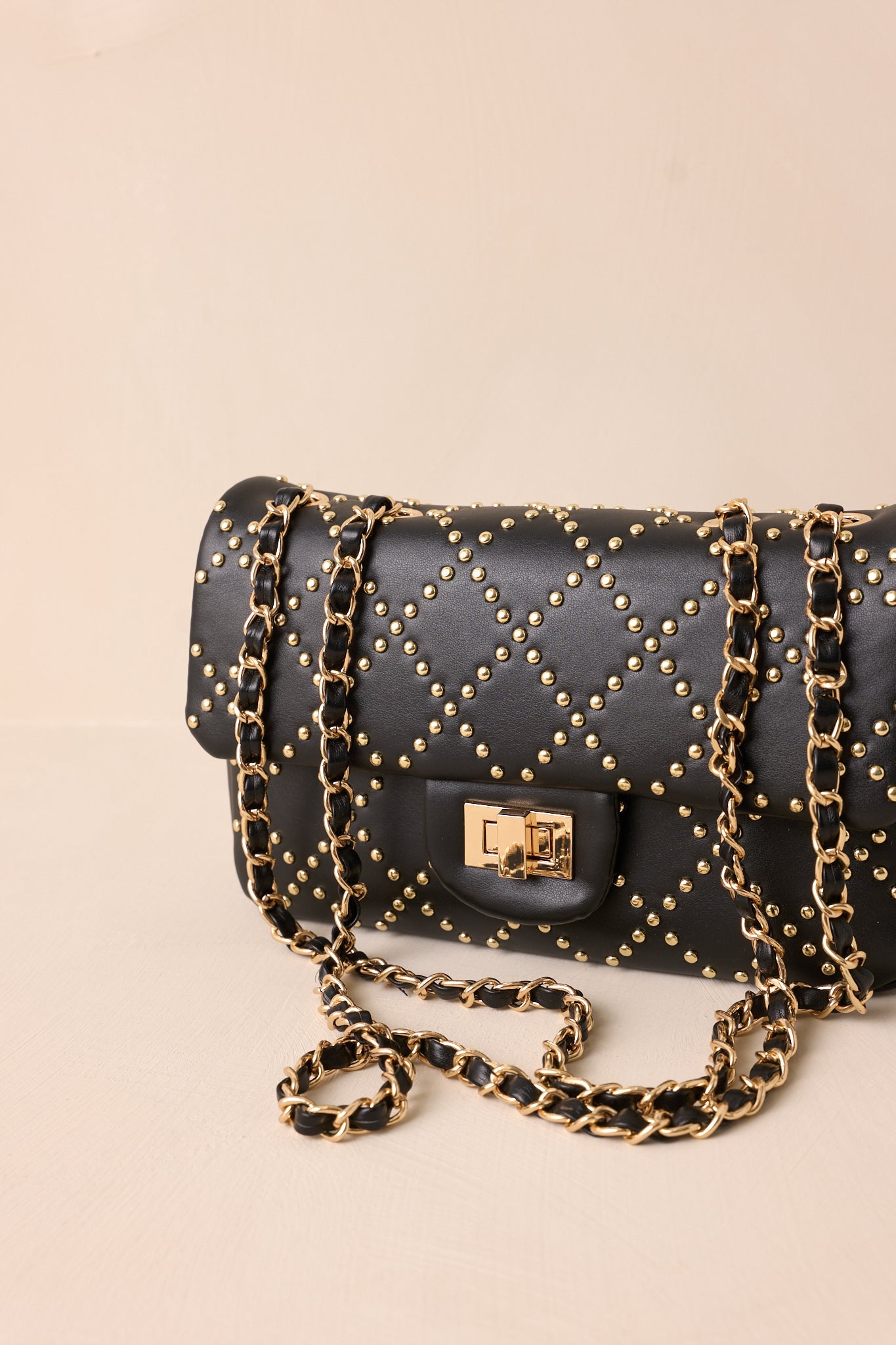 Unleash your inner fashionista with the It's About Time Black Studded Handbag! This chic and stylish accessory features stunning studded detailing that adds a touch of edge to any outfit. With its spacious interior and durable construction, this handbag is perfect for your daily necessities and much more. Elevate your style and make a statement with this must-have handbag! This black handbag features an quilted gold studded pattern, a gold twist and lock closure, two medium sized black and gold chain braided handle, a built in pouch and zippered pouch inside.