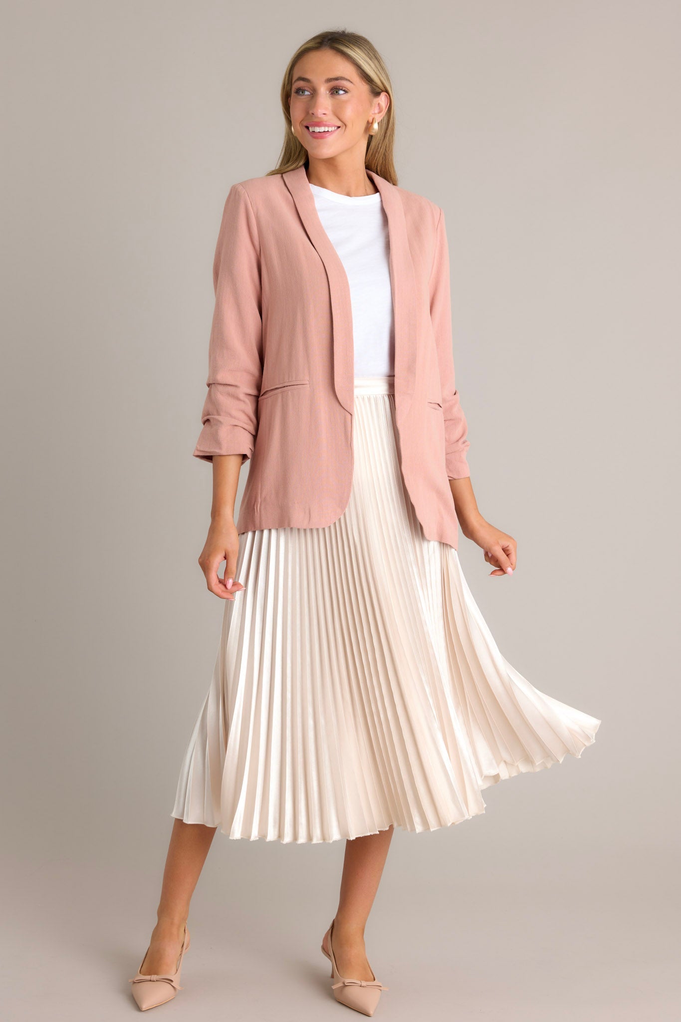Upgrade your wardrobe with our It's My Call Rose Pink Linen Blazer! This versatile piece is both stylish and functional, making it perfect for the office or a night on the town. With its sleek design and dusty rose color, you'll be sure to stand out while still feeling comfortable and confident. Time to embrace your inner fashion maven! This blazer features a folded neckline, shoulder padding, faux pockets, and gathering in the quarter length sleeves.
