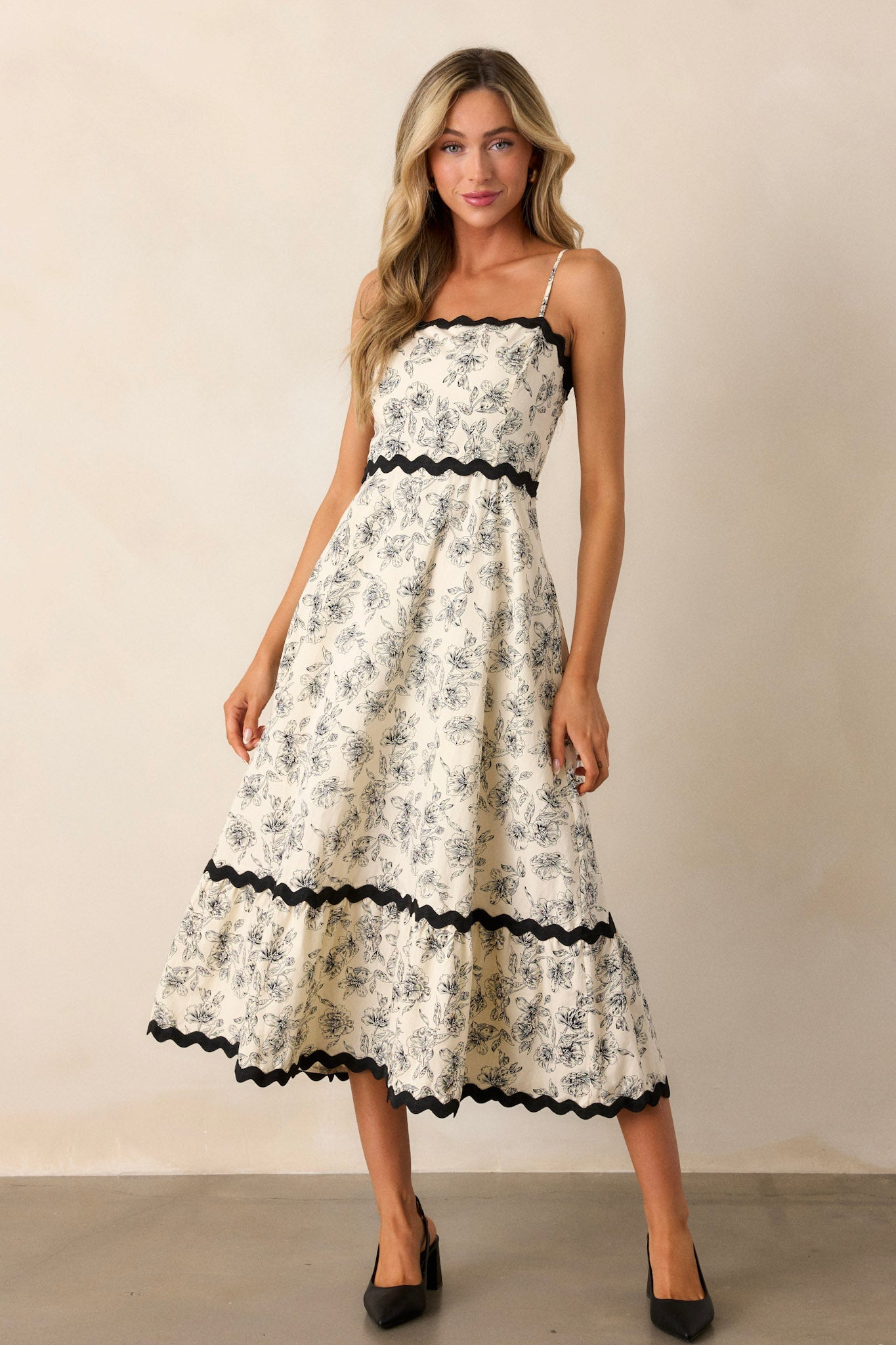 Be the talk of the town in our Ivy Illusions Cotton Ivory Floral Print Maxi Dress! With a stunning floral print, this dress is perfect for any occasion. Whether you're going out for brunch or attending a summer wedding, our dress will make you stand out in the best way possible. Bring some whimsy and charm to your wardrobe with this must-have piece! This ivory maxi dress features a square neck, black ruffle trim, a tiered design, a black floral print, a discrete back zipper and adjustable spaghetti straps.