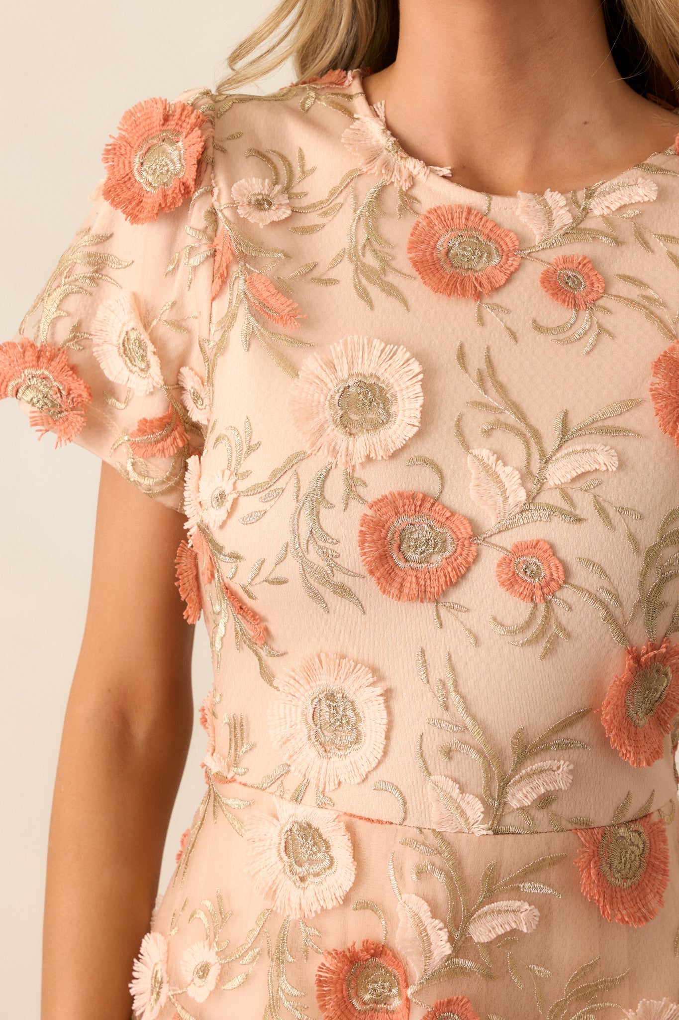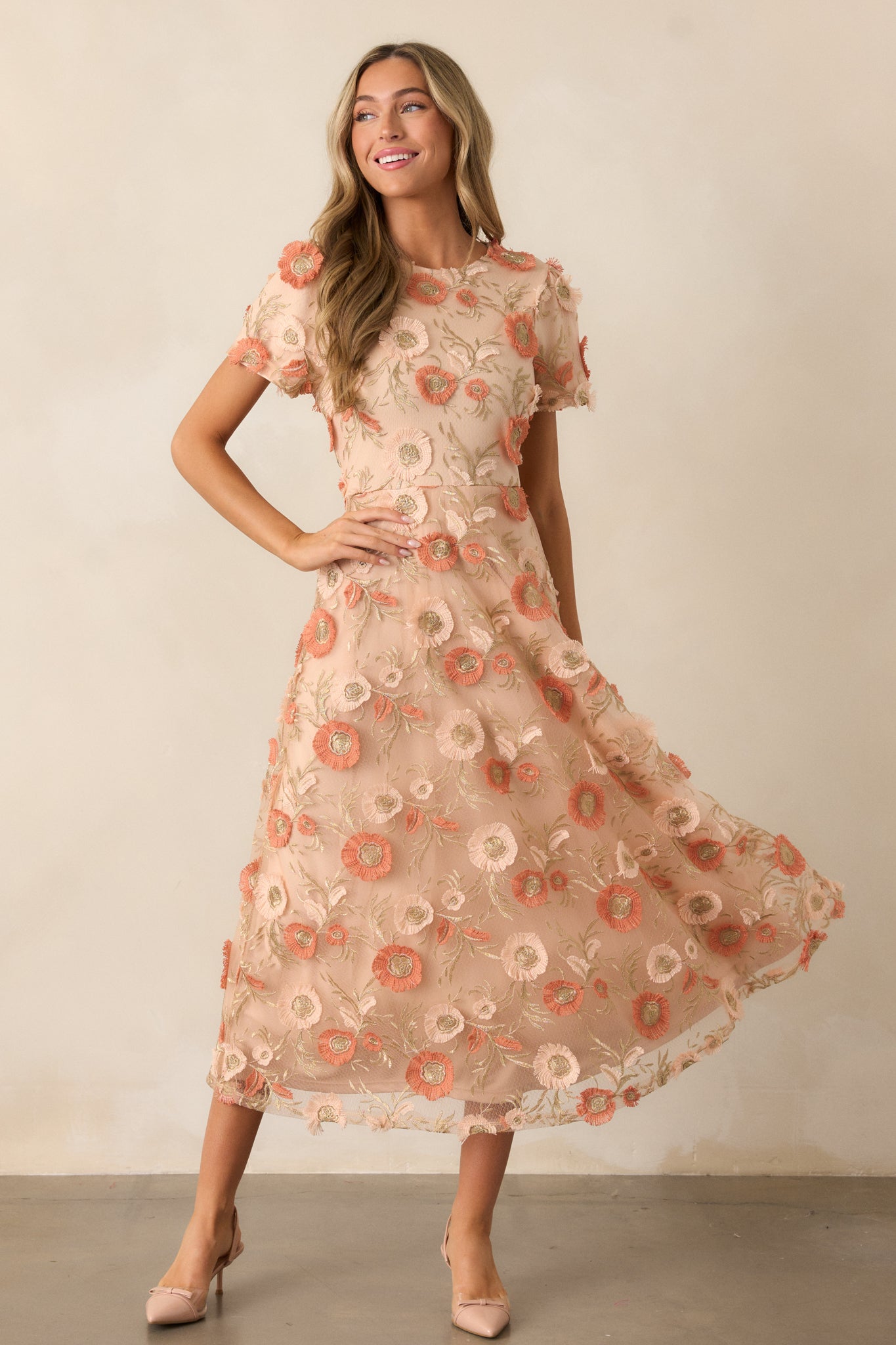 Step into spring with our Jumping Ahead Tan Floral Embroidered Midi Dress. The lightweight fabric and floral embroidery make it perfect for any occasion. With a flattering midi length, this dress is the ideal mix of style and comfort. Elevate your wardrobe with this must-have piece. This tan dress features a round neckline, embroidered floral overlay, a fit and flare design, gold back zipper and short sleeves.
