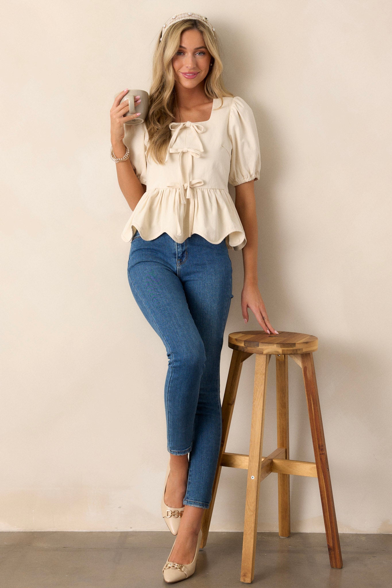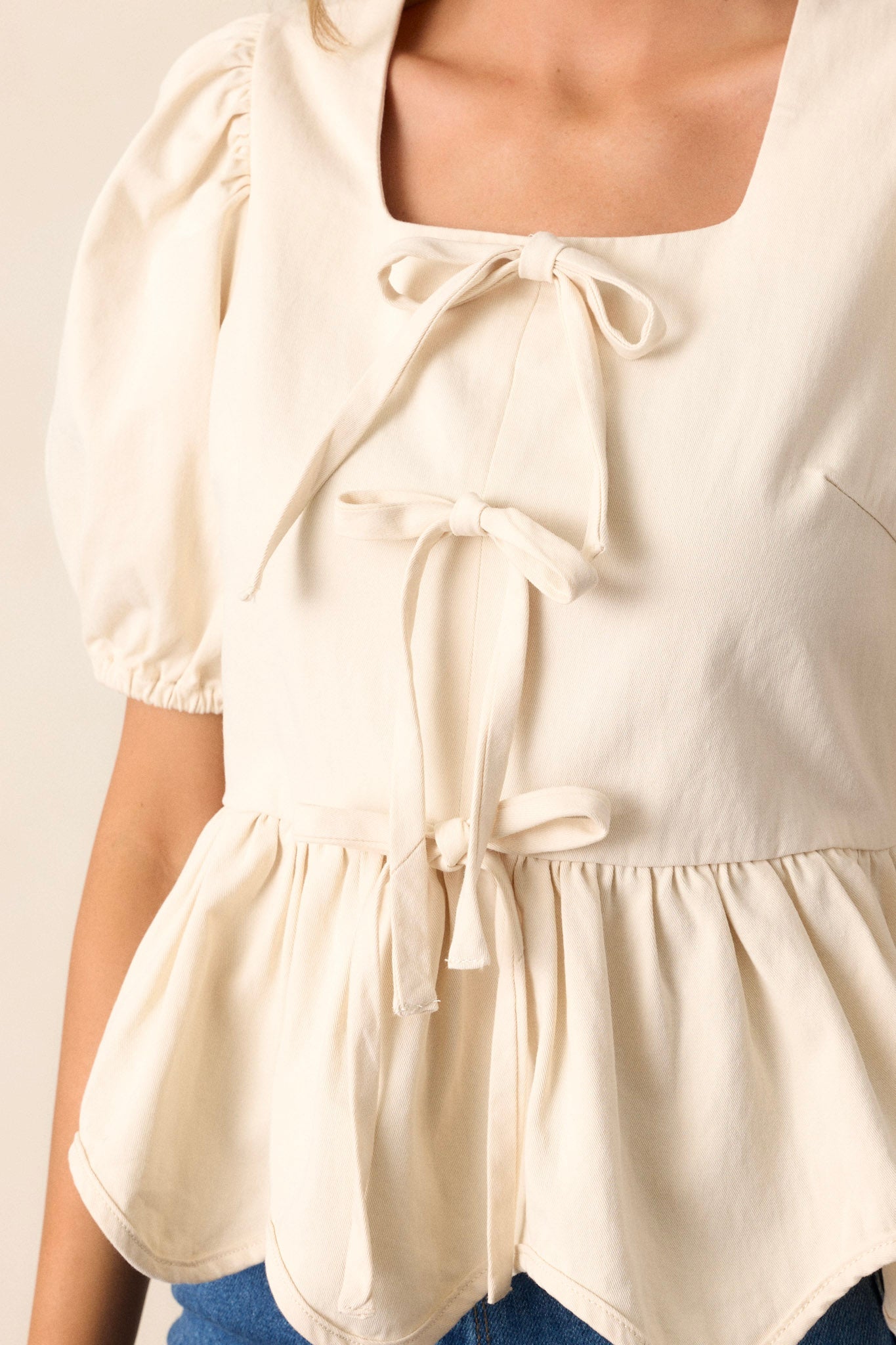 Just A Girl 100% Cotton Ivory Puff Sleeve Bow Peplum Top