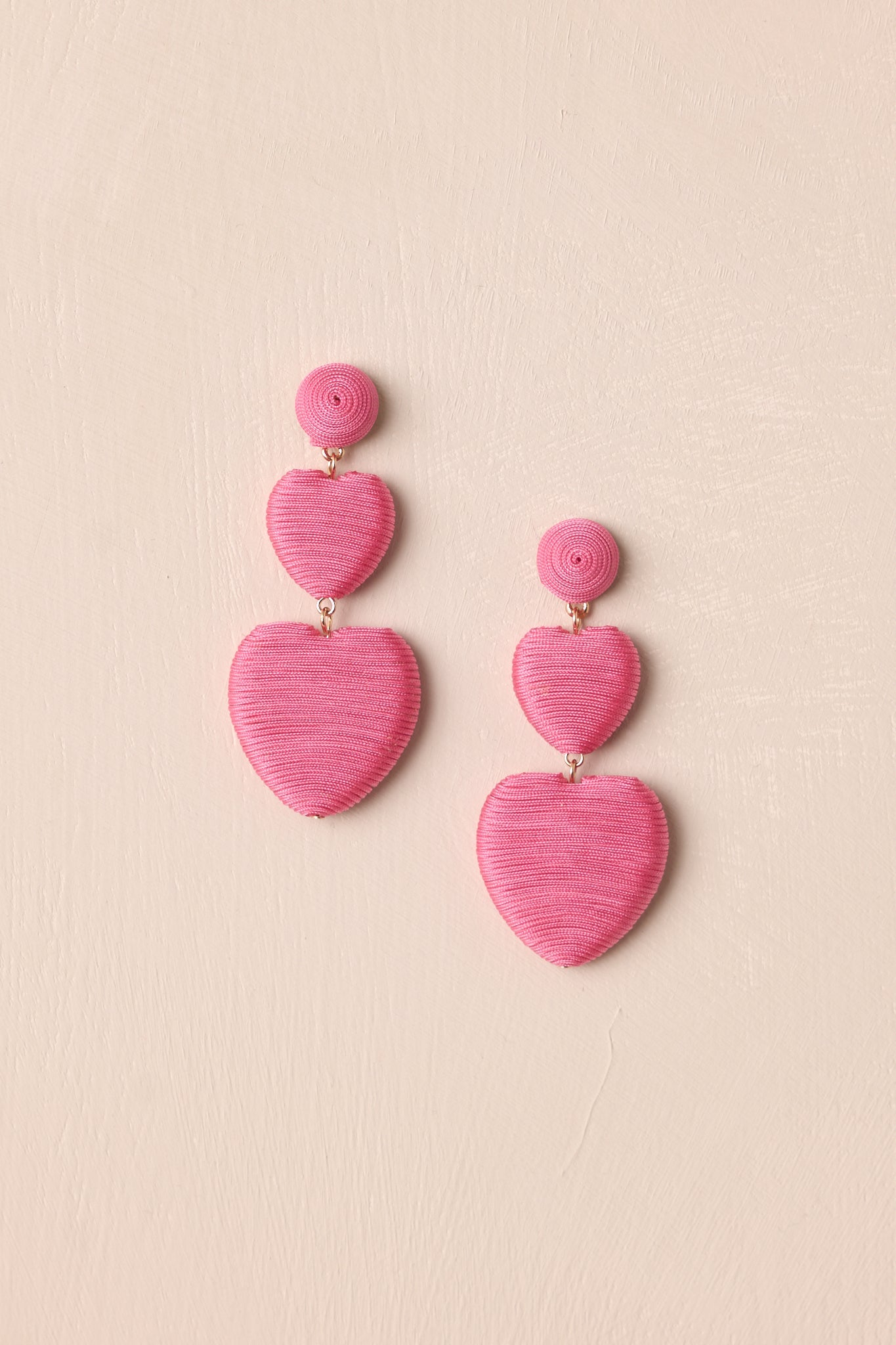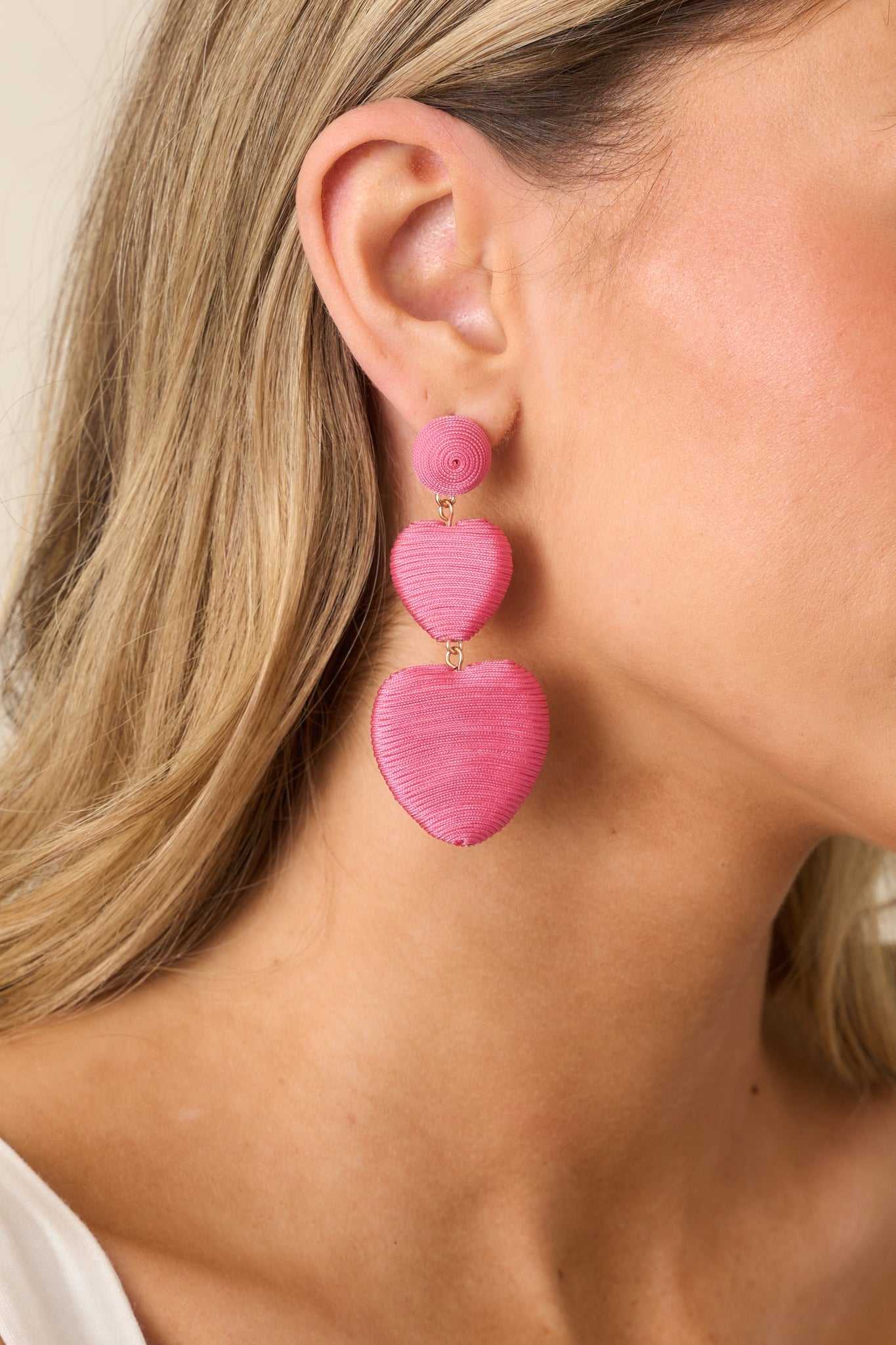 Elevate your style with our Keep It For Me Pink Heart Drop Earrings. These fun earrings feature a delicate heart shape and a bright pink color, perfect for adding a pop of color to any outfit. These pink heart drop earrings feature a half sphere pink woven stud, connecting gold jump rings, pink string covering the earrings, two pink heart pendants, and secure back postings.