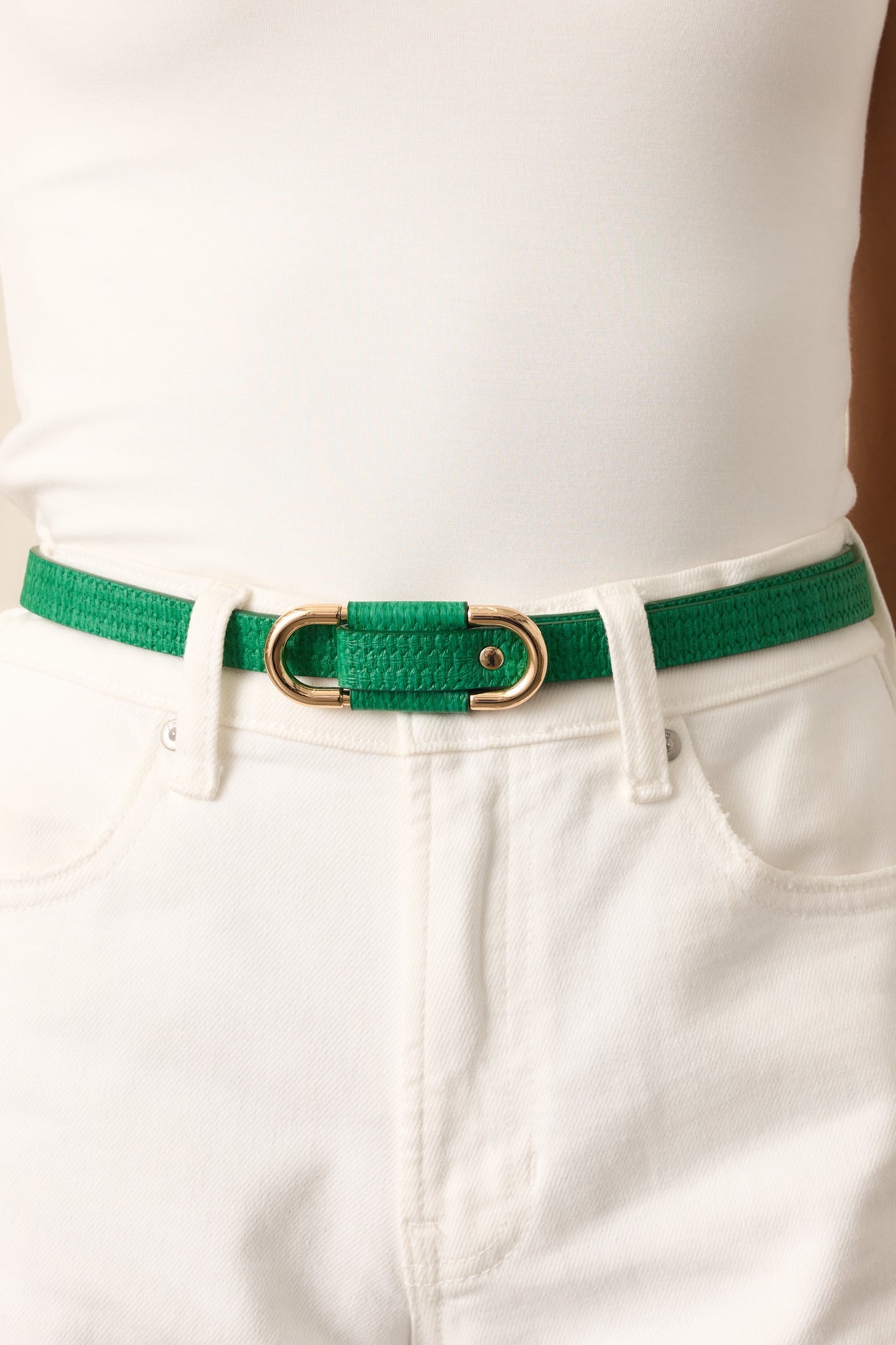 Effortlessly elevate your outfit with our Keep It Together Kelly Green Faux Leather Belt. Made from high-quality faux leather, this belt adds a touch of sophistication to any look. The sleek design and durable material make it a versatile and long-lasting accessory for any occasion. Keep it stylish and secure with our belt. This kelly green belt features a thin textured green material, gold hardware, a square anchor belt buckle, and a beige inside.