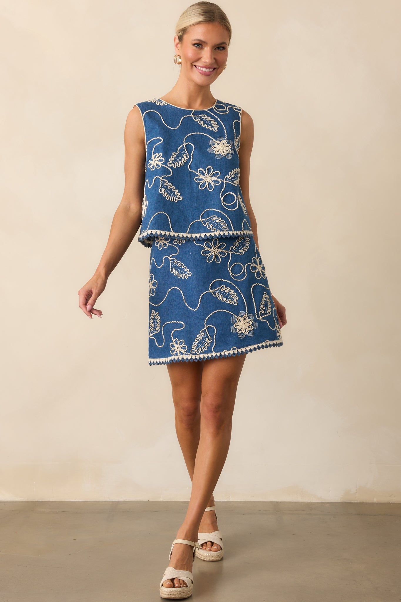 Keep Looking Up Dark Wash Cotton Denim Bow Back Top is a playful take on everyday confidence. With standout details and a feel-good attitude, it’s a reminder to stay bold, stay hopeful, and always add your own twist. This dark wash top features ivory floral embroidery throughout, ivory piping trim details, round neckline, sleeveless design, crochet bottom hem, slightly cropped length, adjustable open self-tie bow back, and boxy fit.