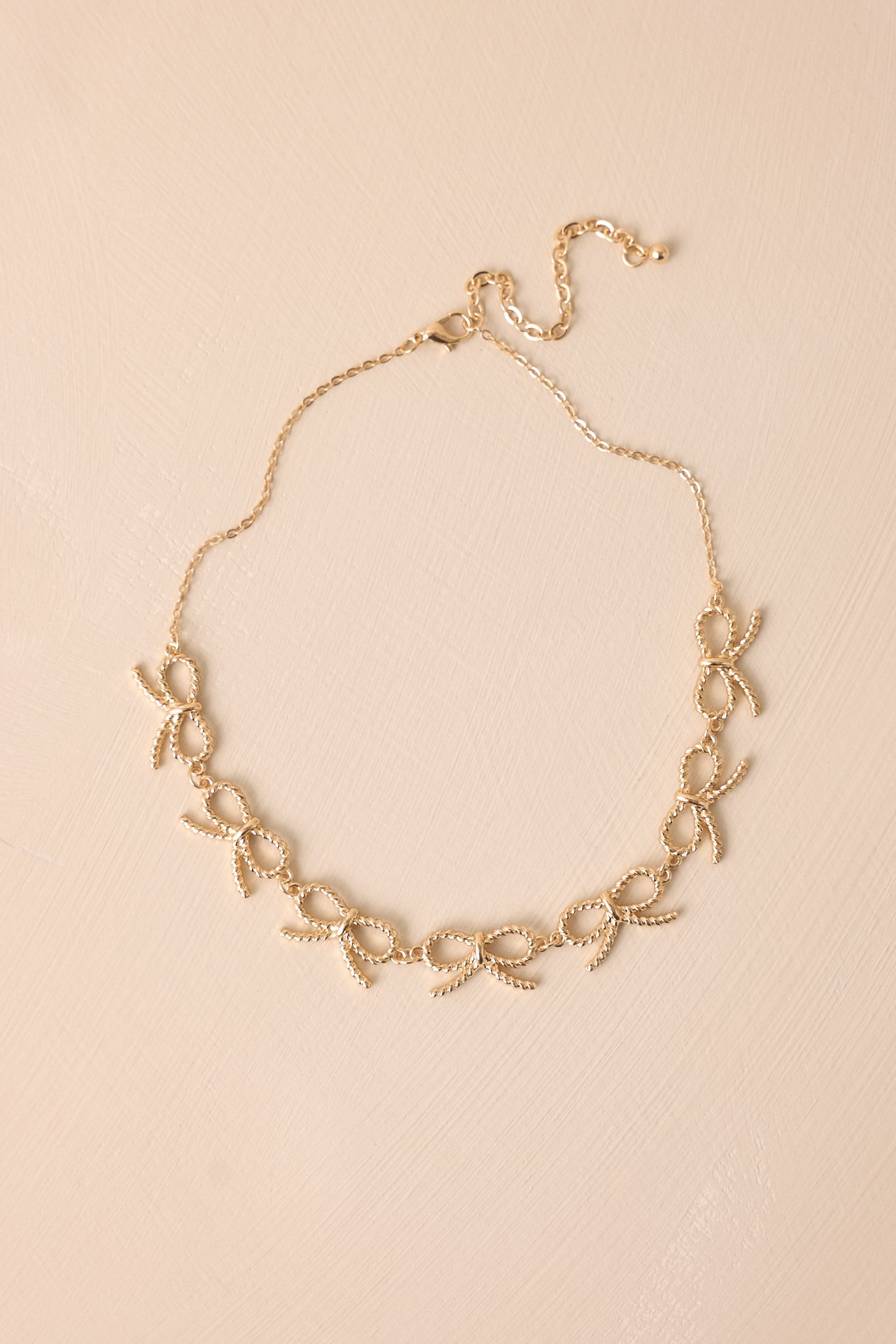 Unleash your inner fashionista with our Know The Feeling Gold Bow Necklace. This elegant piece features a delicate bow pendant crafted in gold for a touch of sophistication. Perfect for any occasion, this necklace will add a touch of charm to any outfit. Elevate your style and confidence with this stunning accessory. This gold necklace features gold hardware, a thin gold chain, seven gold rope textured bows and a lobster claw closure.