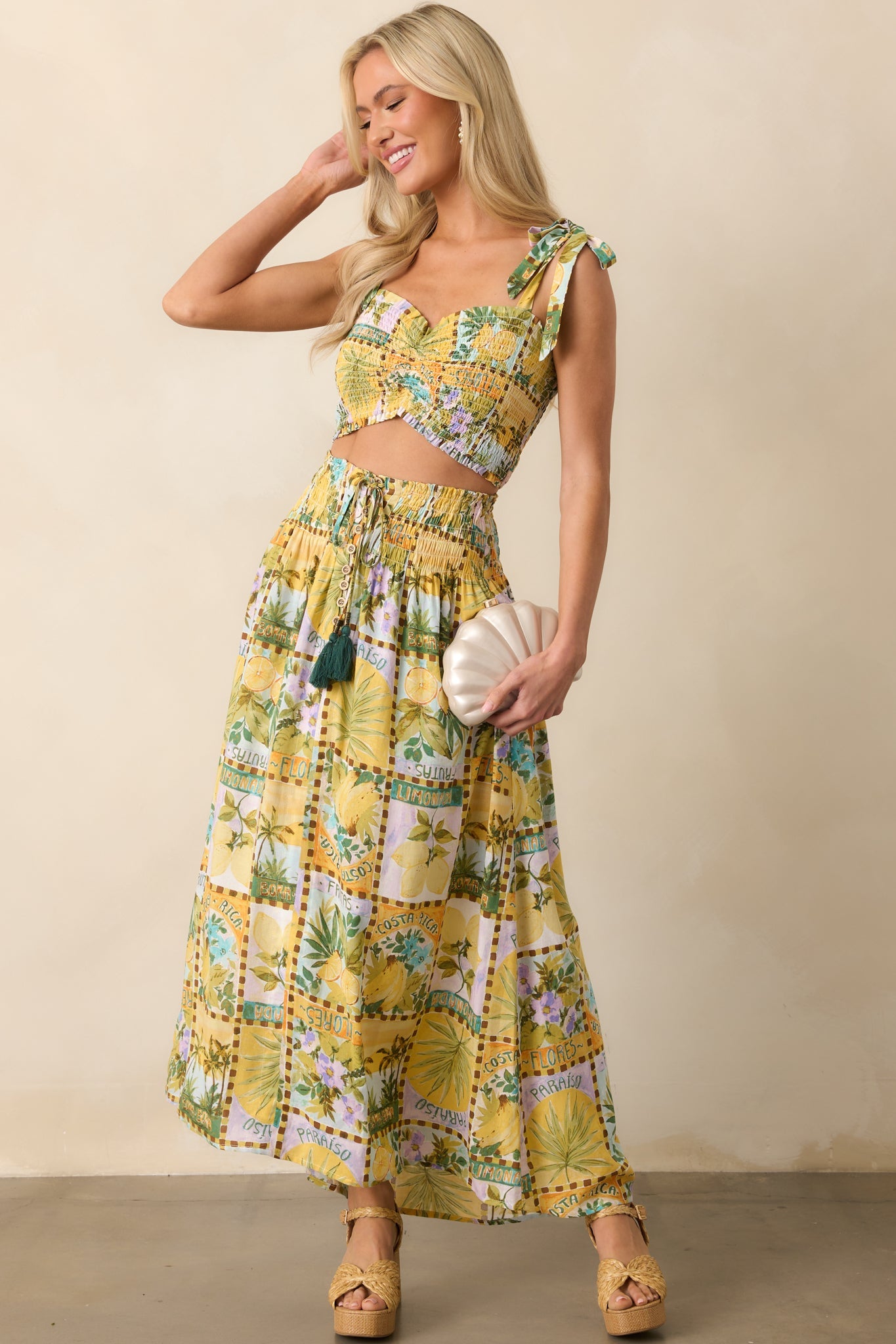 The Shore Thing Green Tropical Print Smocked Crop Top is a lively choice for embracing the vibrant spirit of a tropical getaway. Its playful design makes it perfect for those moments when you want to feel carefree and stylish in a relaxed setting. This top features an allover tropical print, a fully smocked bodice, a center cinched bust, adjustable self-tie bow straps, and a cropped length.