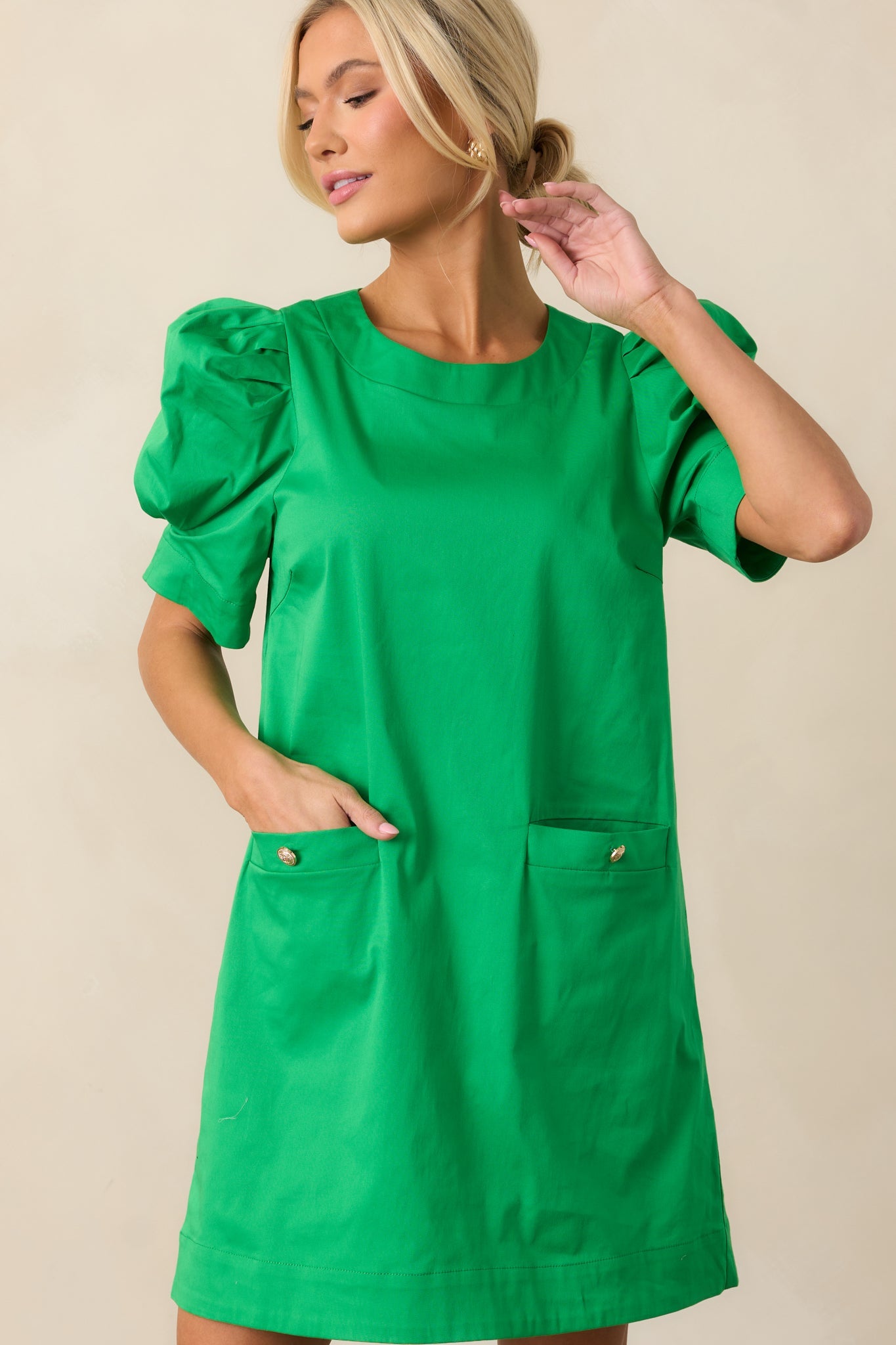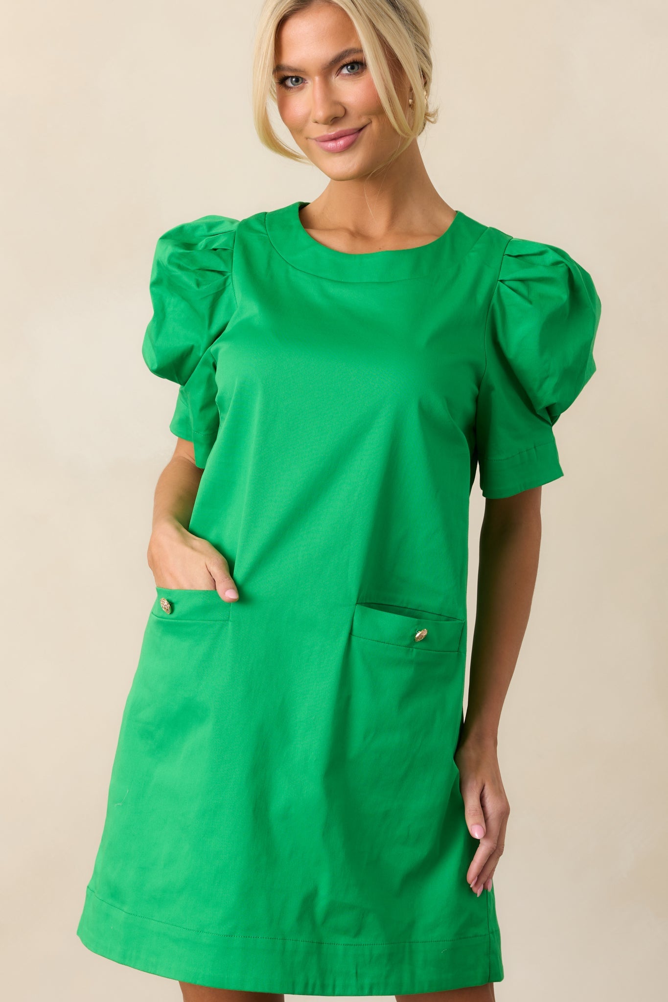 Indulge in effortless elegance with our Wine Cellar Tour Cotton Green Puff Sleeve Mini Dress. Made from cotton, this dress features a flattering puff sleeve design and a mini length. Perfect for a day out or a romantic evening, this dress will make heads turn. This green dress features puff sleeves, two functional front pockets, a round neckline, and an A-line style.