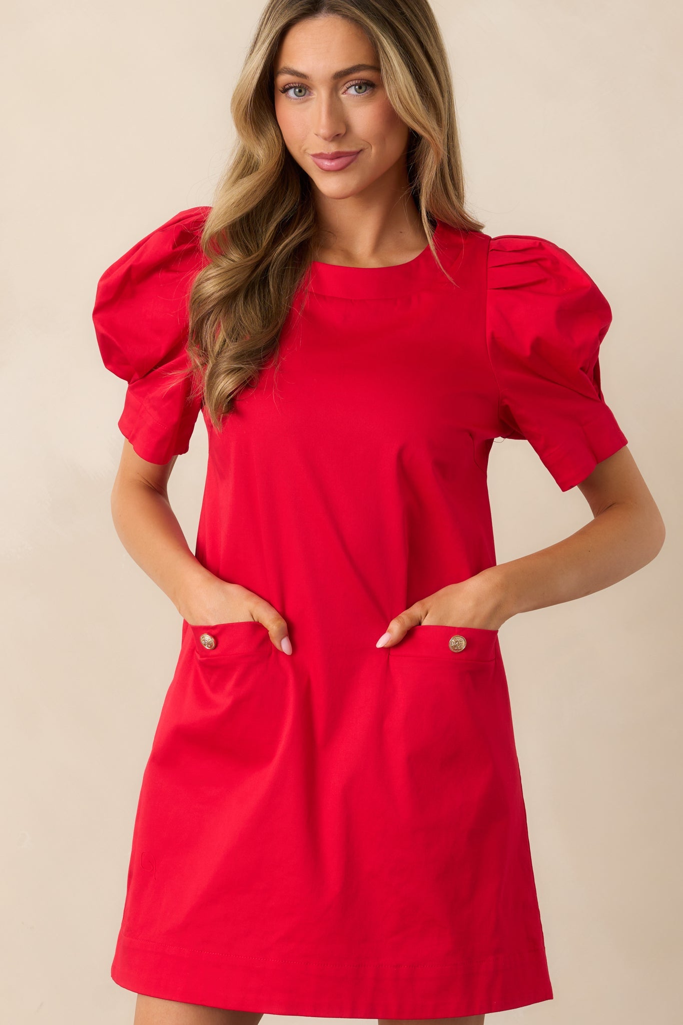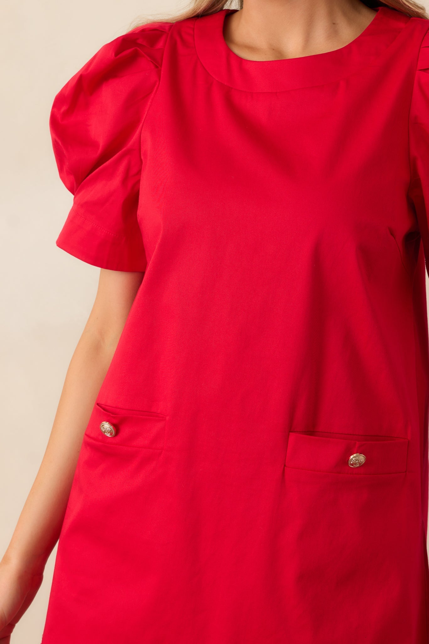 Indulge in luxury and sophistication with our Wine Cellar Tour Cotton Red Puff Sleeve Mini Dress. Made from cotton, the dress features playful puff sleeves and a flattering mini length. Perfect for any occasion, this dress will make you feel like a work of art. This red dress features a rounded neckline, slightly relaxed fit, functional front pockets with gold embellished buttons, button keyhole back and puff sleeve design.