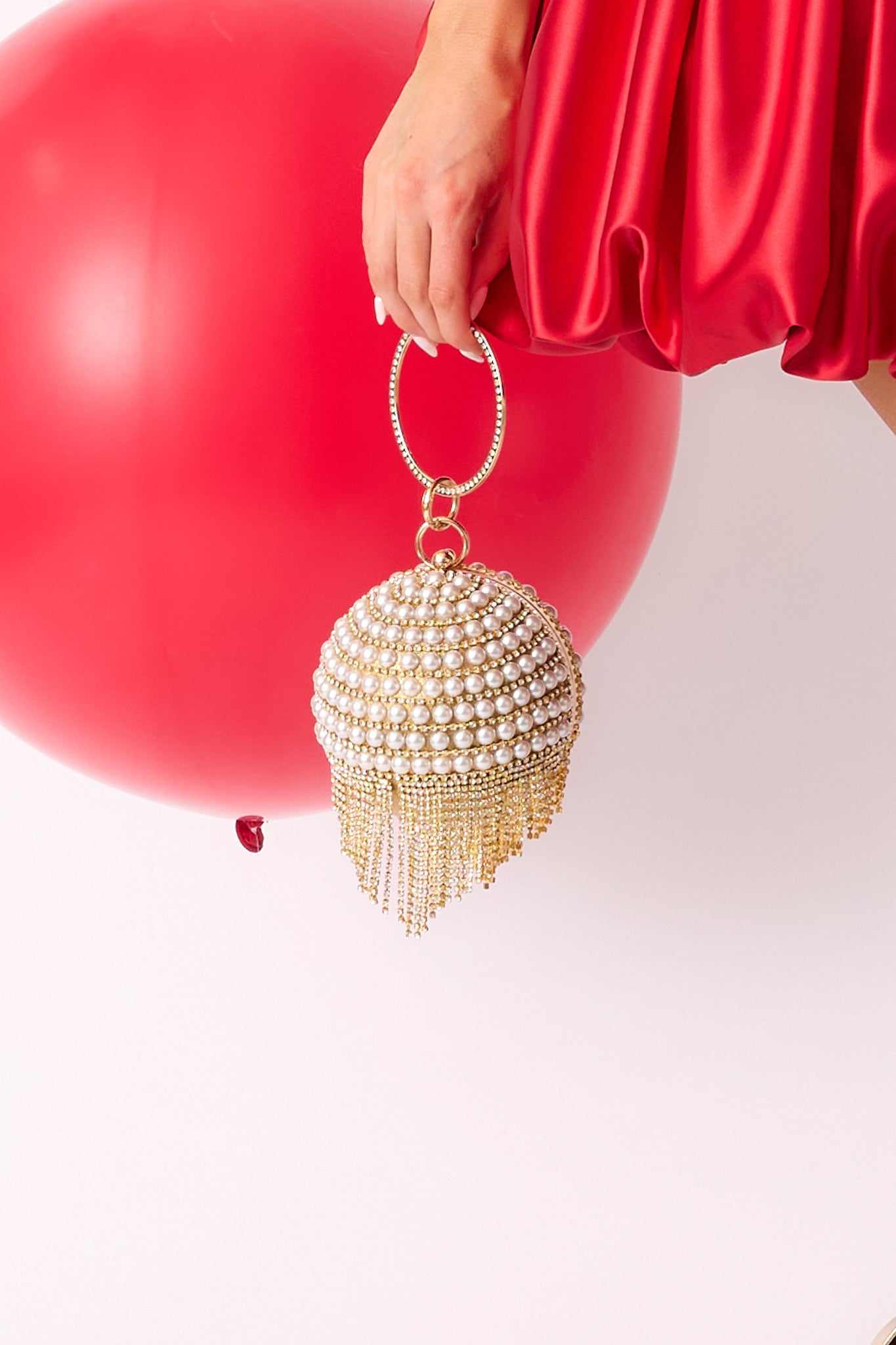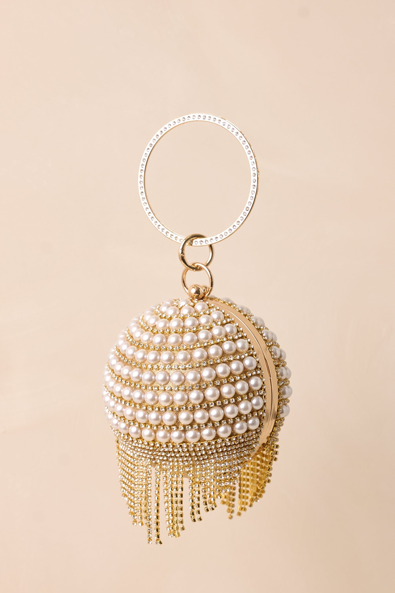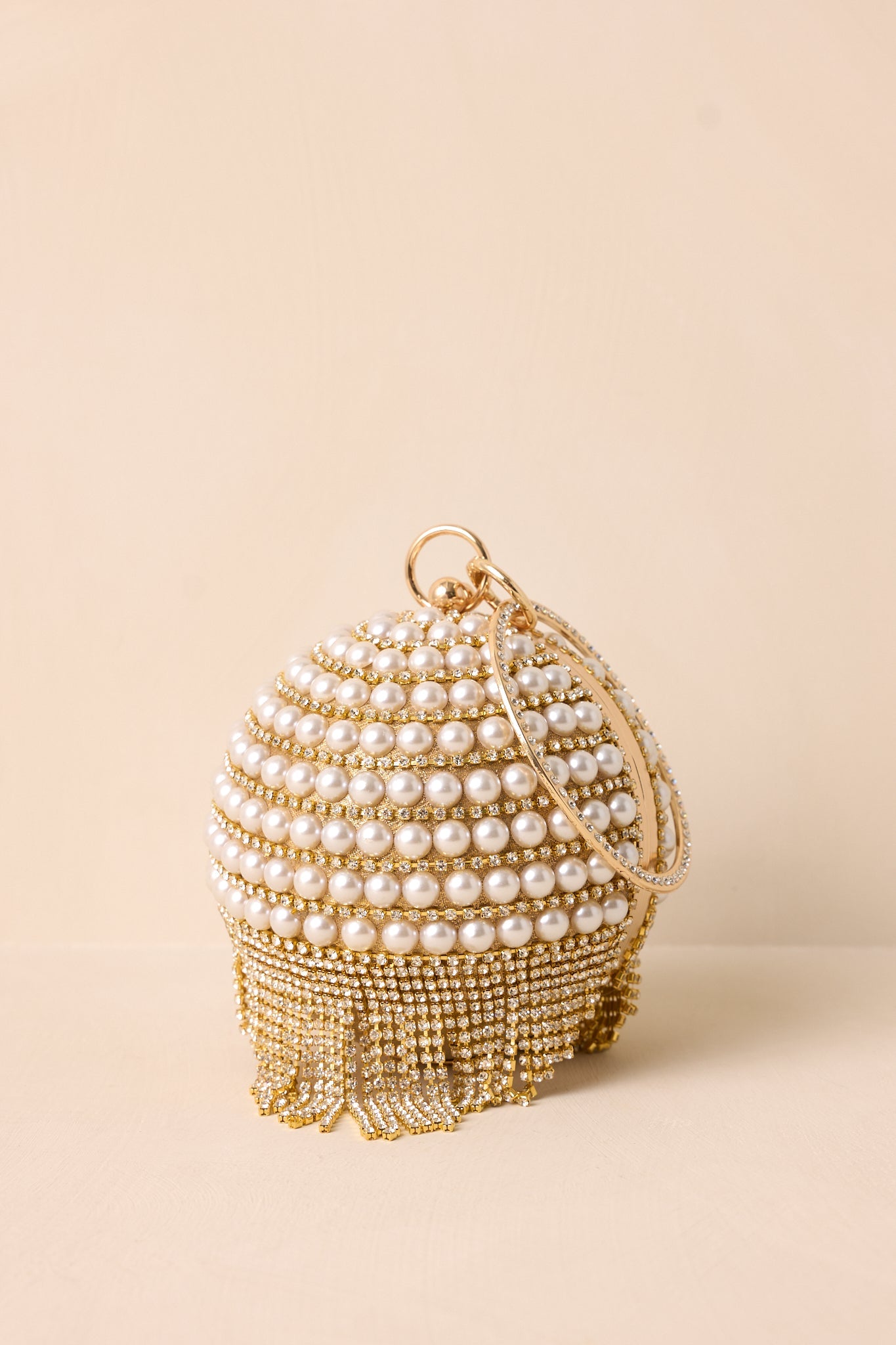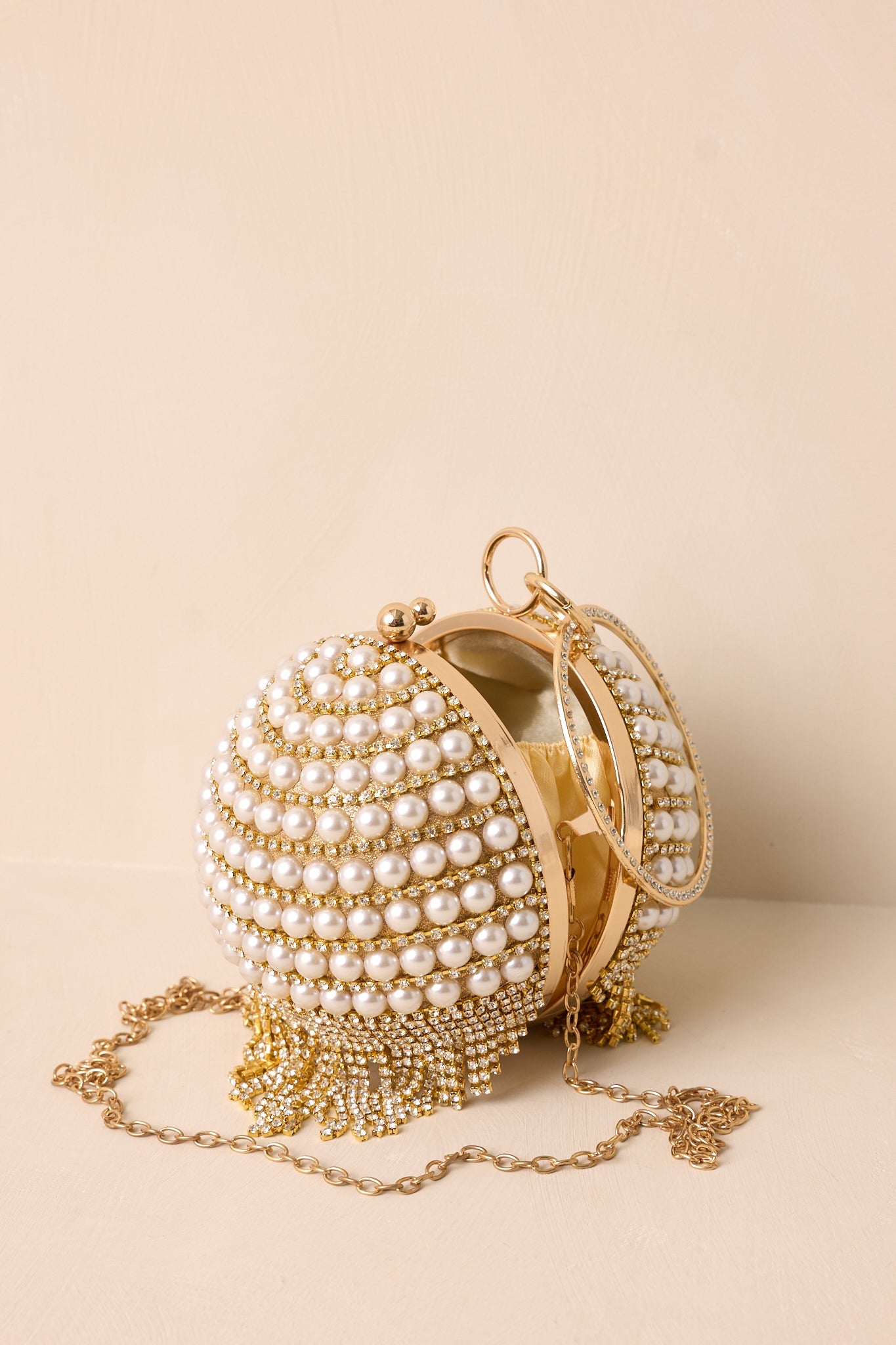 Elevate your style with our You're My Star Gold and Ivory Pearl Clutch. The perfect accessory for any special occasion, this clutch features a stunning gold and ivory design with delicate pearl accents. Carry all your essentials while adding a touch of elegance to your ensemble. This gold and ivory clutch features a gold diamond-embossed handle, a gold closure, a circular body with rows of ivory faux pearls and diamonds and dangling diamond accents.