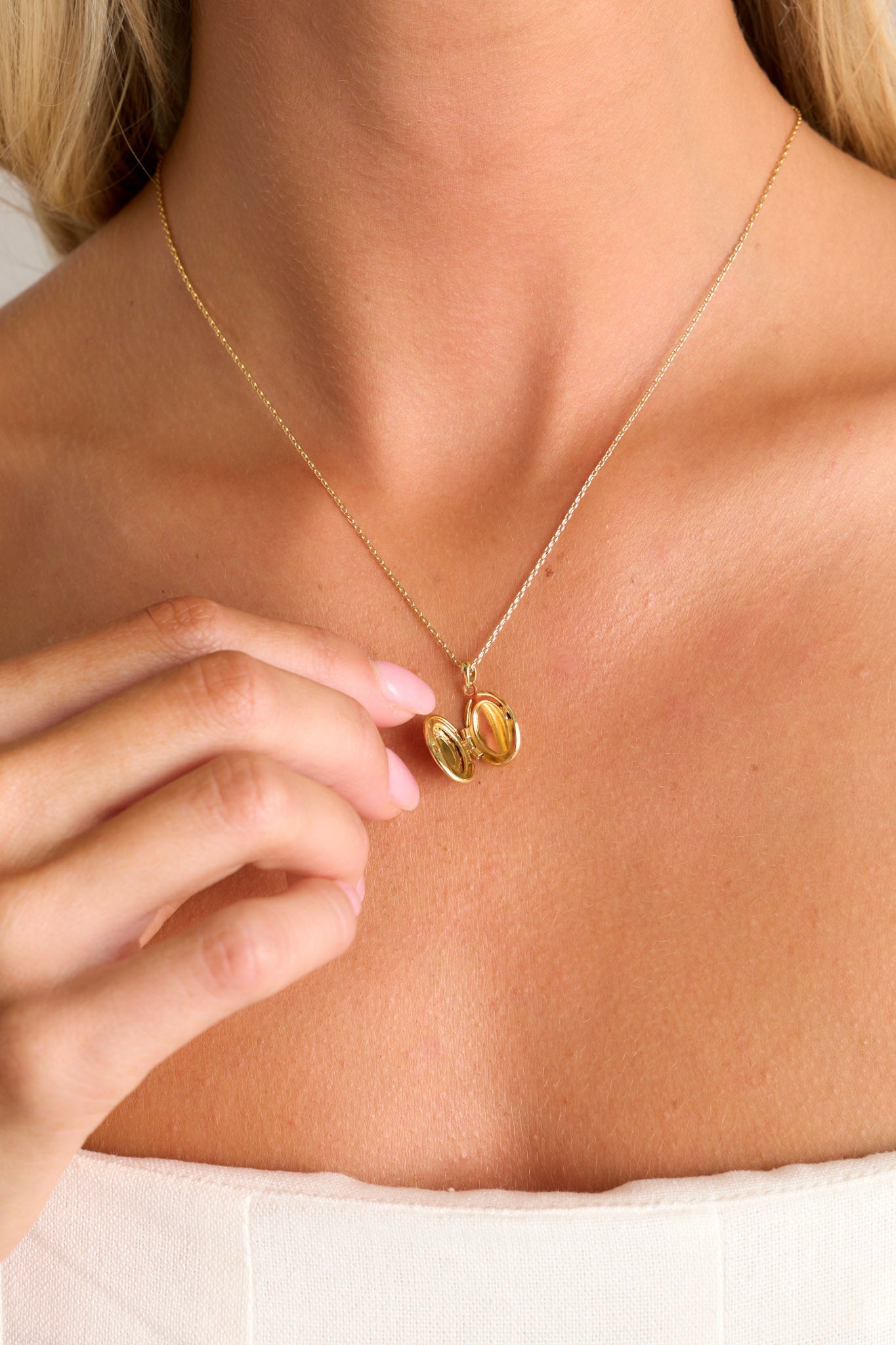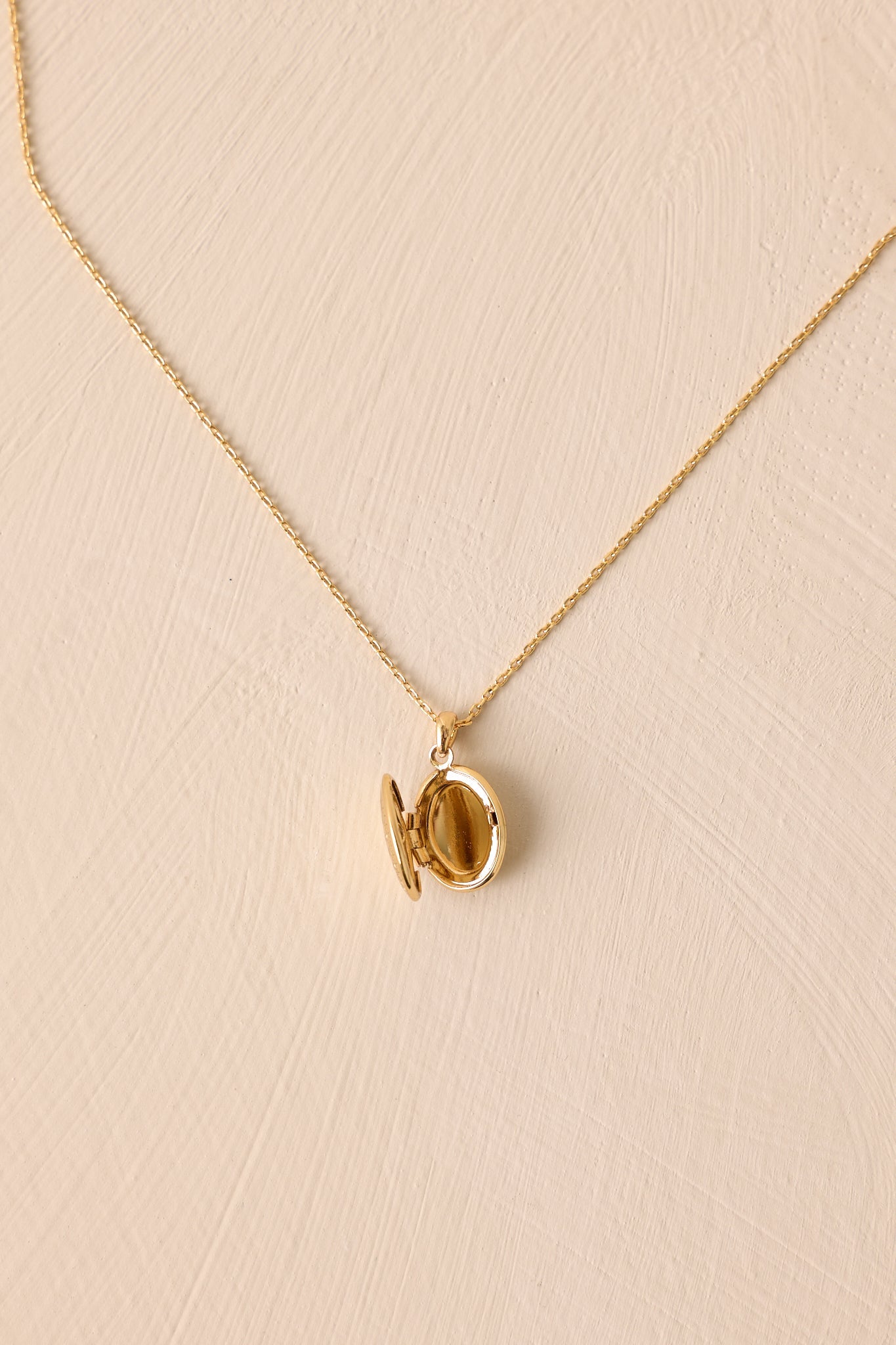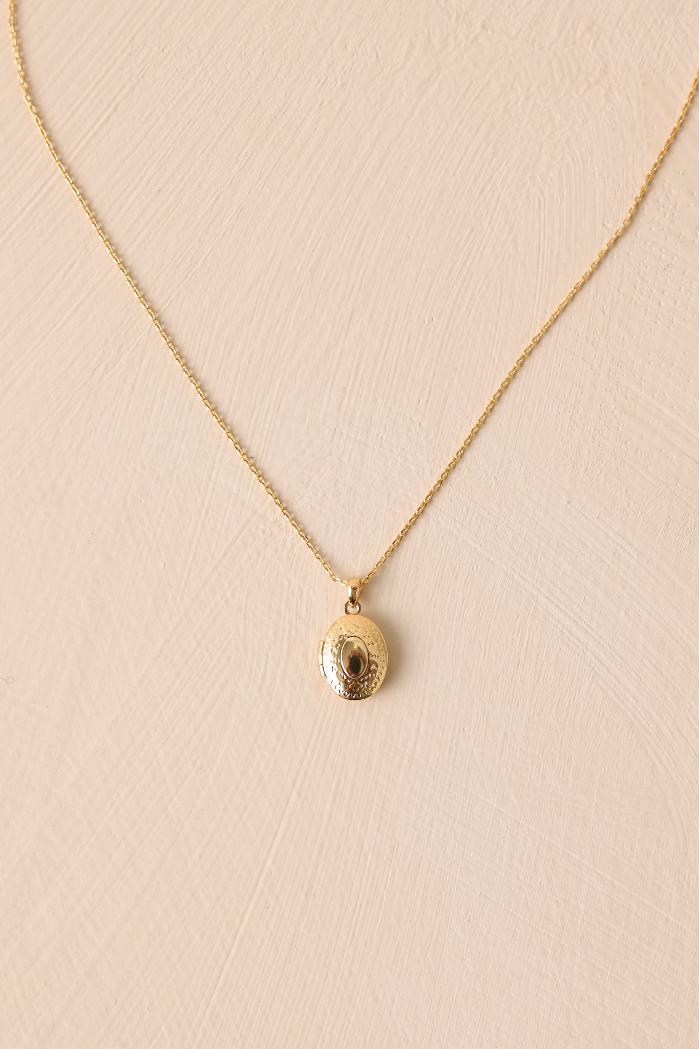 Discover the perfect way to hold cherished memories close with the You're My Muse Gold Locket Necklace. This elegant necklace features a stunning locket that can hold precious photos or keepsakes, making it a beautiful and meaningful accessory. Crafted with high-quality materials, it is a lasting symbol of love and devotion. Surprise someone special with this heartfelt gift. This gold locket features gold hardware, an oval locket, and an adjustable length.