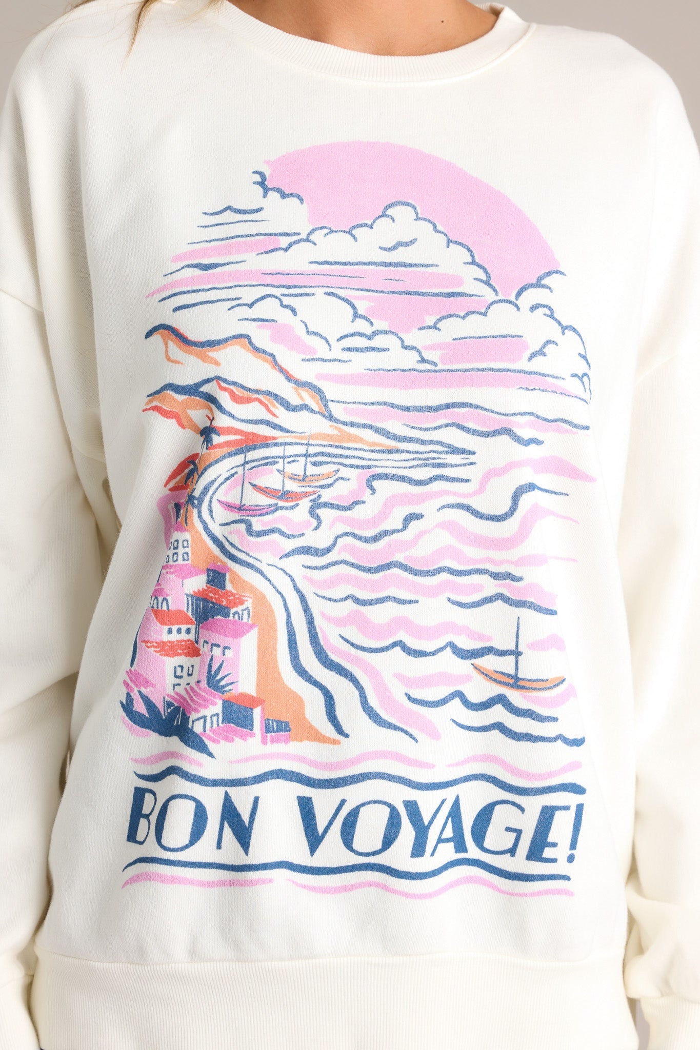Take your style on a salty adventure with the Z Supply Bon Voyage Sunday Sea Salt Sweatshirt. Made with cozy fabric, this sweatshirt provides all-day comfort while still being fashionable. Perfect for a laid-back day or a weekend getaway. Bon voyage, indeed! This ivory sweatshirt features a ribbed crew neckline, a large print, a thick ribbed hemline, and ribbed cuffed long sleeves.