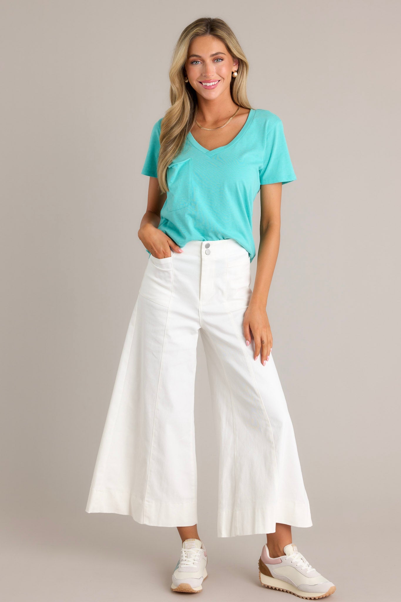 Unleash your inner bliss with the Z Supply Cabana Green Pocket Tee. With a stylish pocket and soft cotton fabric, this tee will have you feeling comfortable and carefree all day long. Perfect for any casual occasion, this tee is a must-have in any wardrobe. This cabana green tee features a v-neckline, a functional chest pocket, a super soft fabric, and a scooped hemline.