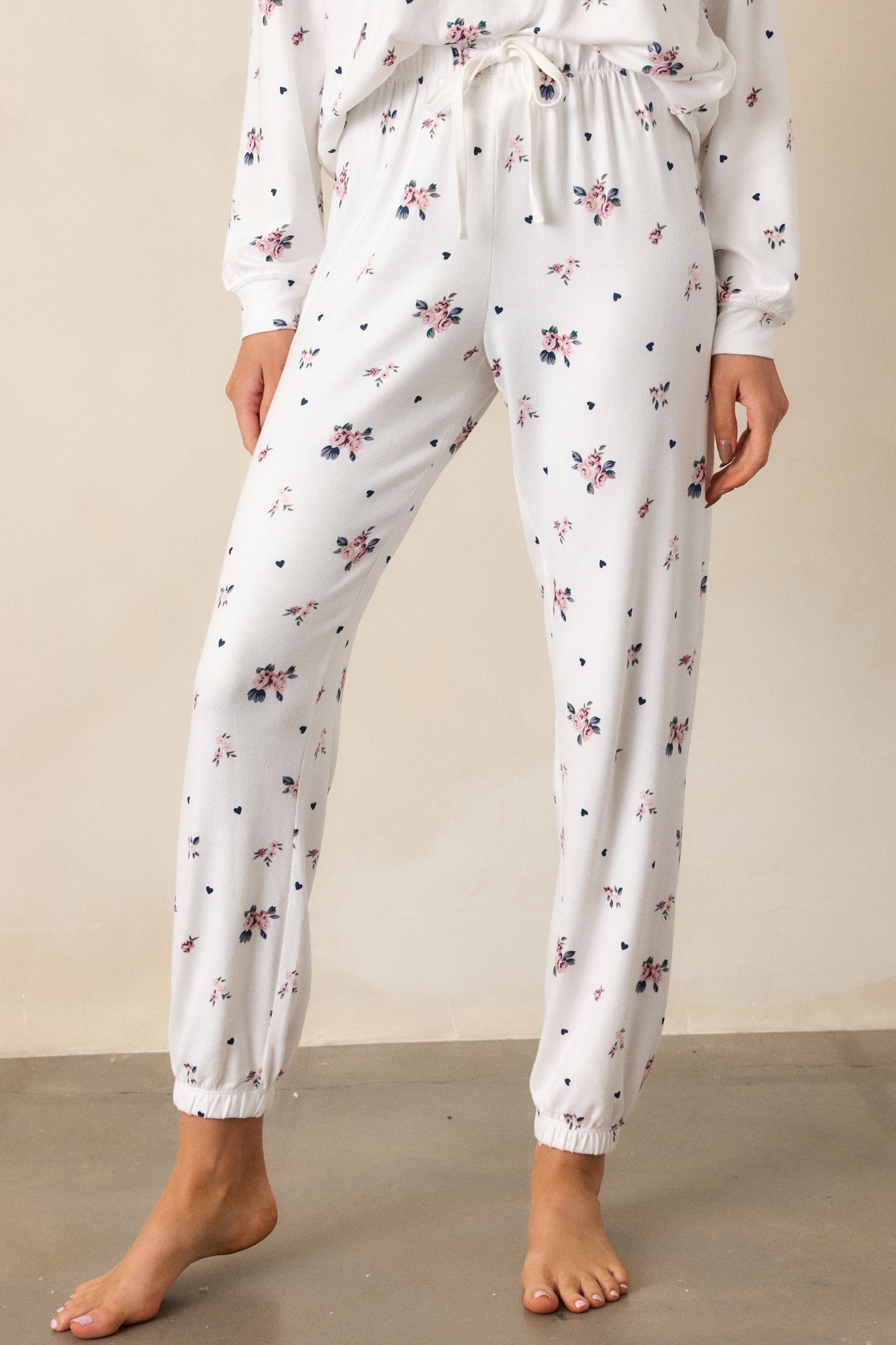 Keep warm and stylish with our Cozy Rosebud Ivory Lounge Joggers! Made with soft jersey fabric, these joggers are perfect for lounging at home or running errands. The ivory color adds a touch of elegance, while the jogger style provides comfort and flexibility. Stay cozy and chic with our ivory lounge joggers. These ivory joggers feature an elastic self tie waistband, high waist design, relaxed fit, rosebud pattern, and elastic ankle cuffs.