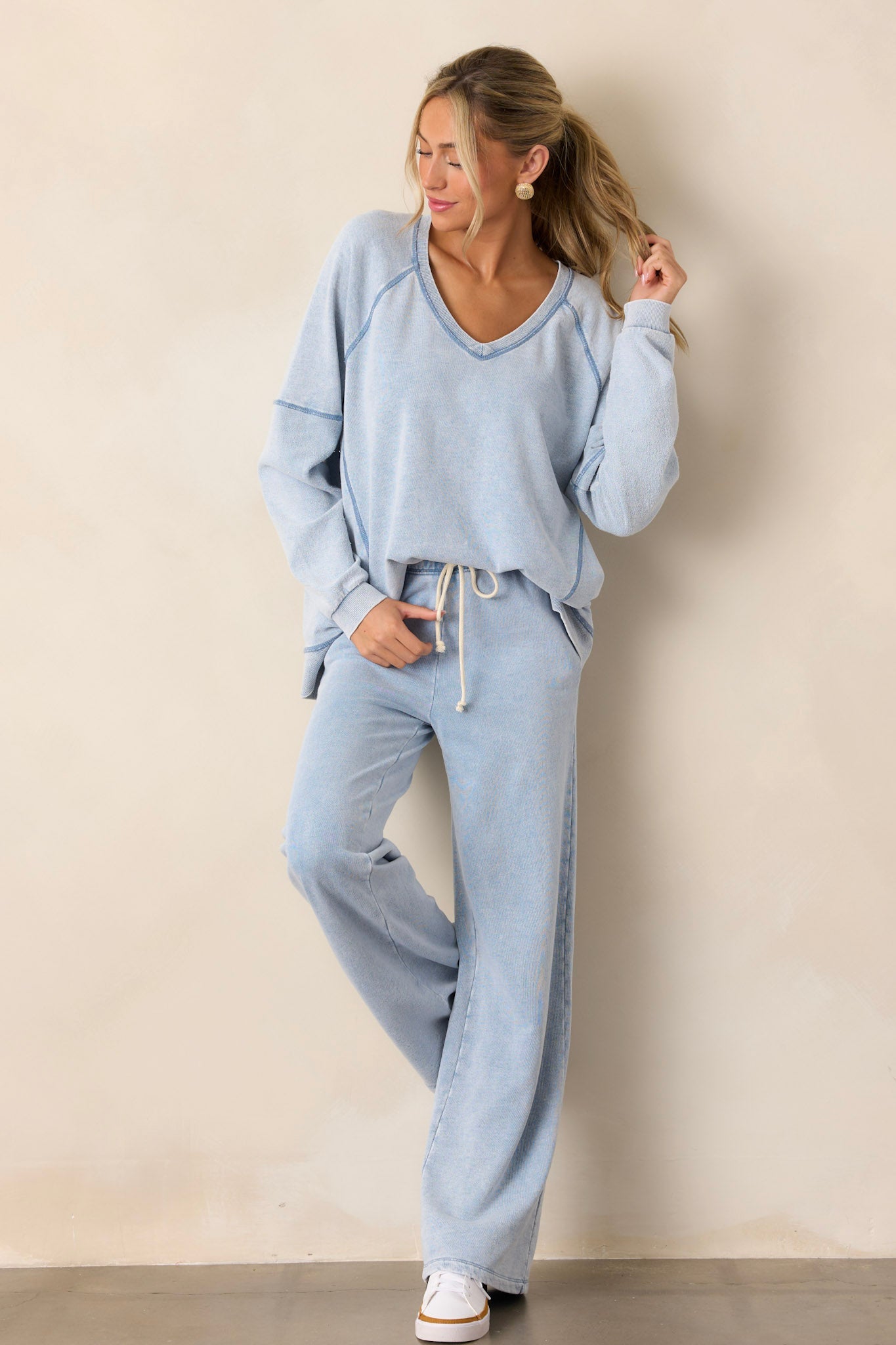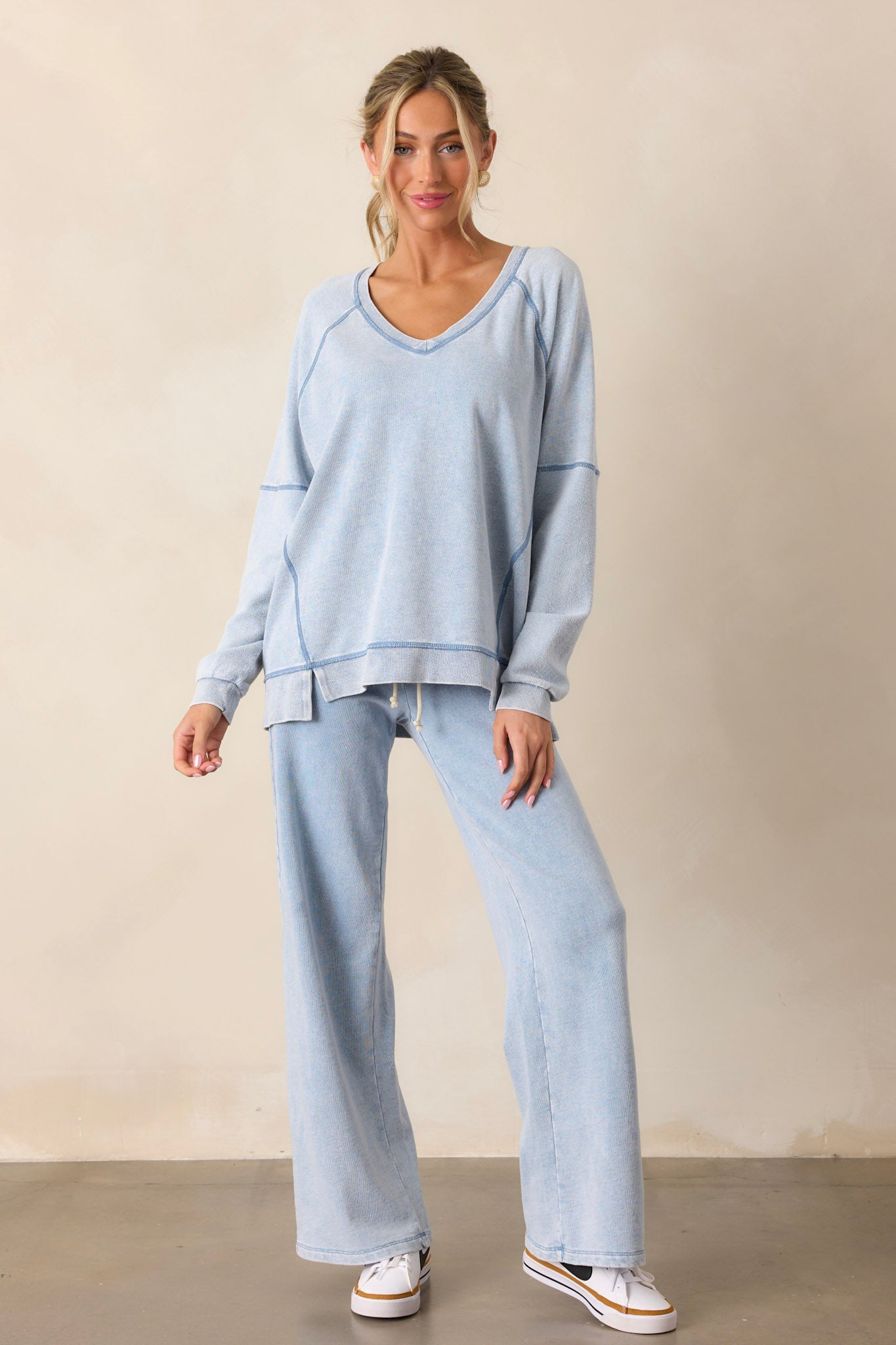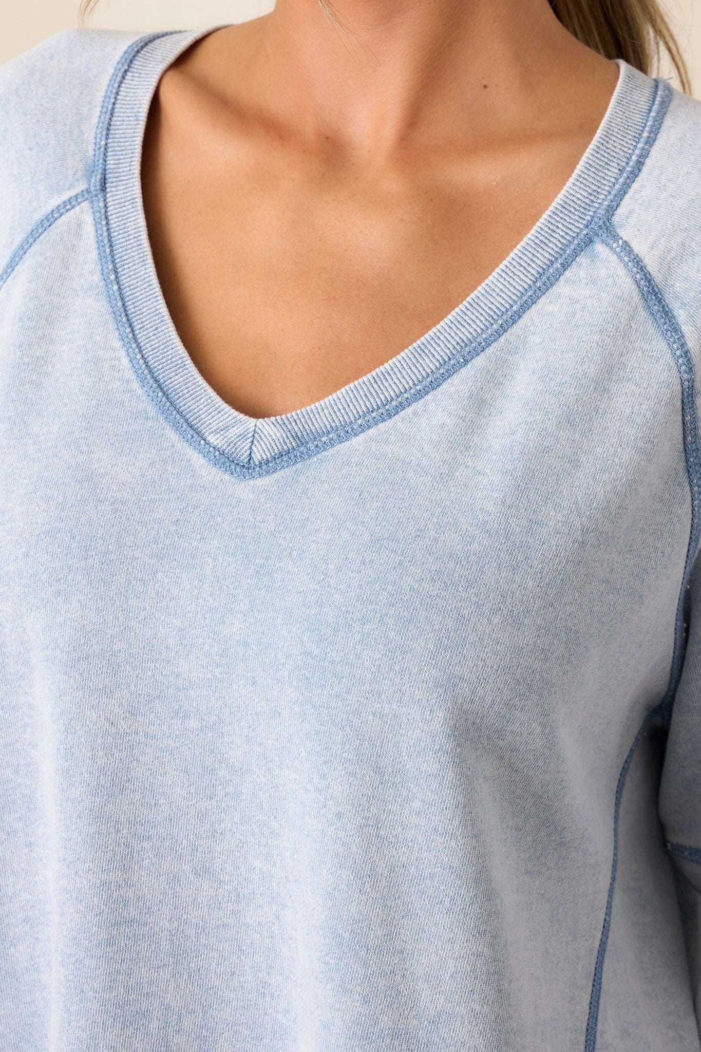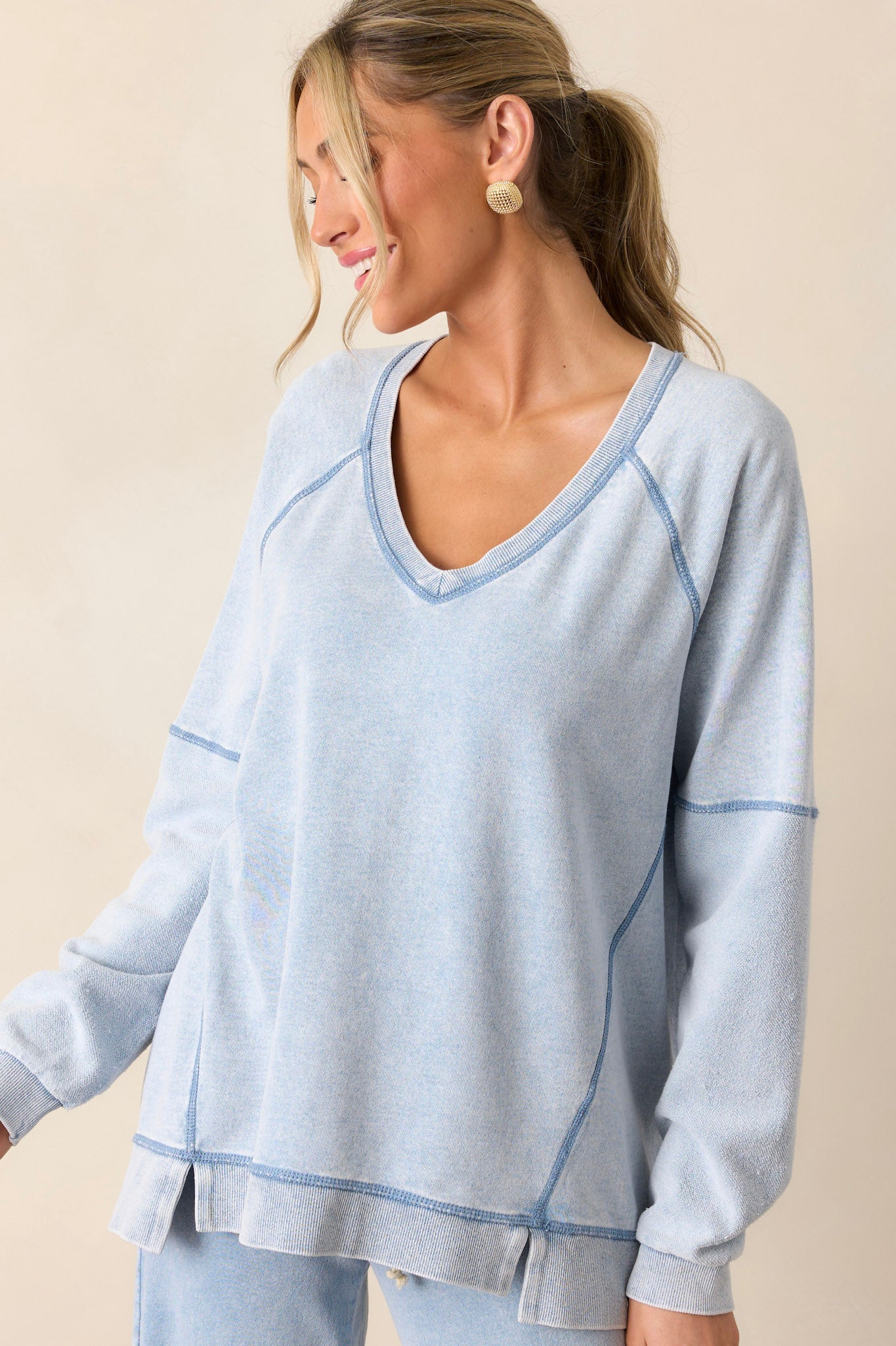 Introducing the Z Supply Easy V-Neck Washed Indigo Knit Denim Sweatshirt - the perfect blend of fashion and comfort. Made with a soft, washed knit denim material and featuring a flattering v-neck design. This sweatshirt will quickly become your go-to for all your casual outings. This indigo sweatshirt features a v-neckline, a soft knit texture, side slits in the hemline and long sleeves.