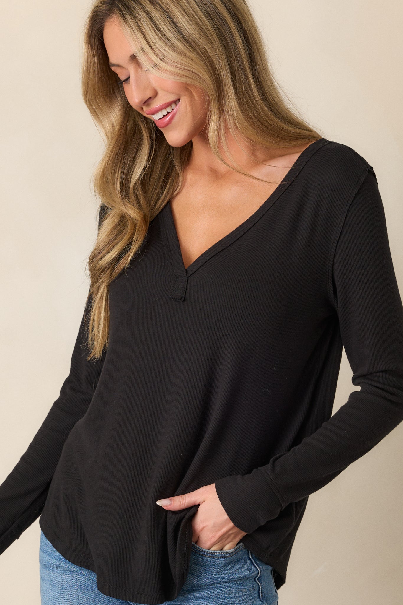 Introducing the Z Supply Elton Rib Black Top, a must-have for any wardrobe. Crafted with ribbed fabric, this top offers both comfort and style. Easily dressed up or down, it is perfect for any occasion. Don't miss out on adding this versatile piece to your collection. This black top features a v-neckline, soft ribbed design, curved bottom hem and long sleeves.