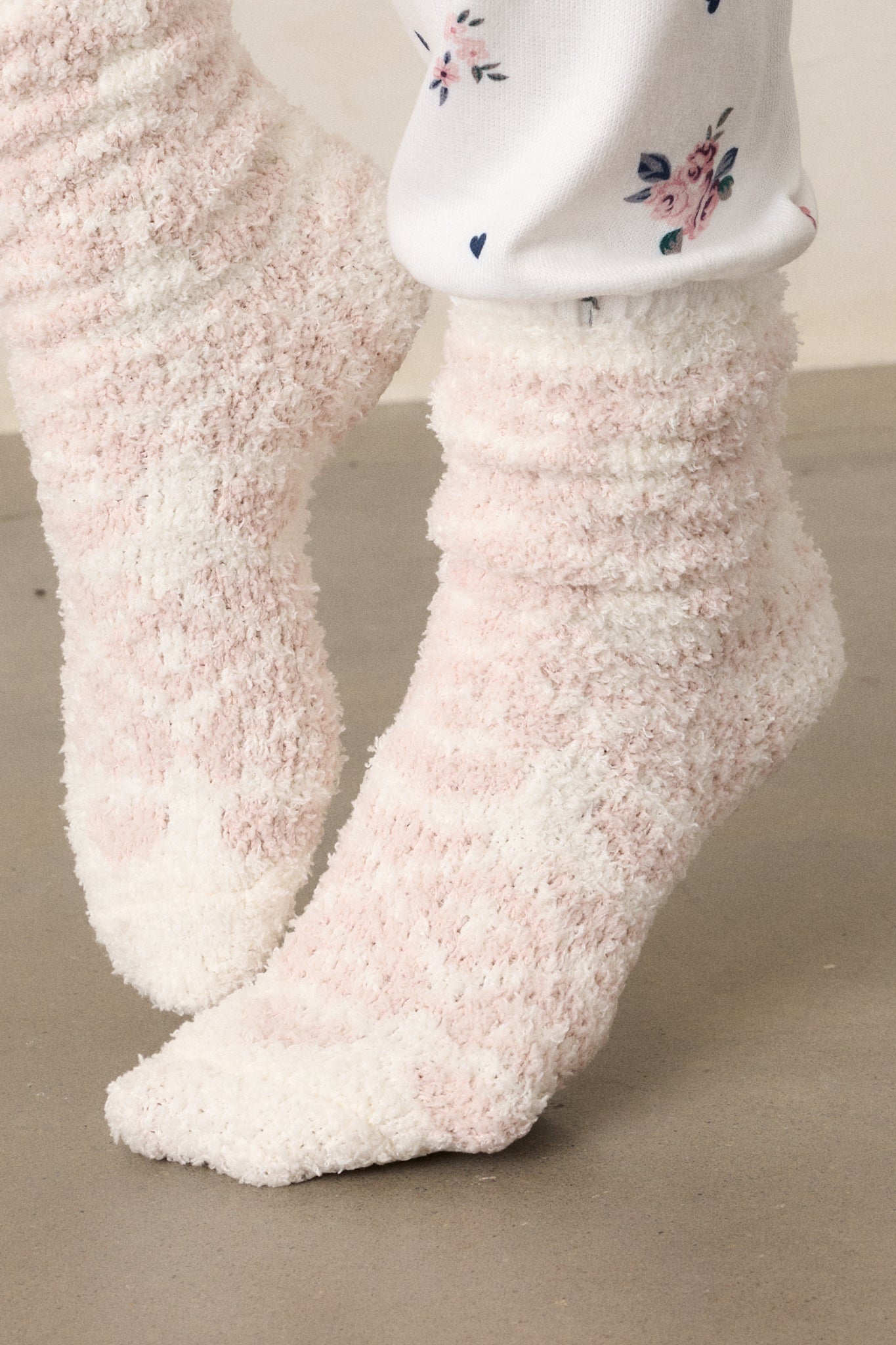 Keep your feet warm and cozy with our Z Supply Fairisle Crystal Grey Fuzzy Socks. Crafted from super soft fabric, these socks are ideal for staying comfortable. Whether you're relaxing at home or braving the cold, these socks are a must-have for warmth and style. These grey socks feature a fuzzy material, hit around the lower calf, and a pattern of pink hearts and decorative shapes woven throughout the sock.