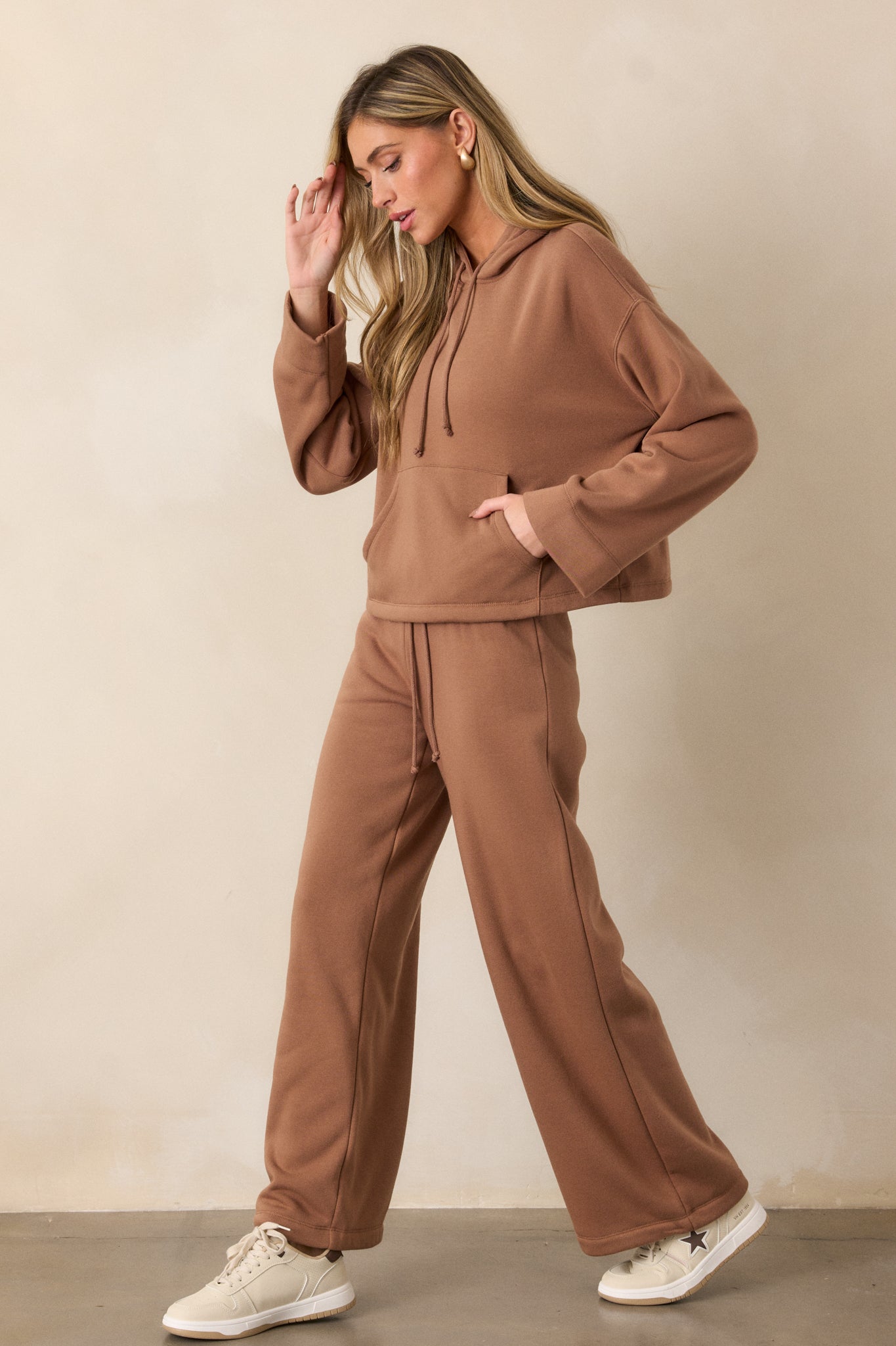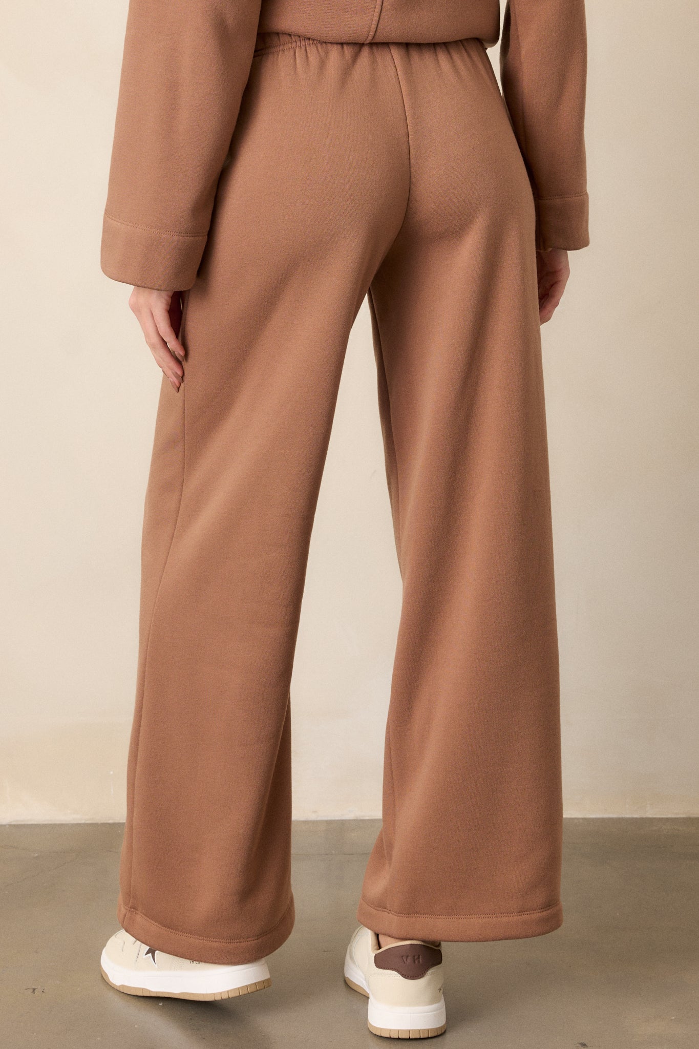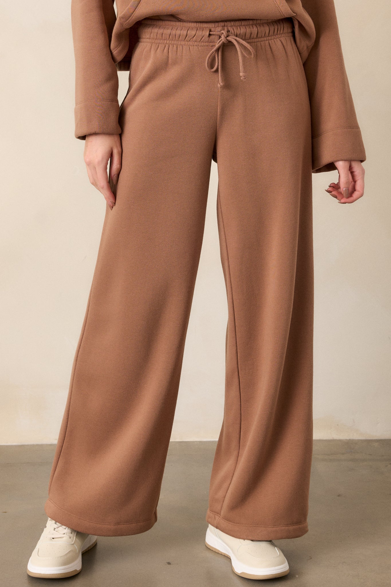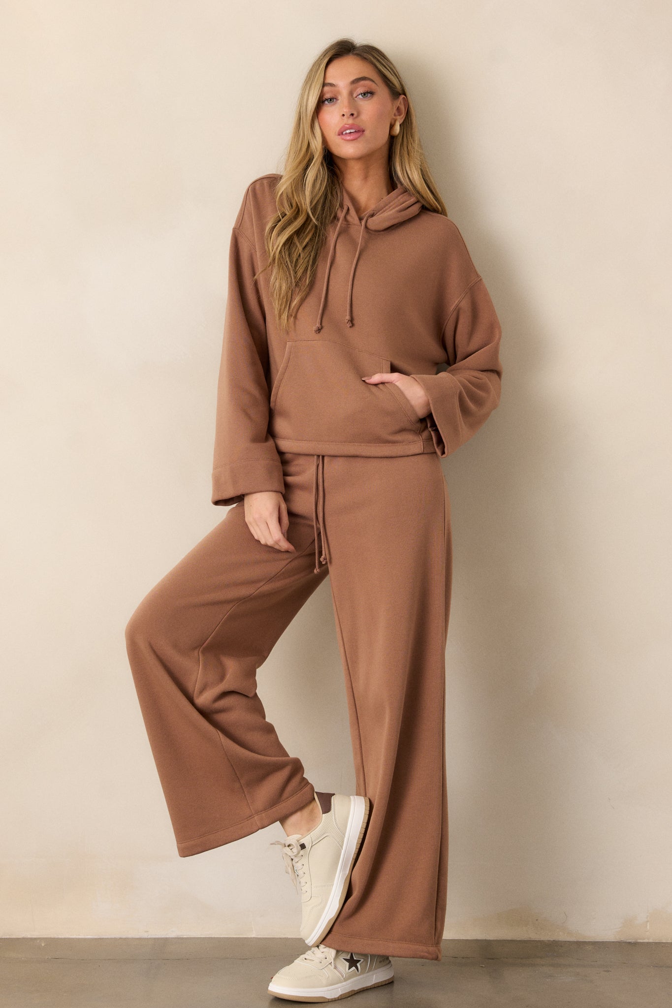 Elevate your loungewear game with our Z Supply Feeling The Moment Campfire Sweatpants. Made with soft, lightweight fabric for ultimate comfort. Perfect for cozy nights in or spontaneous campfire adventures. Embrace the moment in style. These campfire brown sweatpants feature an elastic waistband, an adjustable drawstring, and a wide leg fit.
