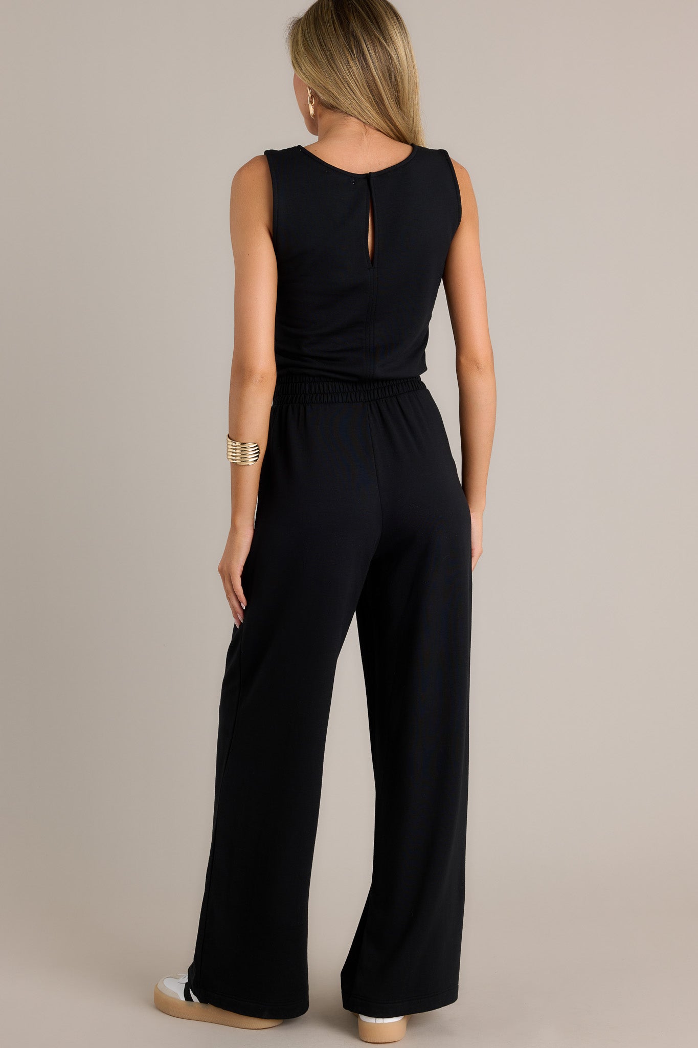 Get ready to lounge in style with the Z Supply Layover Modal Black Fleece Jumpsuit! Made with soft and cozy modal fleece, this jumpsuit is perfect for staying comfortable and chic. With a flattering silhouette and convenient pockets, you'll never want to take it off. This black jumpsuit features a scoop neckline, a thick elastic waistband, a self-tie drawstring, functional hip pockets, a wide leg, and a sleeveless design.