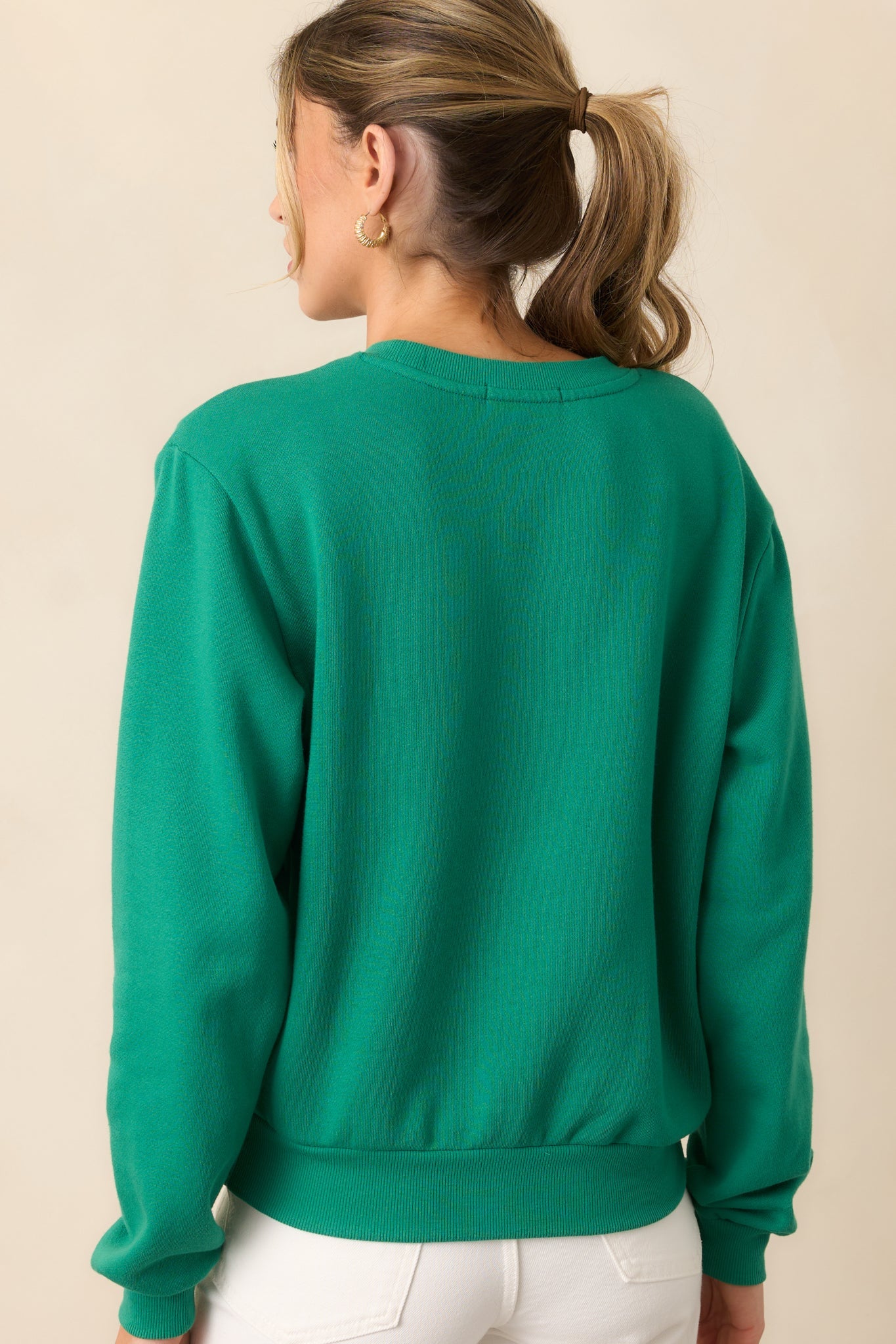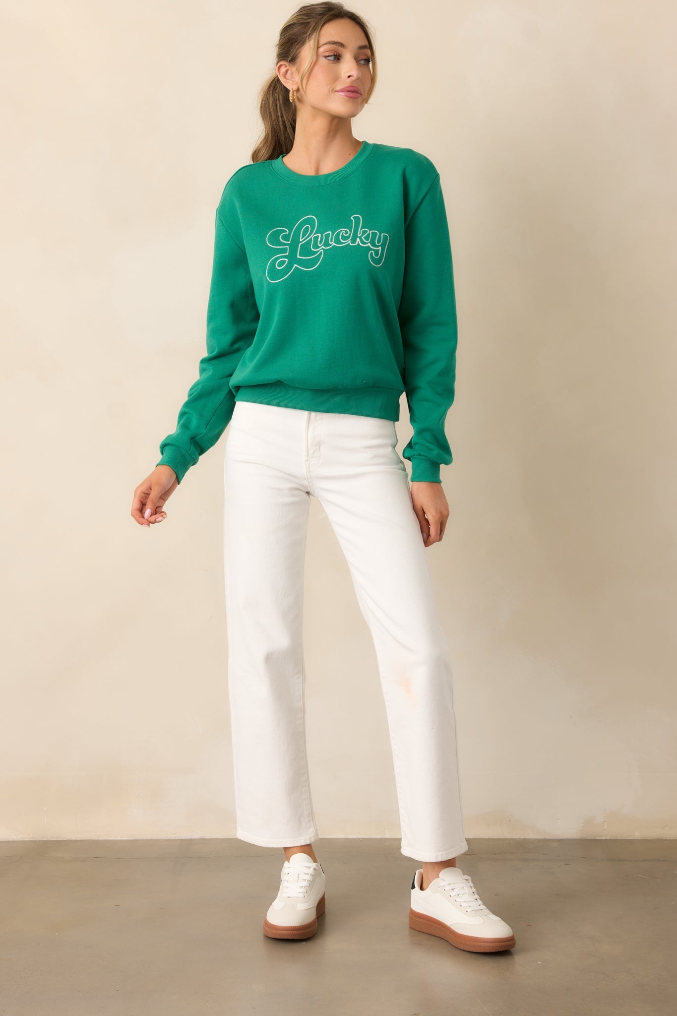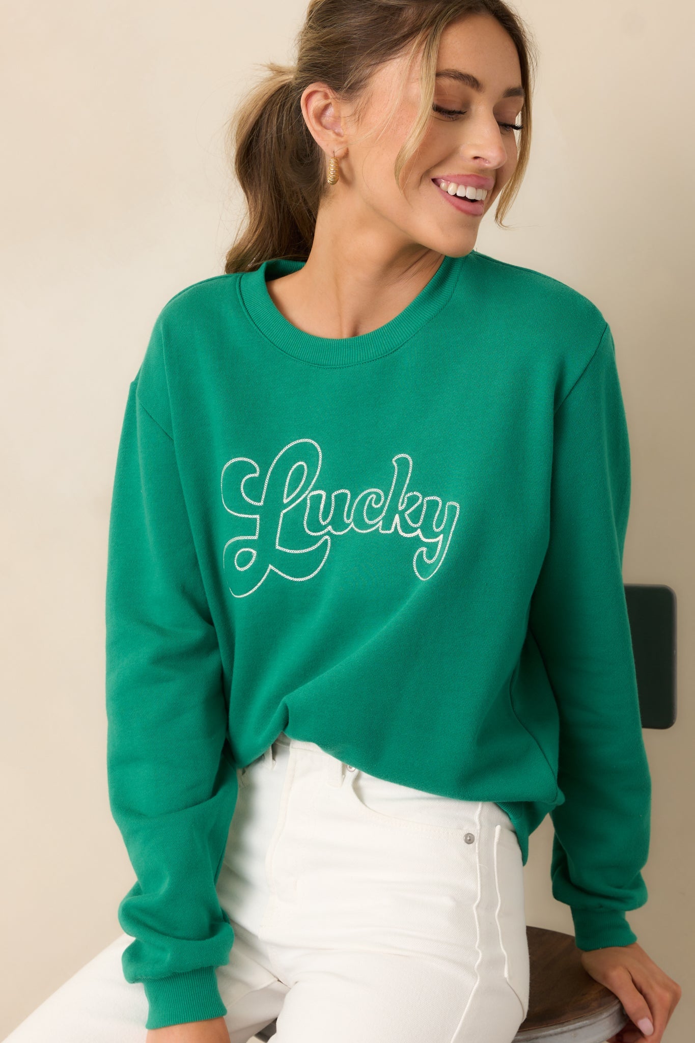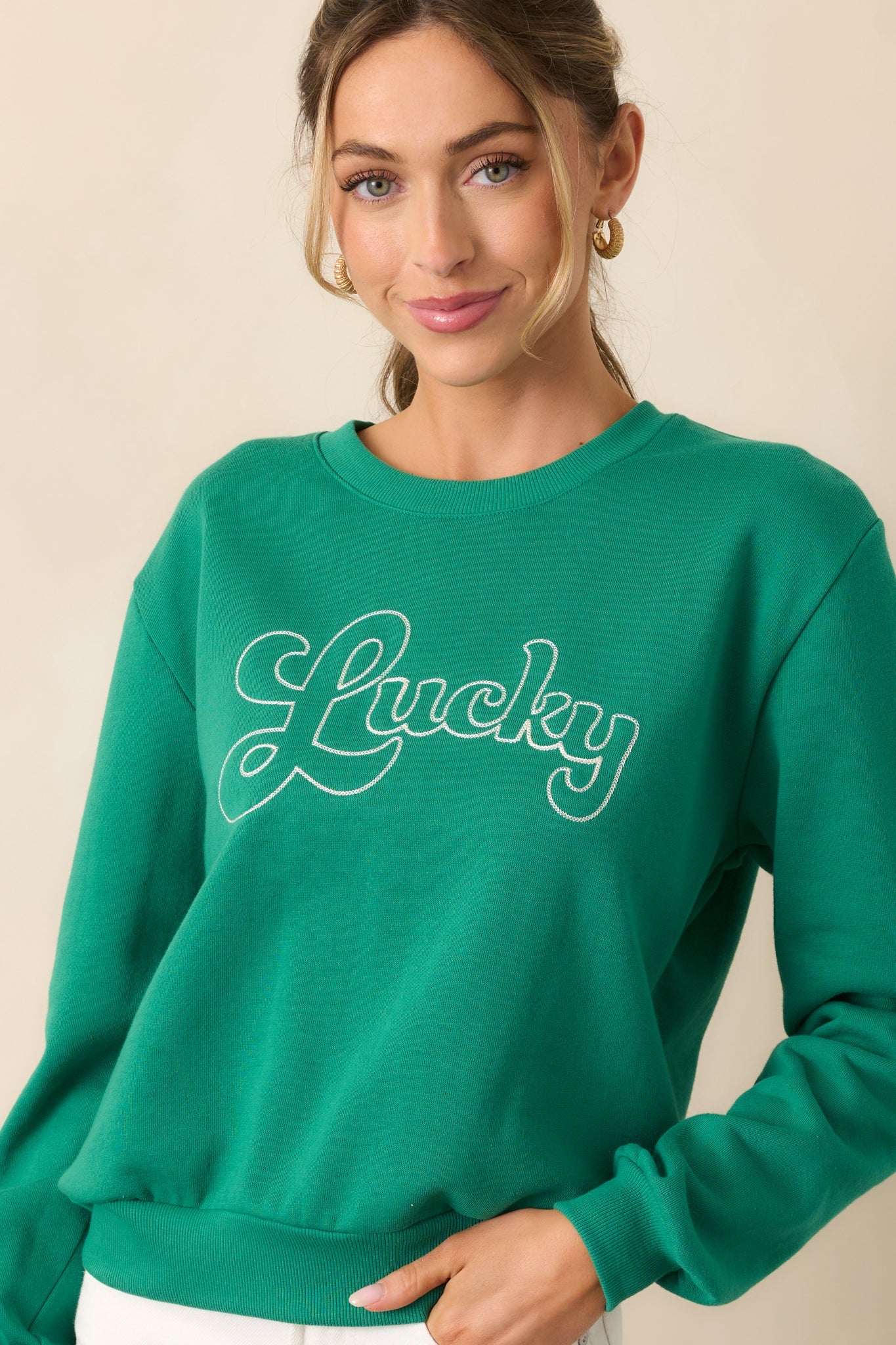 Stay comfortable and stylish with the Z Supply Lucky Green Sweatshirt. This sweatshirt is perfect for any casual occasion. With its cozy fit and vibrant green color, it's sure to become your go-to choice for both fashion and comfort. Get yours today and elevate your wardrobe game! This green sweatshirt features a rounded crew neckline, embroidered "lucky" design, ribbed bottom hem, and long sleeves with ribbed cuffs.