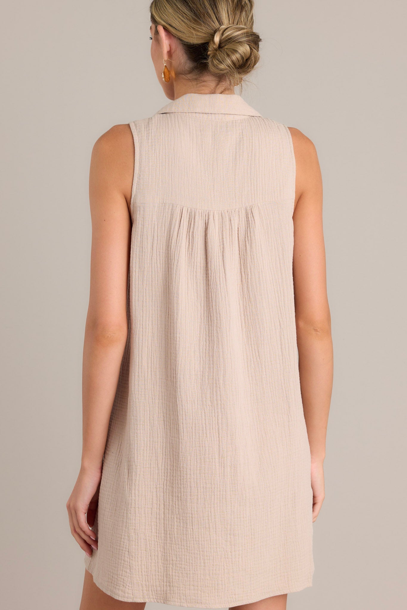 Unleash your inner fashionista with the Z Supply New Light Putty Gauze Mini Dress. Made with breathable gauze, this dress is perfect for staying cool on hot summer days. The playful mini length is perfect for showing off your legs, while the light putty color adds a touch of whimsy to your ensemble. Get ready to turn heads and have fun in this quirky dress! This taupe mini dress features a collared neckline, a functional button front, functional breast pockets, a lightweight material, and a sleeveless design.