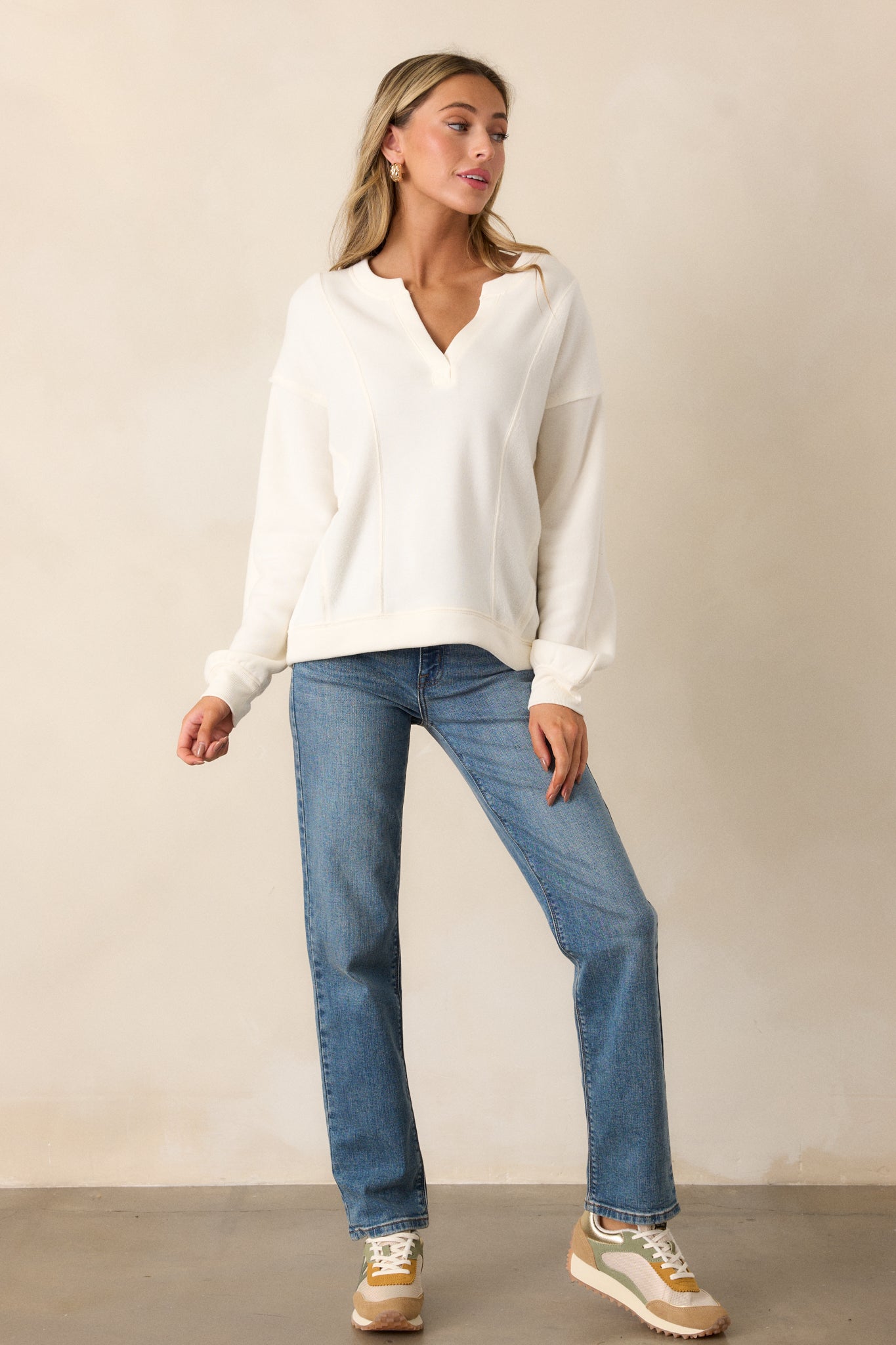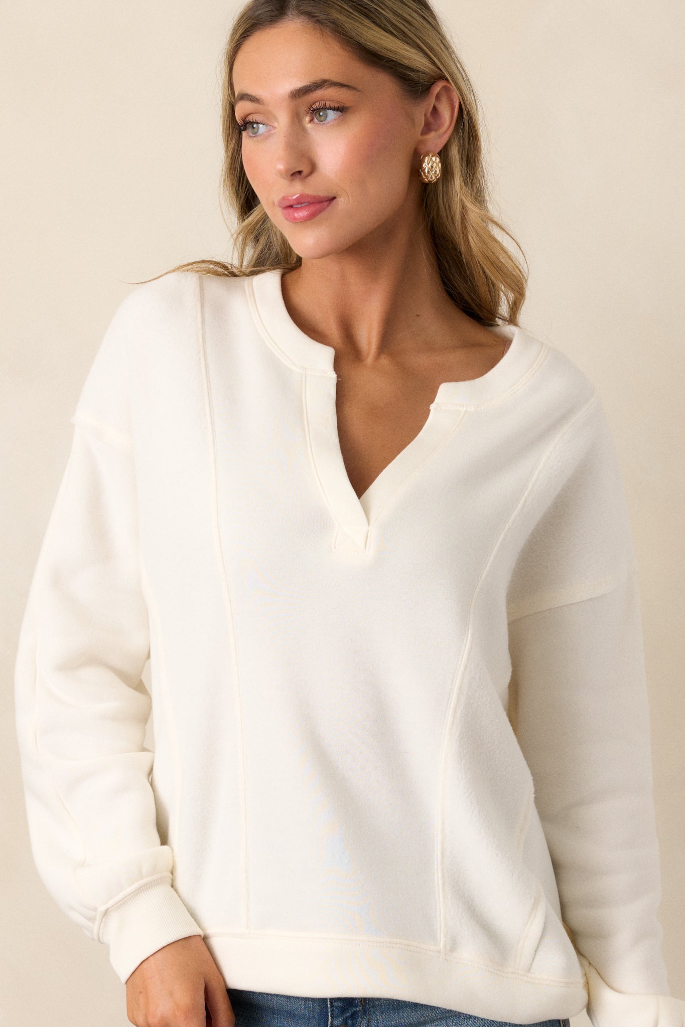Stay cozy and stylish in our Z Supply Out Of Towner Sea Salt Ivory Sweatshirt. Made with ultra-soft material, this sweatshirt is perfect for lounging or running errands. With its classic ivory color, it pairs effortlessly with any outfit. Stay comfortable and chic with this sweatshirt. This ivory sweatshirt features a split neckline, unique reverse paneling details, a relaxed fit, and long sleeves with ribbed cuffs.
