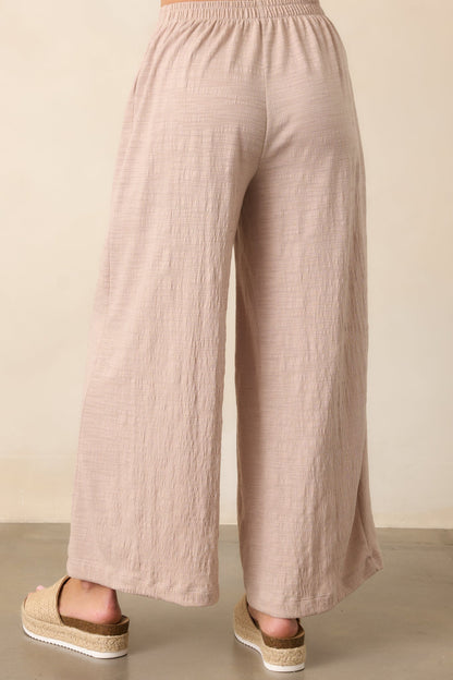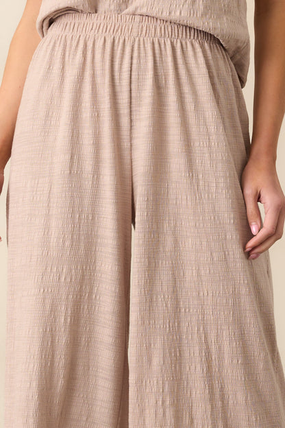 Experience effortless style with the Z Supply Parchment Taupe Scout Textured Slub Pants. These high-rise, wide-leg pants are crafted from textured slub knit fabric, offering a breezy yet chic look. With an elastic waistband and ankle-length design, they're perfect for easy, everyday wear—whether you're running errands or lounging at home. These taupe pants feature a textured fabric, elastic waist, and ankle length.