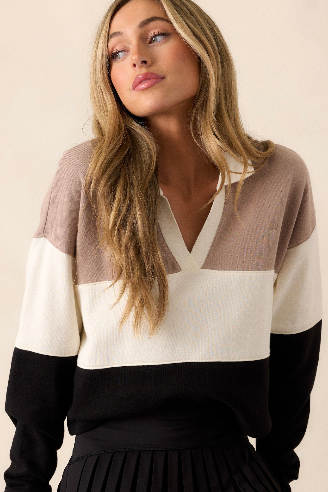 Introducing the Z Supply Player Black Collared Shirt. Stay stylish and comfortable in this collared active shirt, perfect for any on-the-go activity. Don't miss out on this trendy addition to your wardrobe! This top features a collared deep V-neck, brown, black & white color blocking, ribbed arm cuffs and soft fabric material.