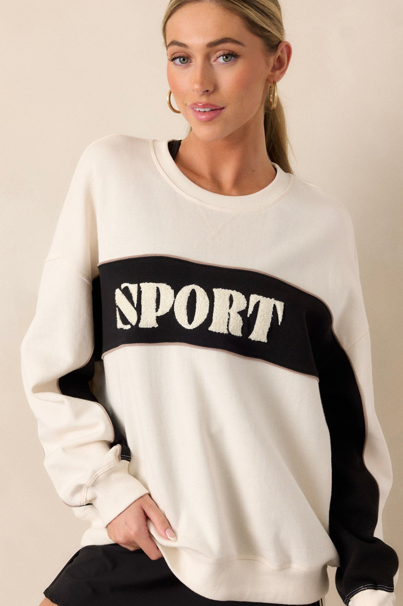 Elevate your workout game with the Z Supply Sandstone Sport Sweatshirt! The perfect blend of style and functionality, this sport sweatshirt is designed to provide maximum comfort and support during your most intense workouts. Stay motivated and push yourself to the limit in this must-have athletic essential. This ivory sweatshirt features a ribbed crew neck, high contrast black and white color blocking with terry cloth embroidered wording, long sleeves with a ribbed cuff sleeve, and a ribbed hemline on hip.