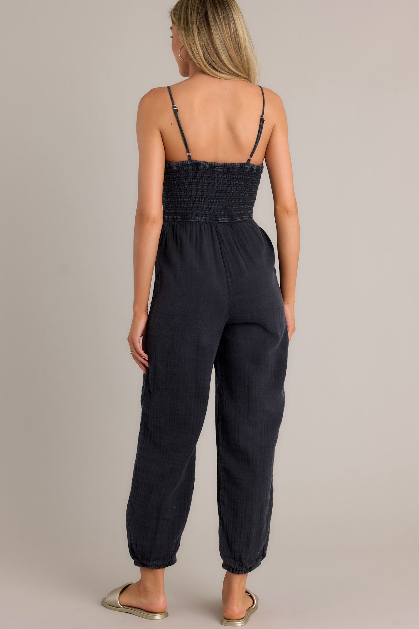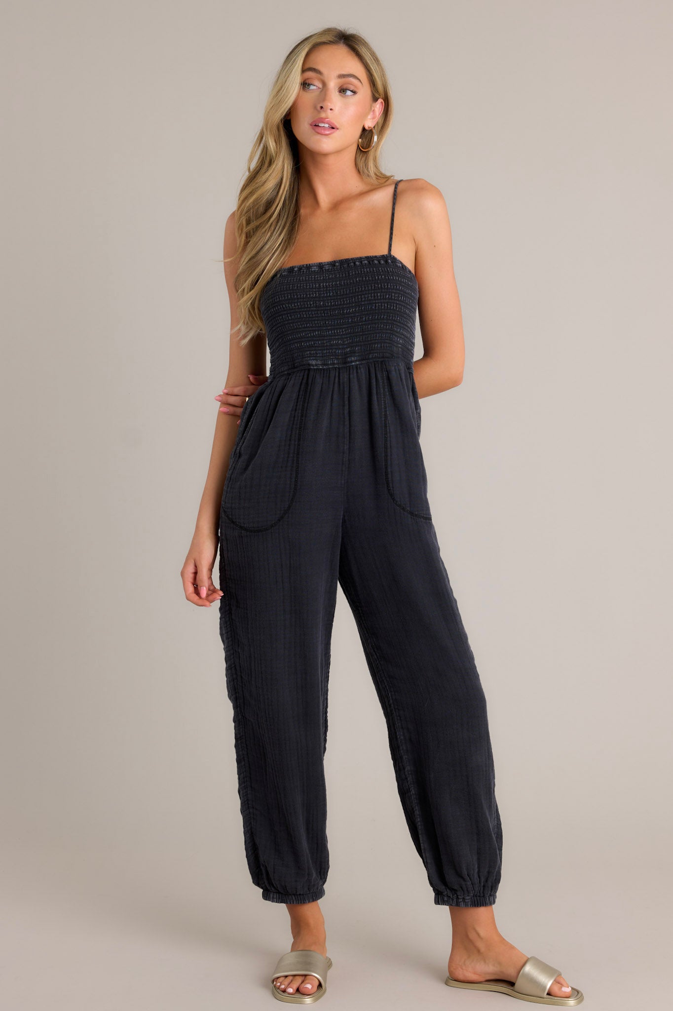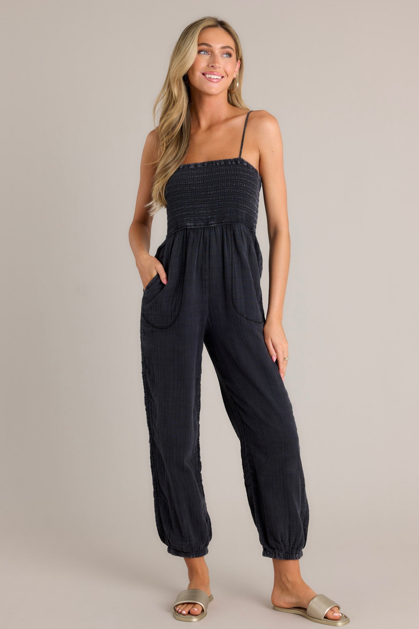 Introducing the Z Supply Santos Black Gauze Jumpsuit - the ultimate combination of comfort and style. Made with lightweight and breathable fabric, this jumpsuit is perfect for any occasion. Dress it up or down, it's versatile enough for all your adventures. Upgrade your wardrobe and embrace effortless chic! This black jumpsuit features a square neckline, thin adjustable straps, a fully smocked bodice, functional hip pockets, a wide leg design, and elastic cuffed ankles.