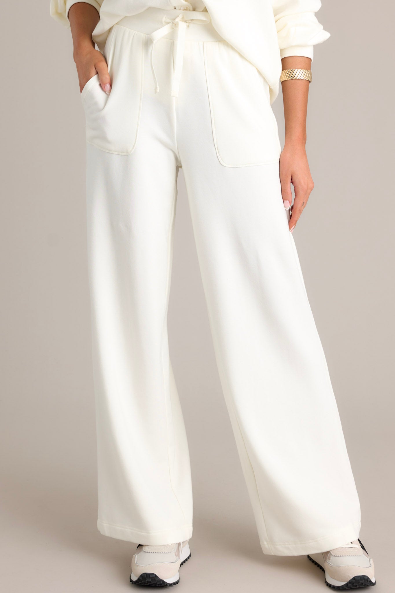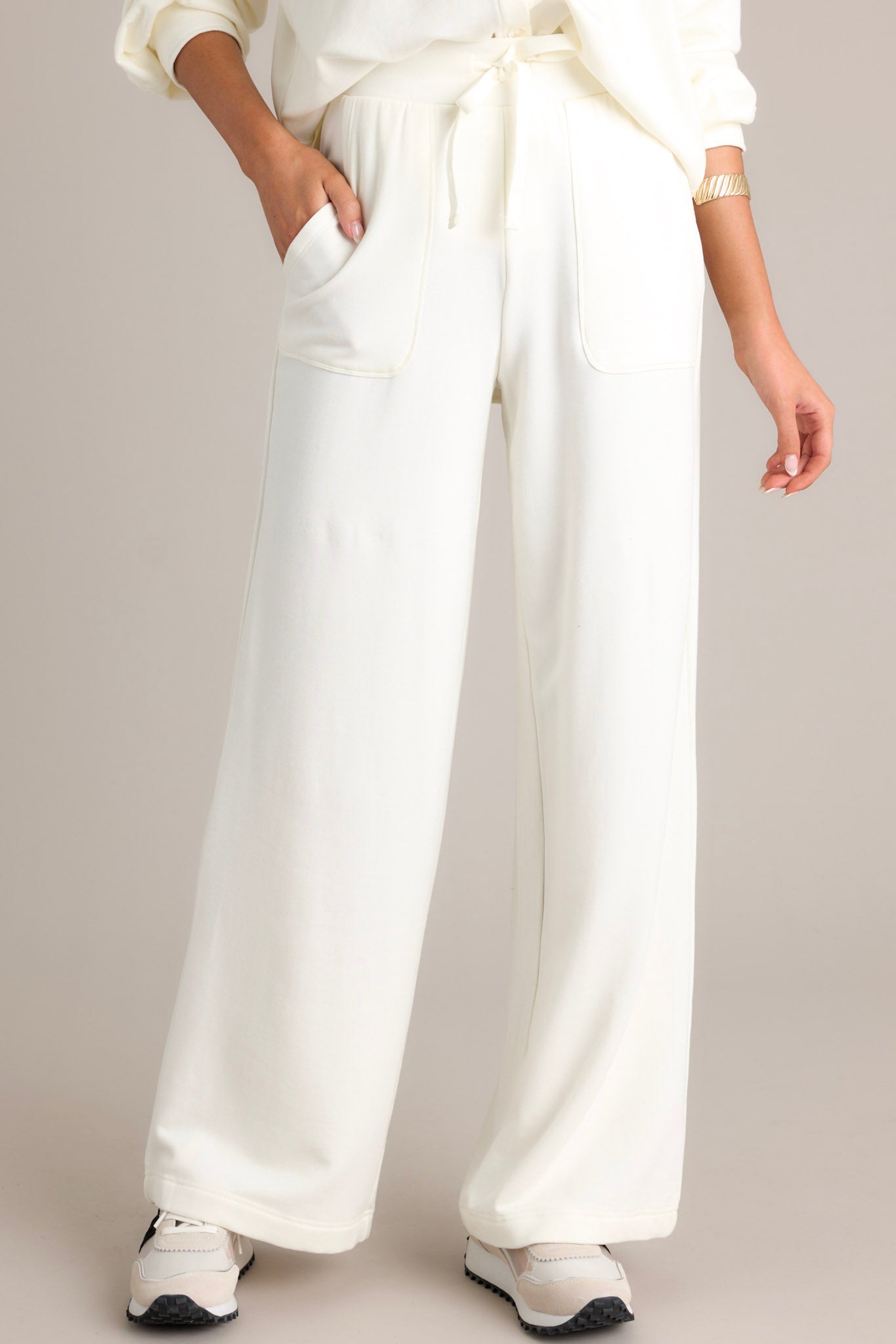Jump into comfort with Z Supply's Sea Salt White Layover Modal Fleece Pant. Made with soft modal fleece, these pants are perfect for lounging or running errands. With a relaxed fit and stylish design, you'll never want to take them off (seriously, we don't blame you). These white fleece pants feature a high waisted design, an elastic waist band with a self-tie drawstring, deep hip pockets, a soft fleece material and a straight leg.