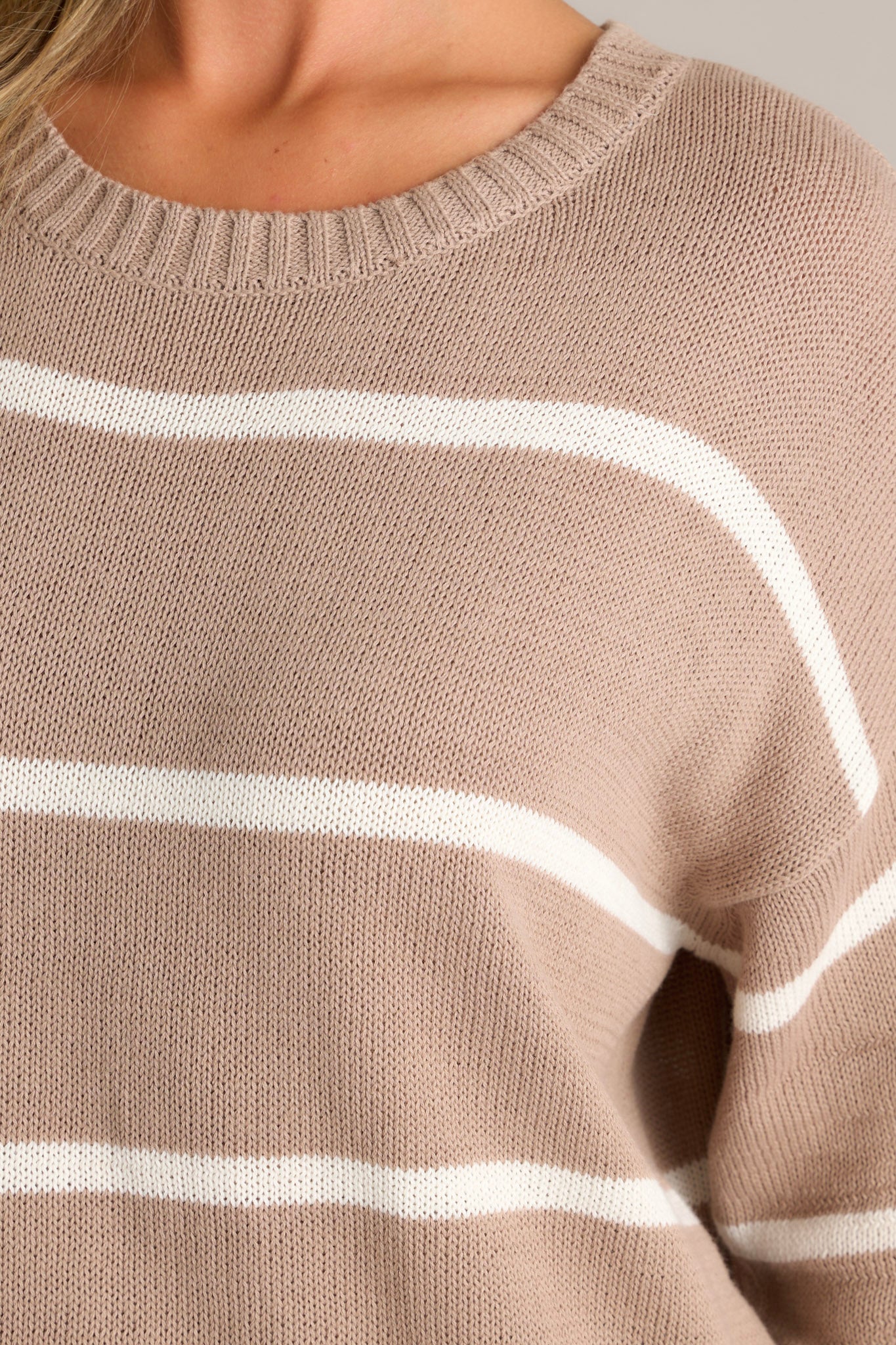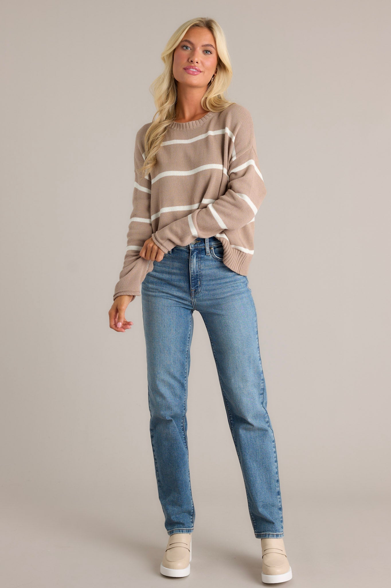 Conquer the day in the Z Supply Sienna Latte Stripe Sweater! With its bold stripes and soft fabric, this sweater is perfect for any adventure. Take a walk on the wild side and add some excitement to your wardrobe. Make a statement and dare to be different with this stylish piece! This latte tan stripe sweater features a round neckline, a stripe pattern, a soft knit fabric, ribbed hems, and long dolman sleeves.