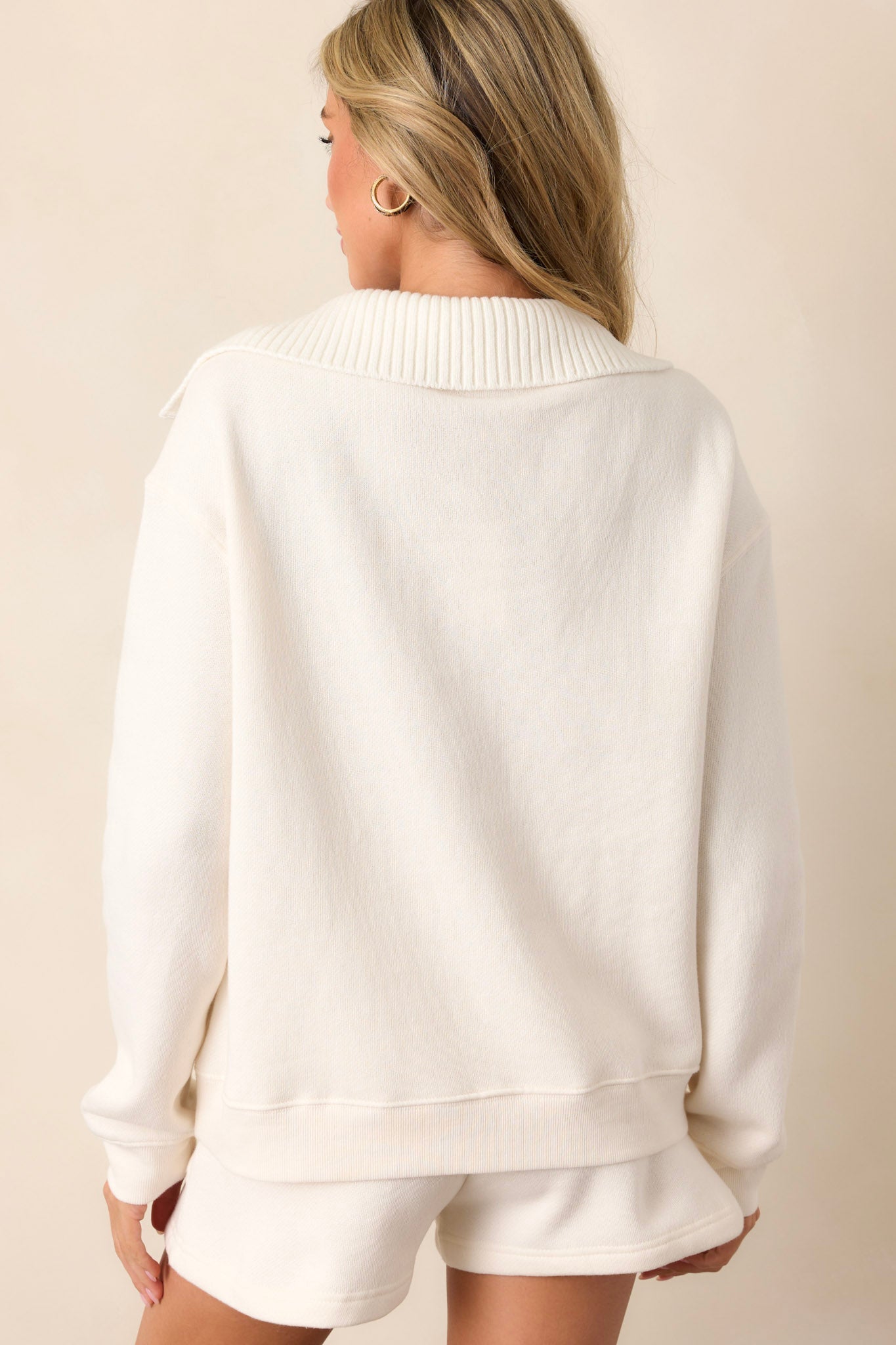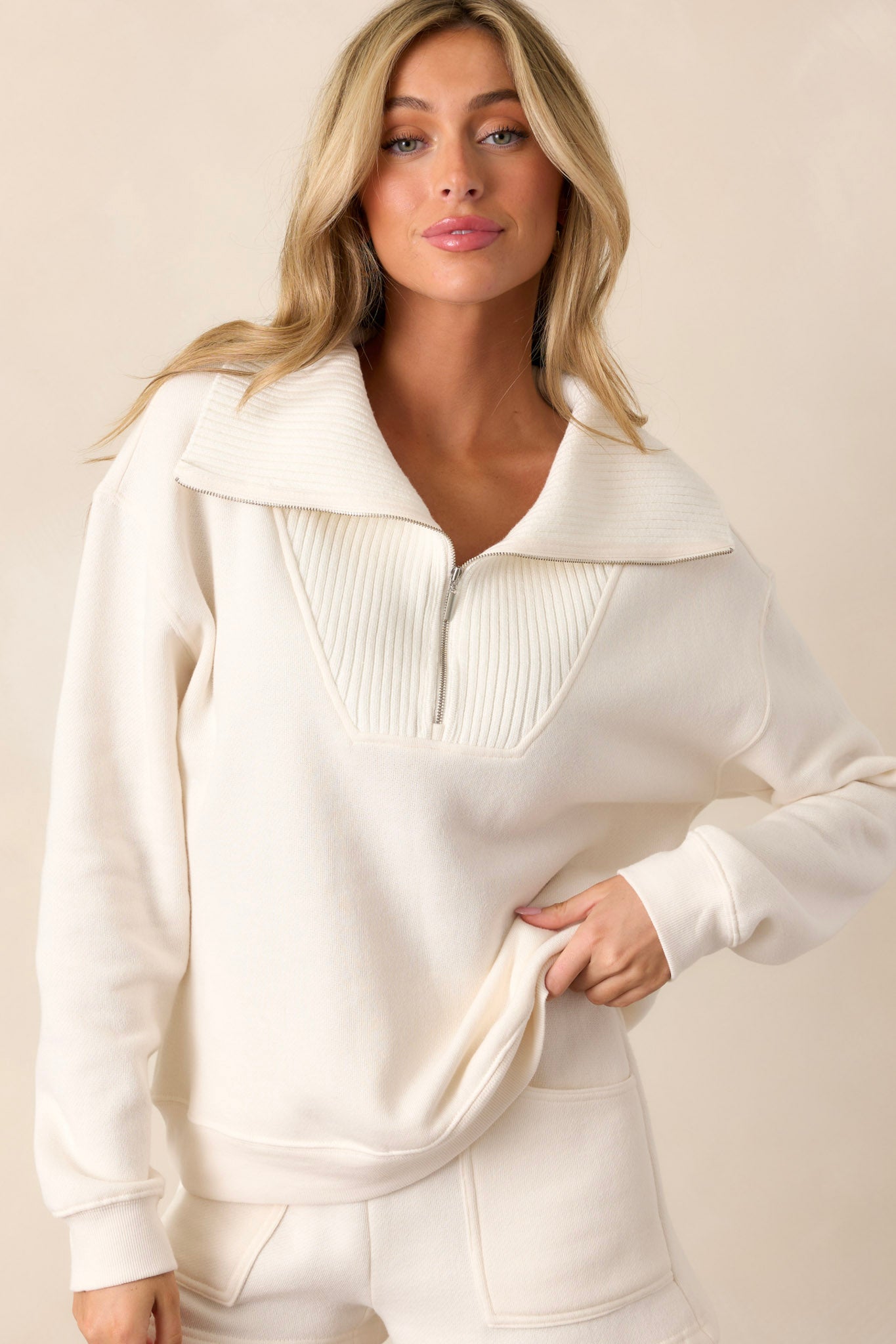 Stay cozy and stylish in the Z Supply Sonata Sea Salt Fleece Sweatshirt. Made with soft fleece material, this sweatshirt is perfect for cooler days. Its unique sea salt color adds a touch of chic to any outfit. So go ahead, embrace the warmth and comfort (and style) of this sweatshirt! This sweatshirt features a half zip design, a relaxed fit, a collared neckline, and long sleeves.