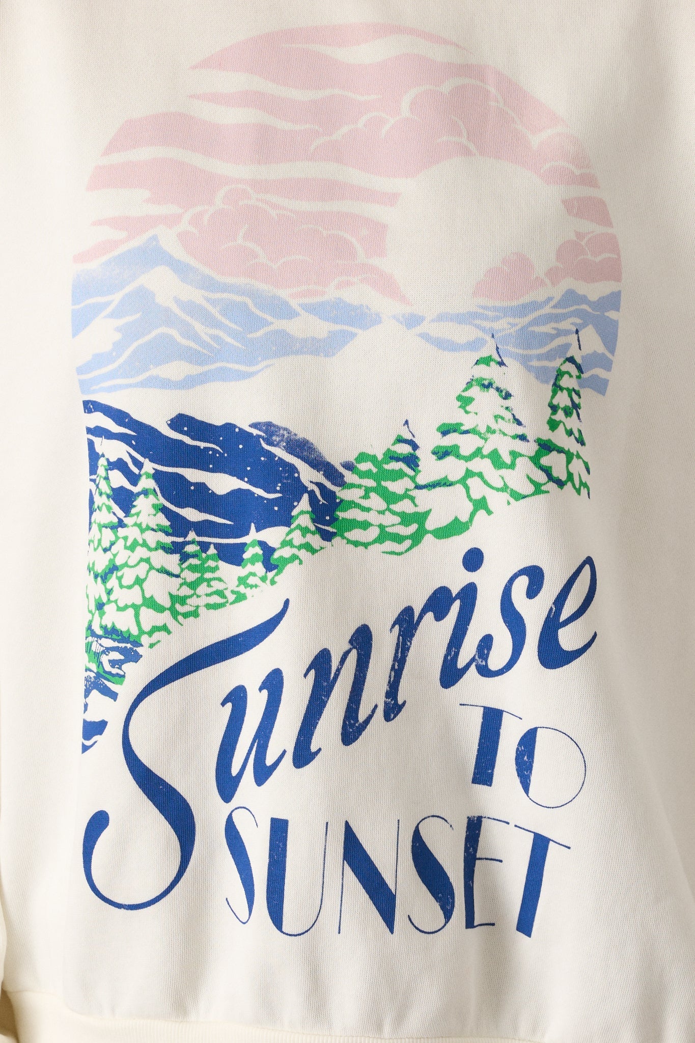 Elevate your casual style with the Z Supply Sunset Sea Salt Ivory Crewneck Sweatshirt. Featuring a unique graphic print, this sweatshirt is sure to make a statement. Made with high-quality 100% cotton, it offers both comfort and style. Perfect for any casual occasion, this sweatshirt will become a staple in your wardrobe! This ivory sweatshirt features a crew neckline, an oversized fit, 100% cotton brushed fleece fabric, a "Sunrise to Sunset" snow-covered mountain landscape graphic.