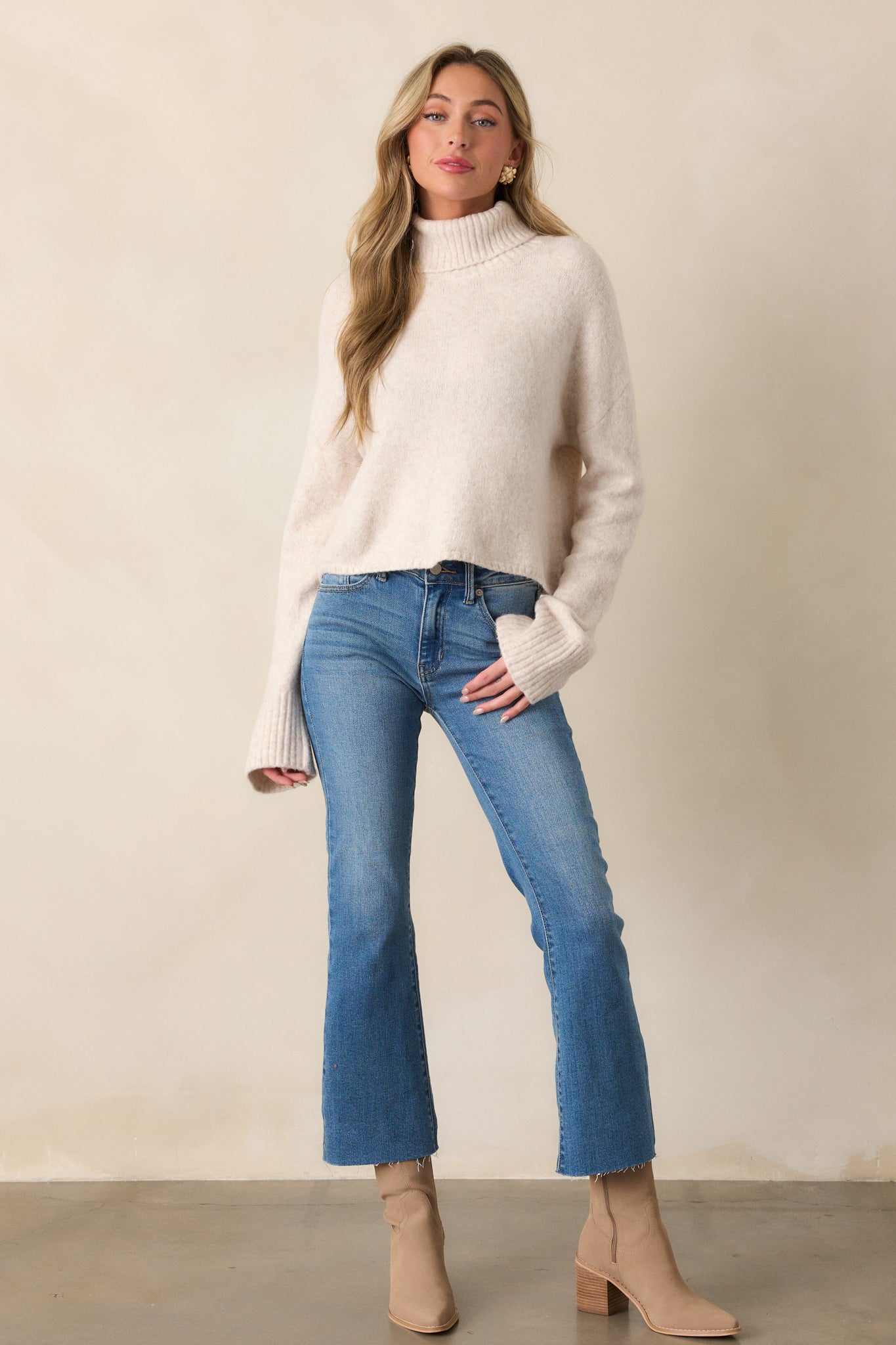 Stay cozy and stylish this season with the Z Supply Ursa Light Oatmeal Heather Turtleneck Sweater Top. Made with soft, lightweight fabric, this top features a turtleneck design for extra warmth and comfort. Perfect for pairing with your favorite jeans or leggings for a trendy yet comfortable look. This light oatmeal sweater features a ribbed turtleneck, a relaxed fit, ribbed bottom hem detailing, and long sleeves with thick ribbed cuffs.