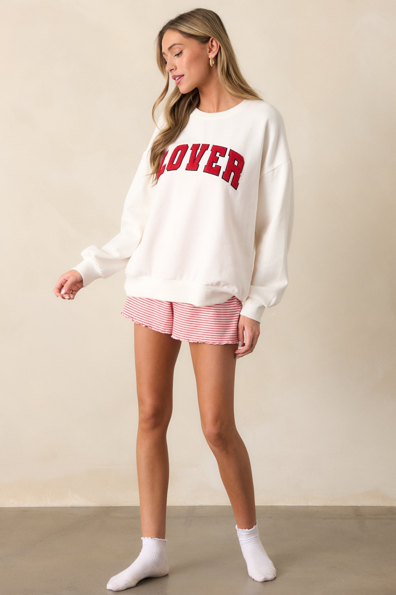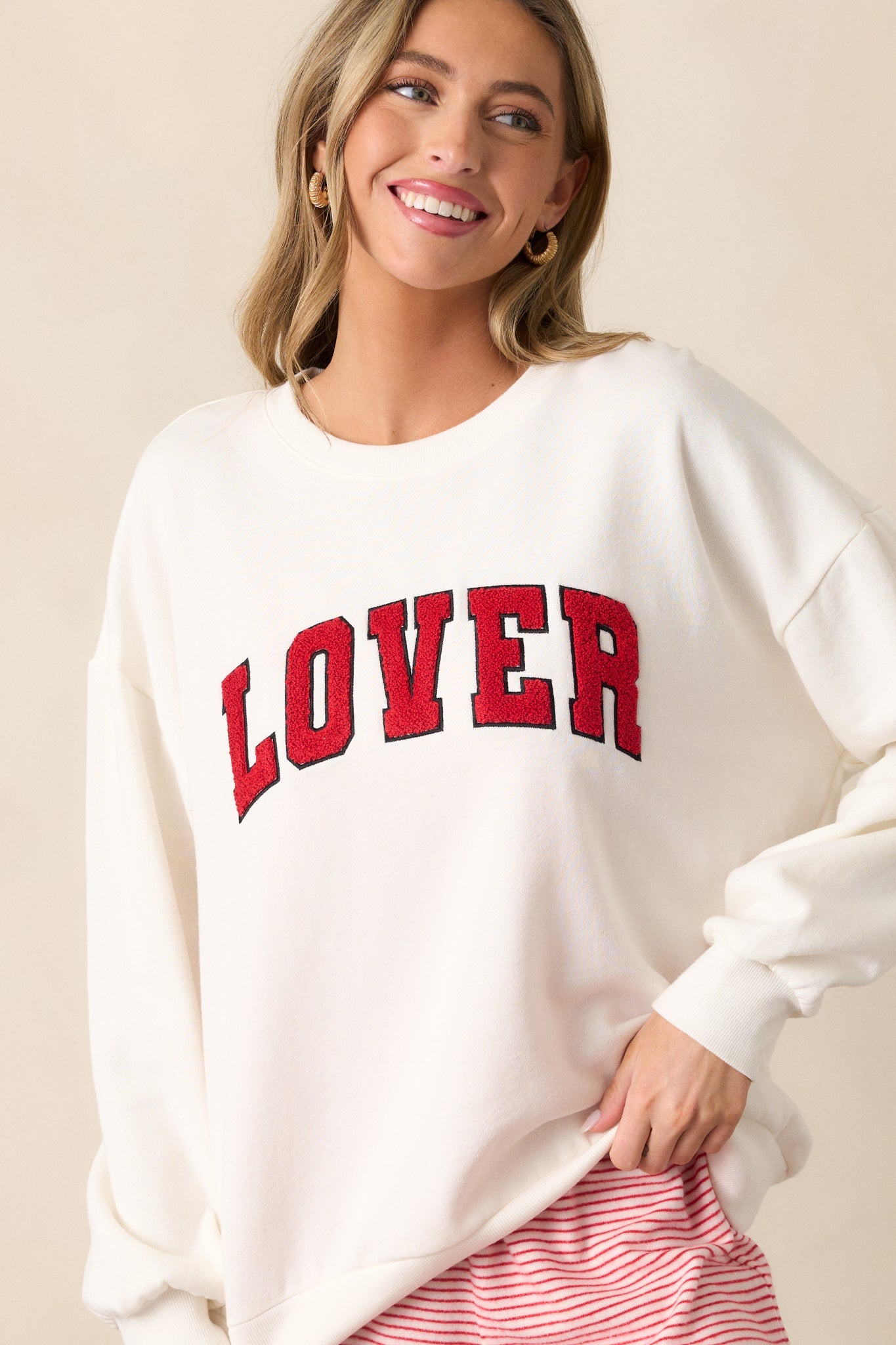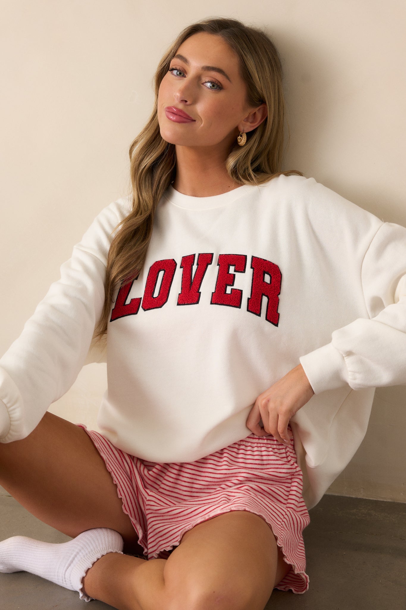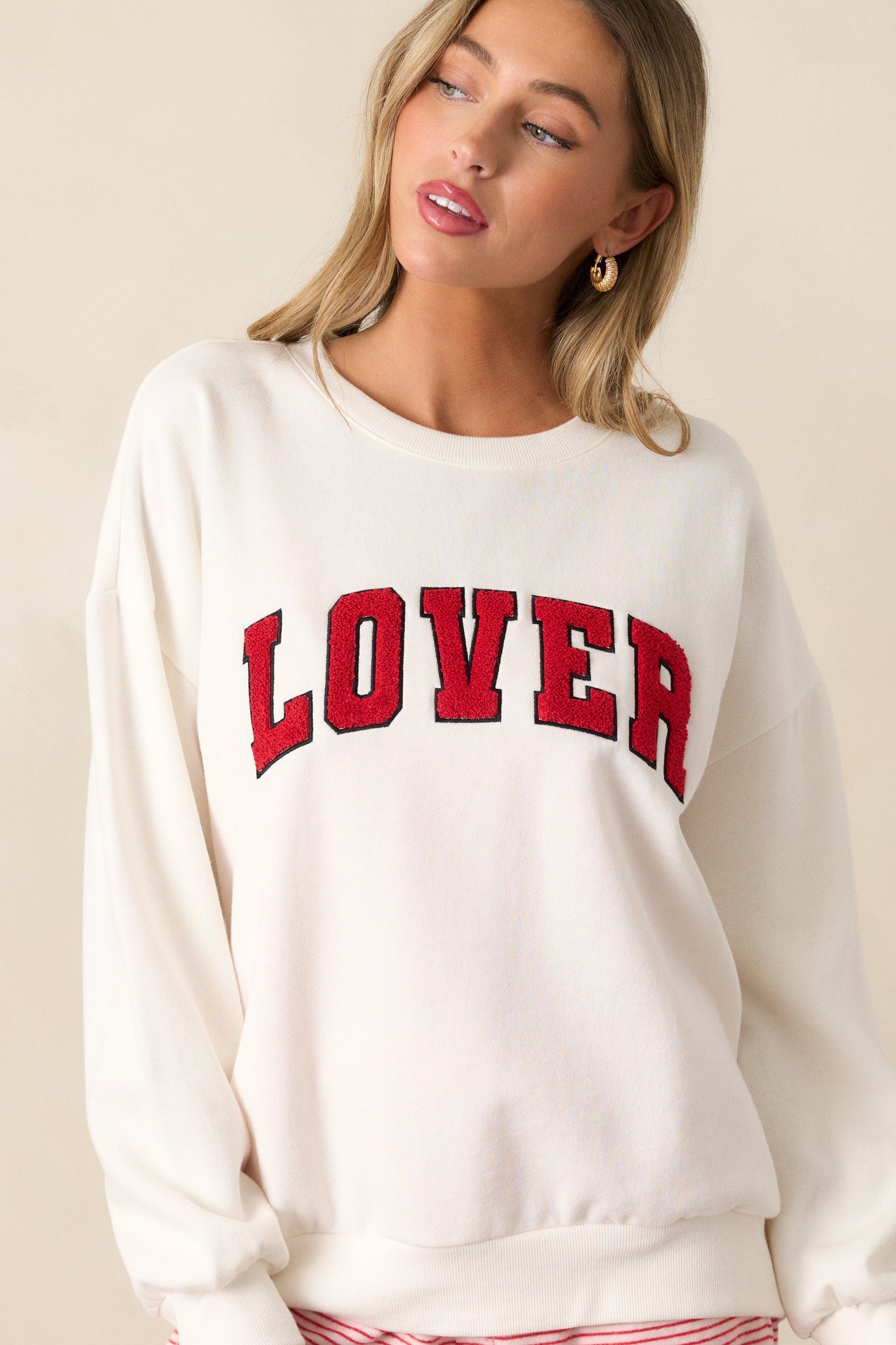 Indulge in ultimate comfort and style with our Z Supply Vanilla Ice Ivory Oversized Lover Sweatshirt. This ultra-soft and oversized sweatshirt is perfect for cozy nights in or running errands. With a relaxed fit and vanilla ice color, you'll feel like you're wearing a warm hug. Upgrade your loungewear game now! This ivory sweatshirt features a crew neckline, relaxed fit, textured "LOVER" script, and long sleeves with ribbed cuffs.